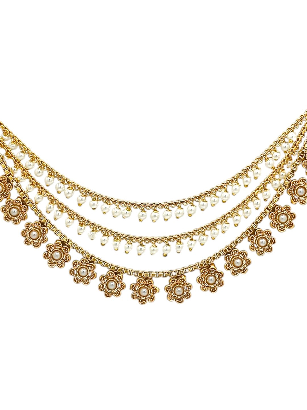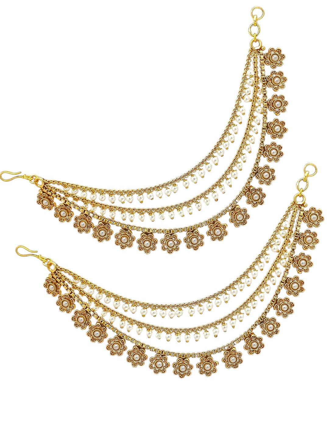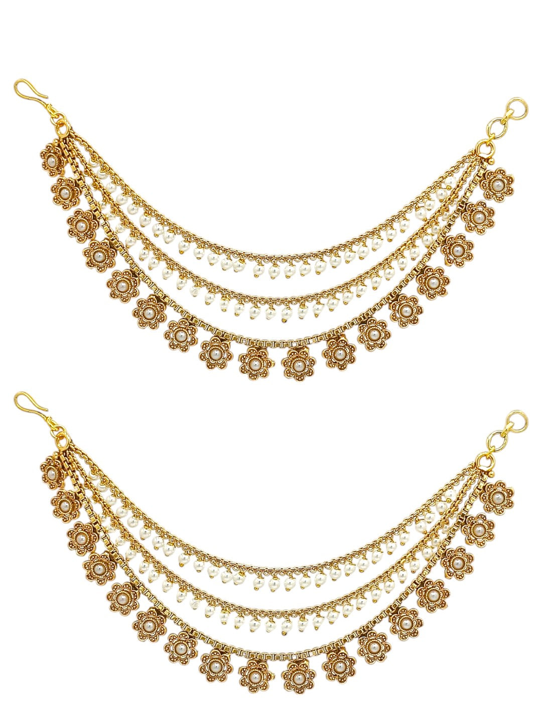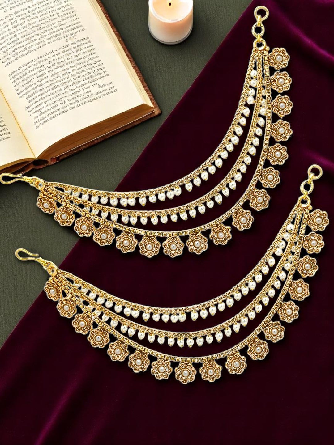 Gold Toned 3 Layered Earchain With Hanging White Beads And Floral Motif. Secured With S-Hook Closure.