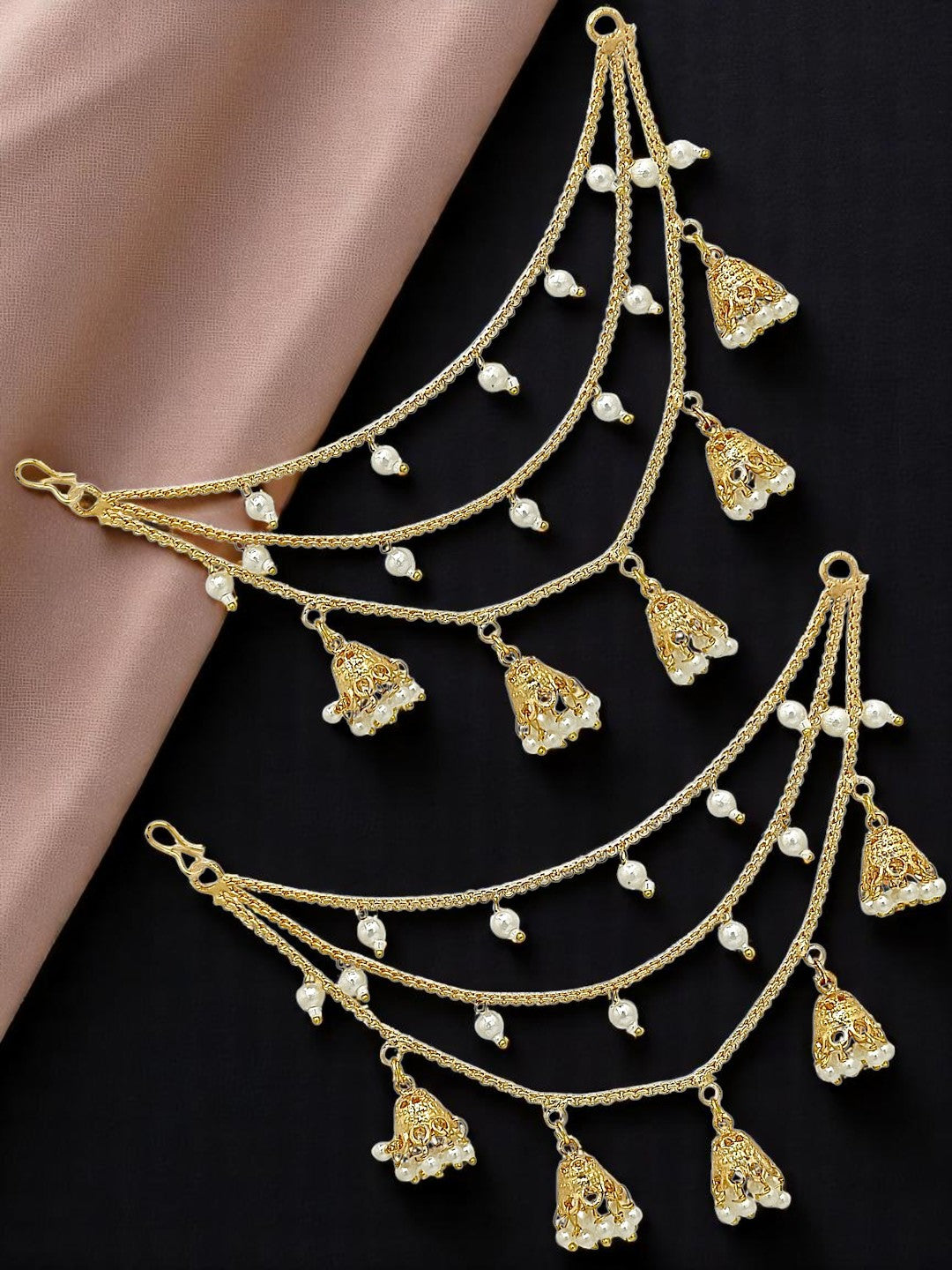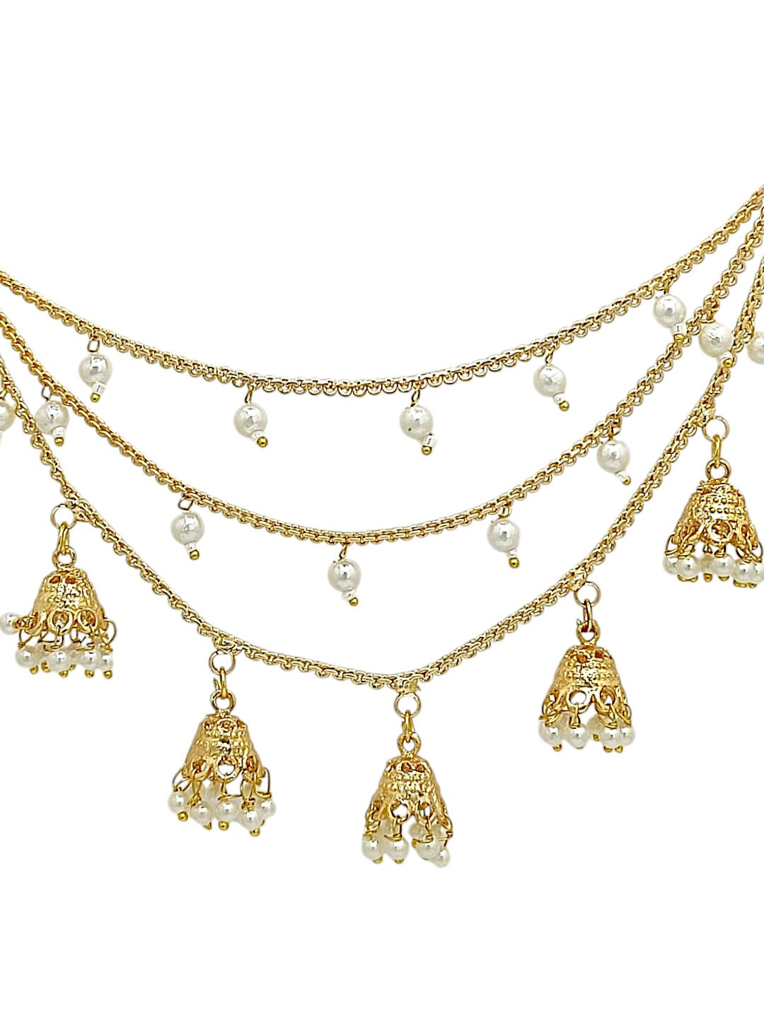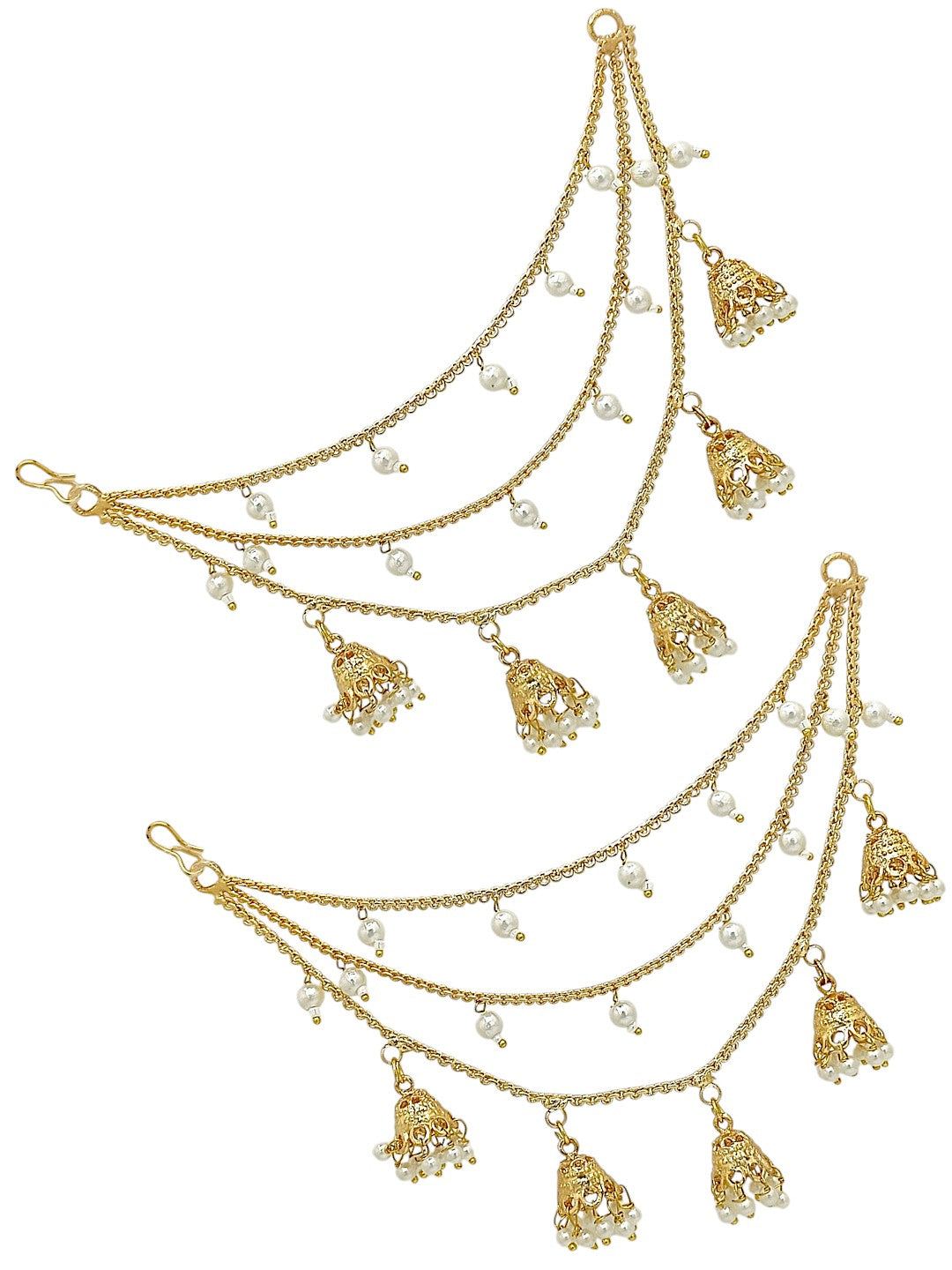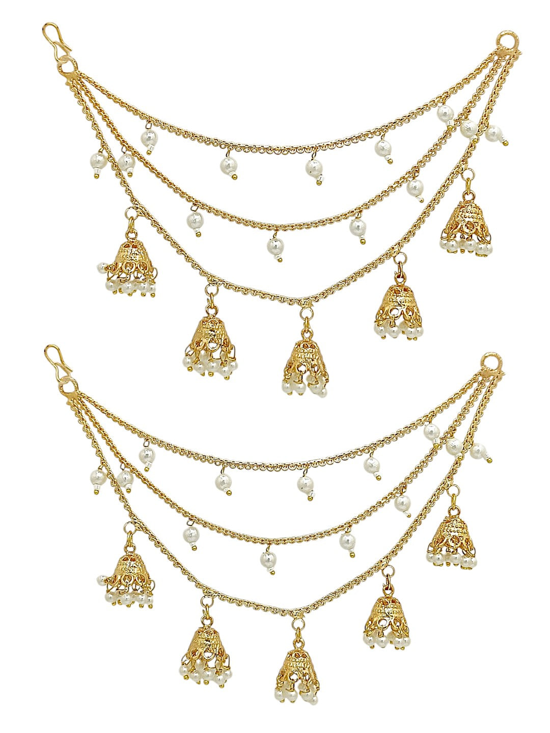 Gold Toned 3 Layered Earchain With Hanging Jhumki And White Beads. Secured With S-Hook Closure.