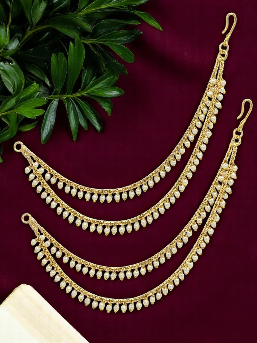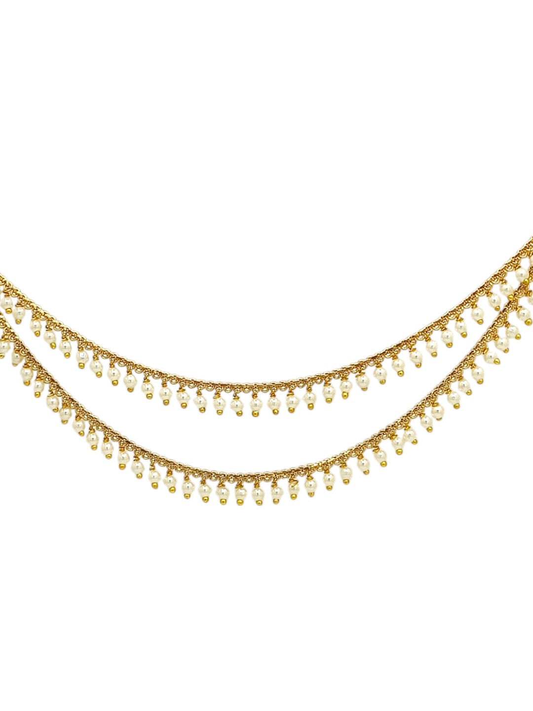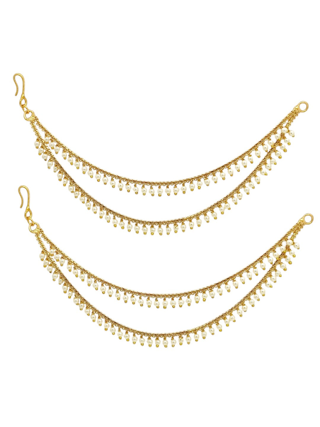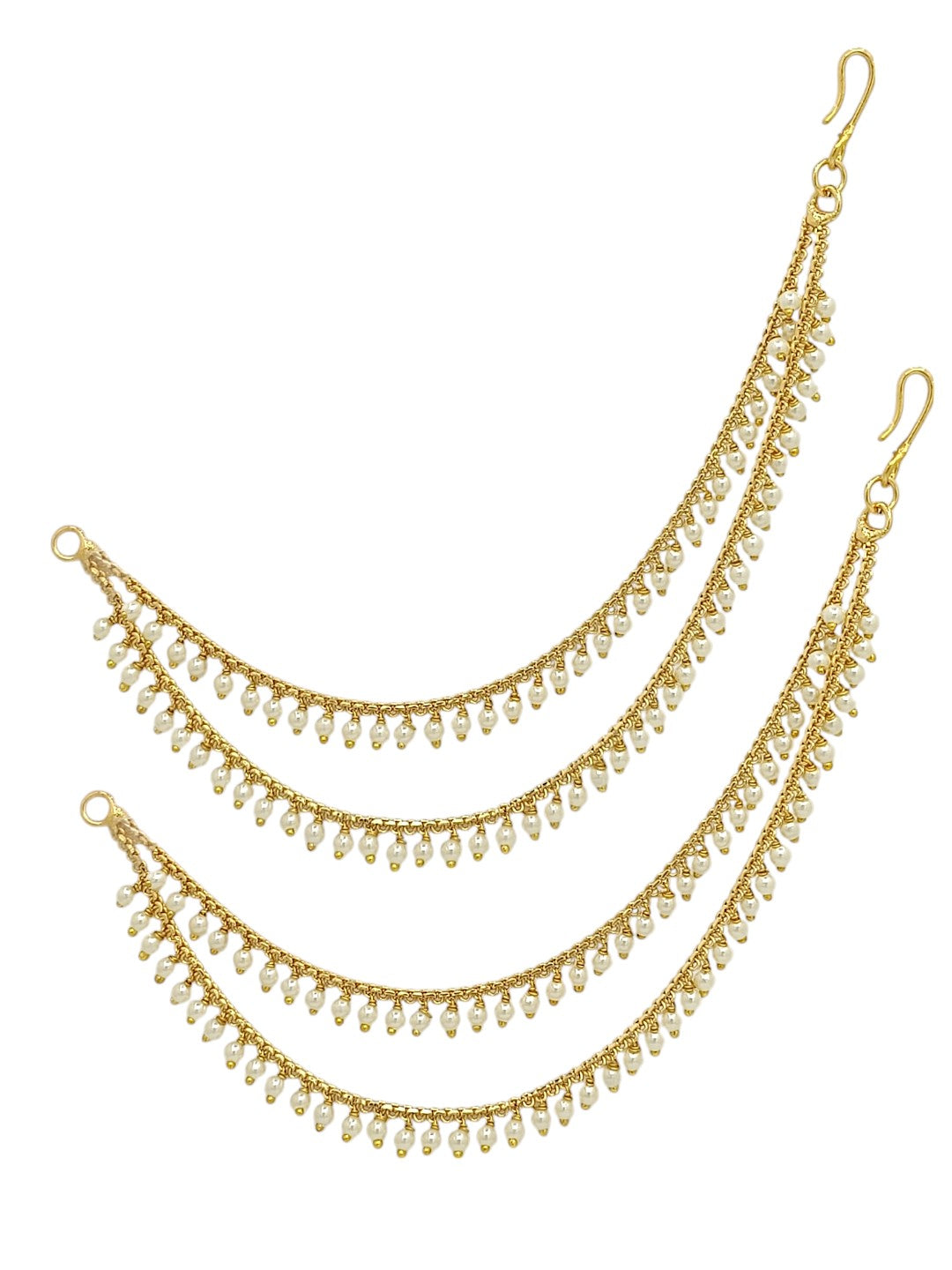 Gold Toned 2 Layered Earchain With Hanging White Beads. Secured With S-Hook Closure.