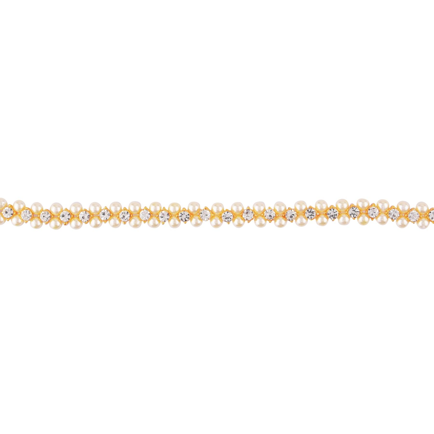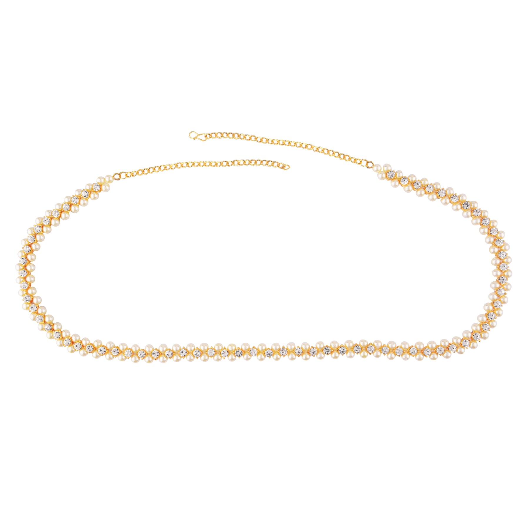 Crafted With Meticulous Precision, This Kamarbandh Waist Chain Features A Gold-Plated Base That Radiates A Luxurious Glow, Adding A Touch Of Opulence To Your Waistline. The Smooth And Polished Surface Enhances Its Overall Allure, Making It A Stunning Focal Point Of Your Ensemble. Adorned With A Carefully Curated Combination Of Pearls And Cz Stones, This Waist Chain Showcases A Captivating Play Of Light And Color. The Pearls, Chosen For Their Iridescent Beauty, Lend A Classic Elegance, While The Cz Stones Bring A Dazzling Brilliance That Catches The Eye From Every Angle.