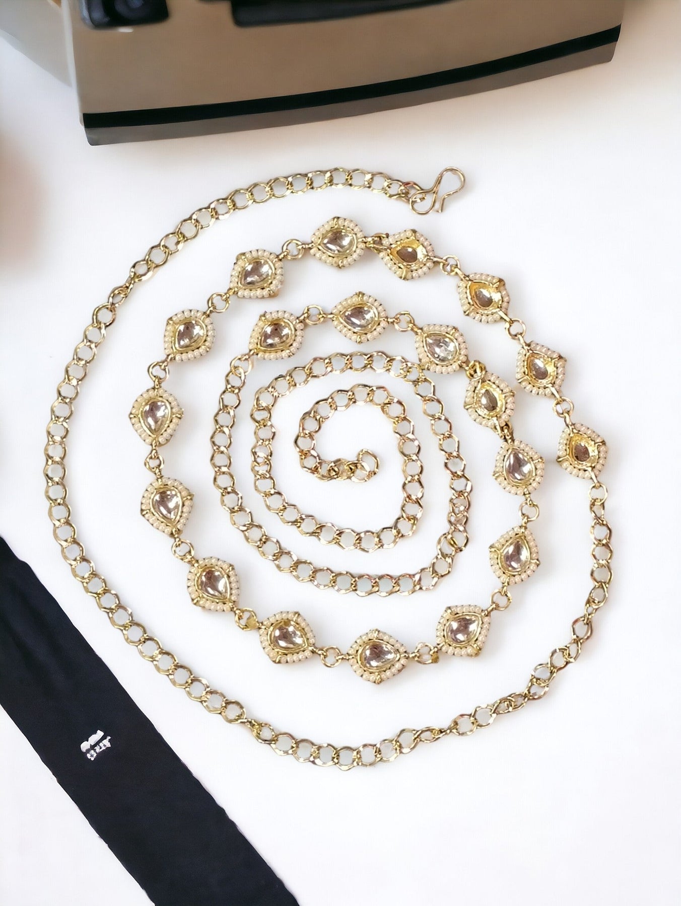 A Kundan Beads Waist Chain Is A Delicate And Stunning Piece Of Jewelry Designed To Adorn The Waist Elegantly. Handcrafted With Drop Shaped Kundan And Beads, Which Are Traditional Indian Gemstones Made Of Glass Backed By Foil For Enhanced Radiance. It Also Incorporates Other Embellishments Such As White Beads, Adding To Their Beauty And Allure.Kundan Beads Waist Chains Are Often Worn On Special Occasions Such As Weddings, Festivals, Or Cultural Events, And Can Be Paired With Traditional Indian Attire Such As Sarees, Lehengas, Or Salwar Suit