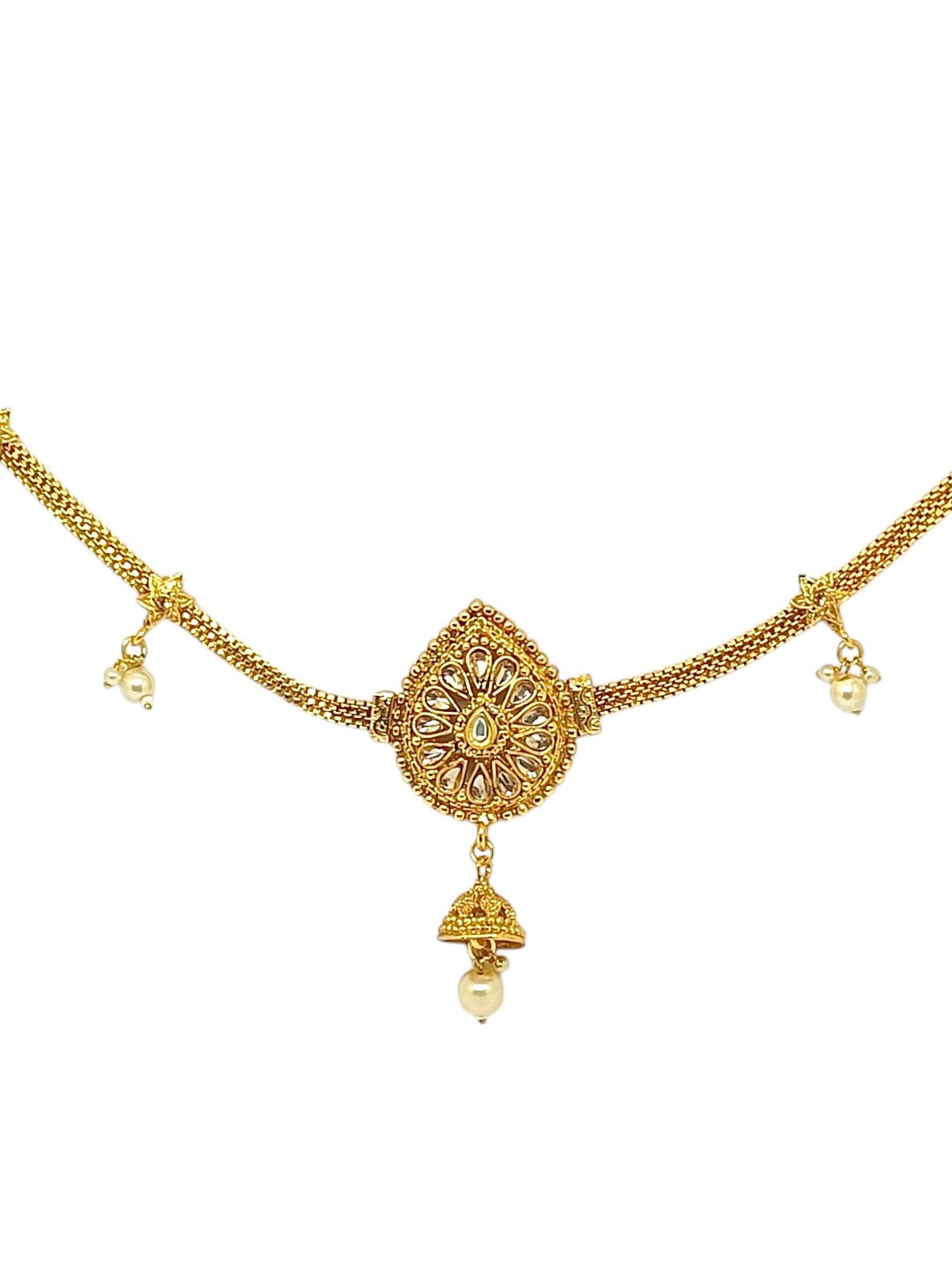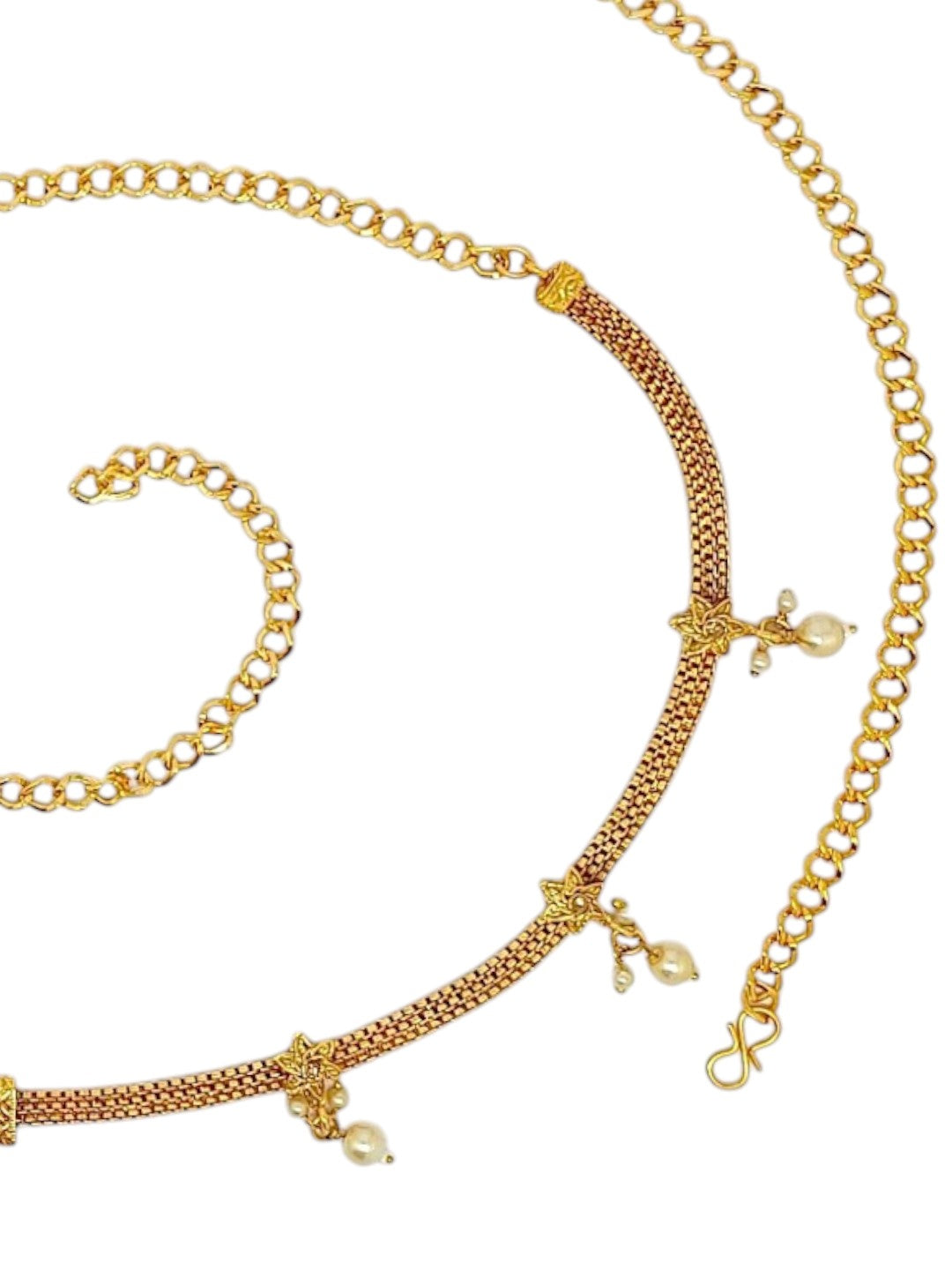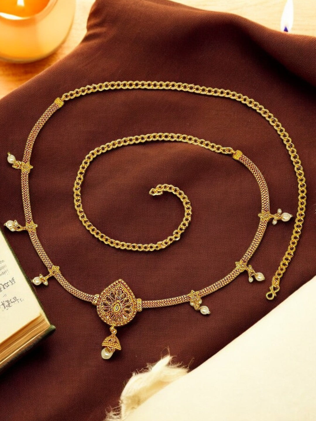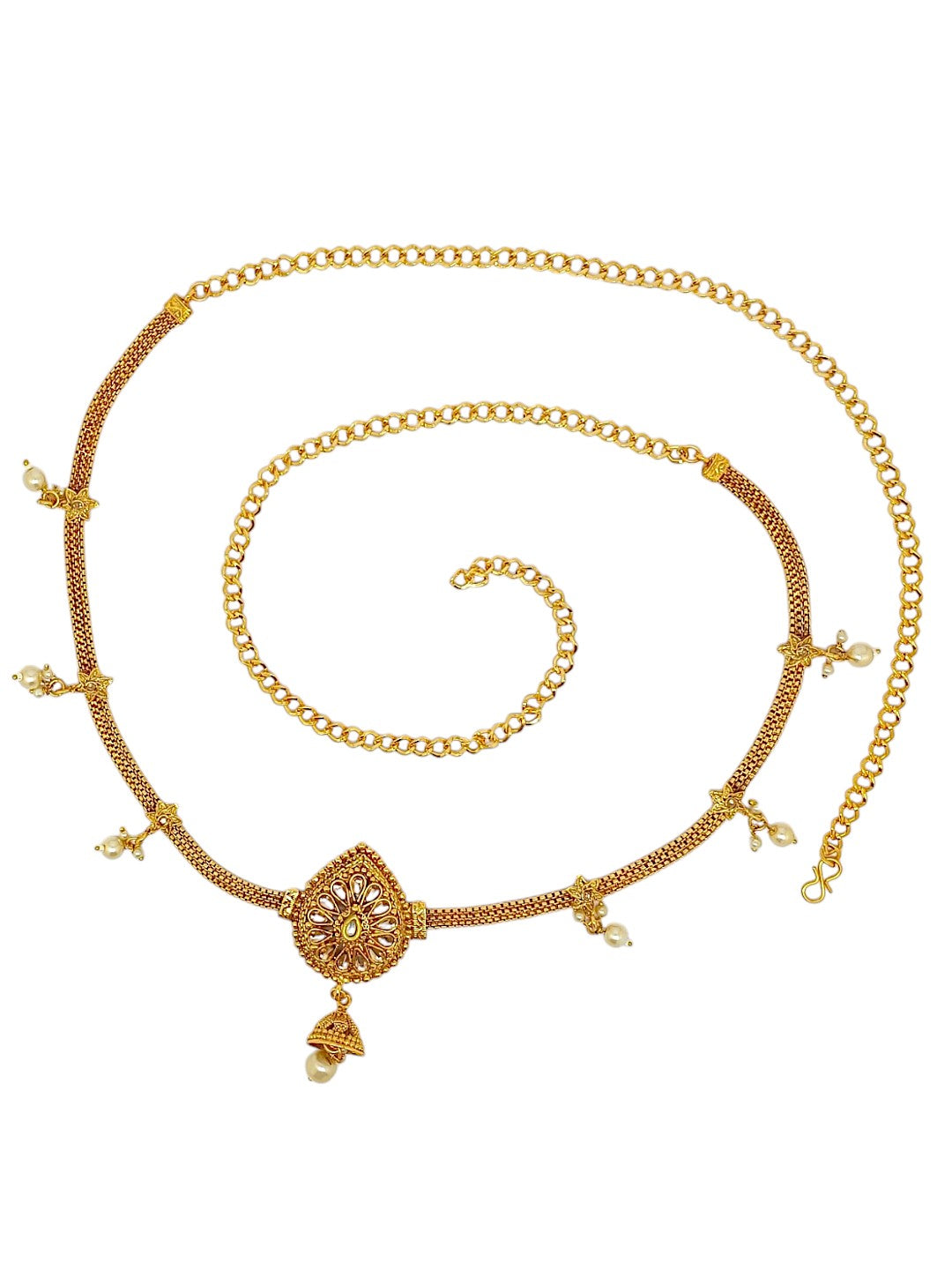 Gold-Toned Teardrop Shape Waist Chain Studded With Artificial Kundan And Beads. Secured With S-Hook Closure.