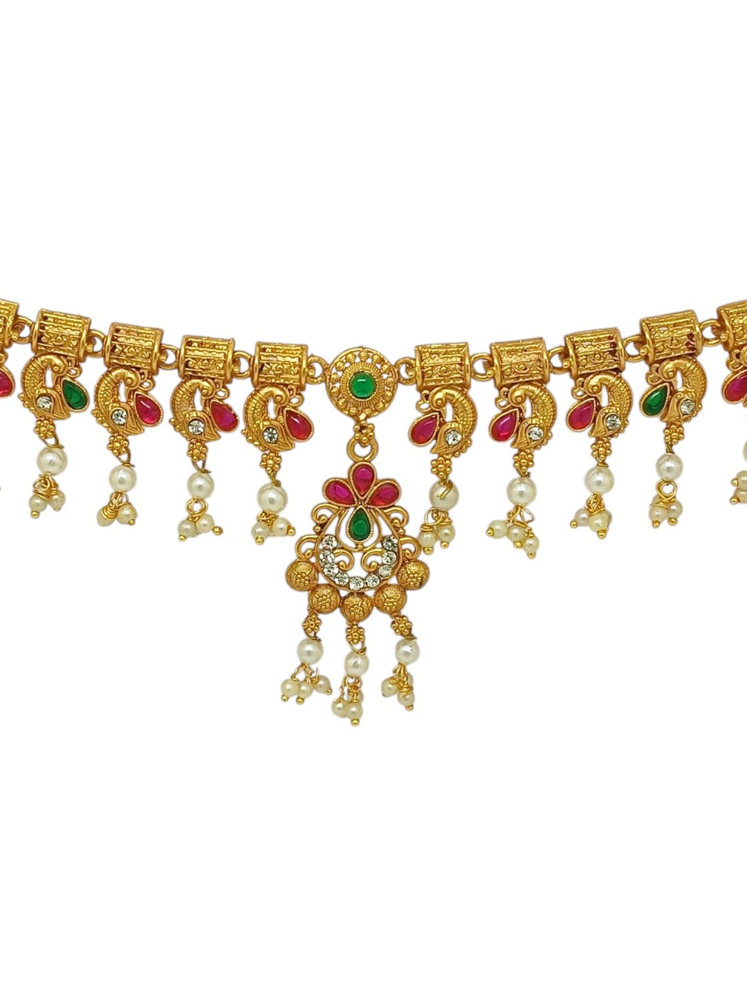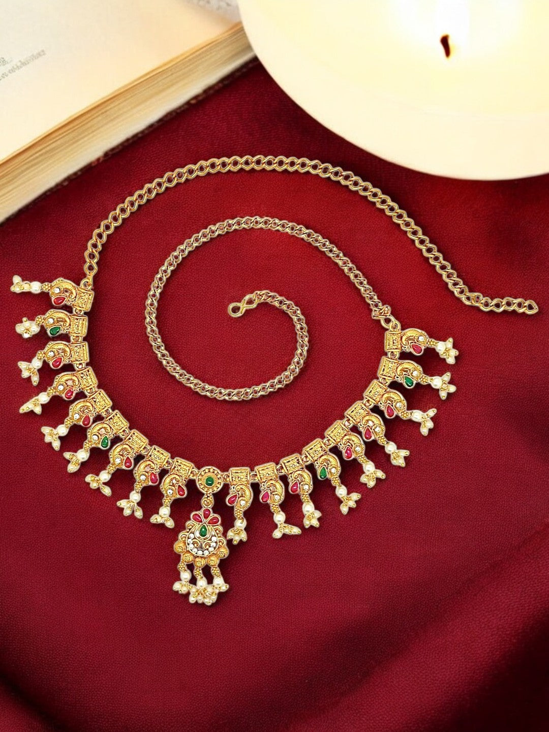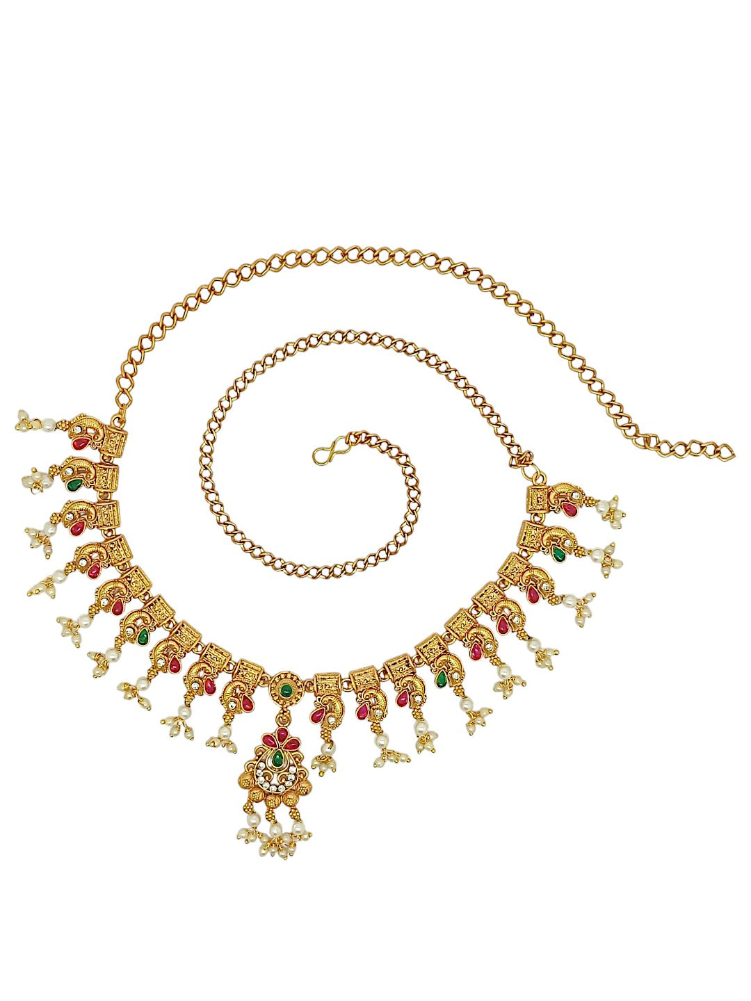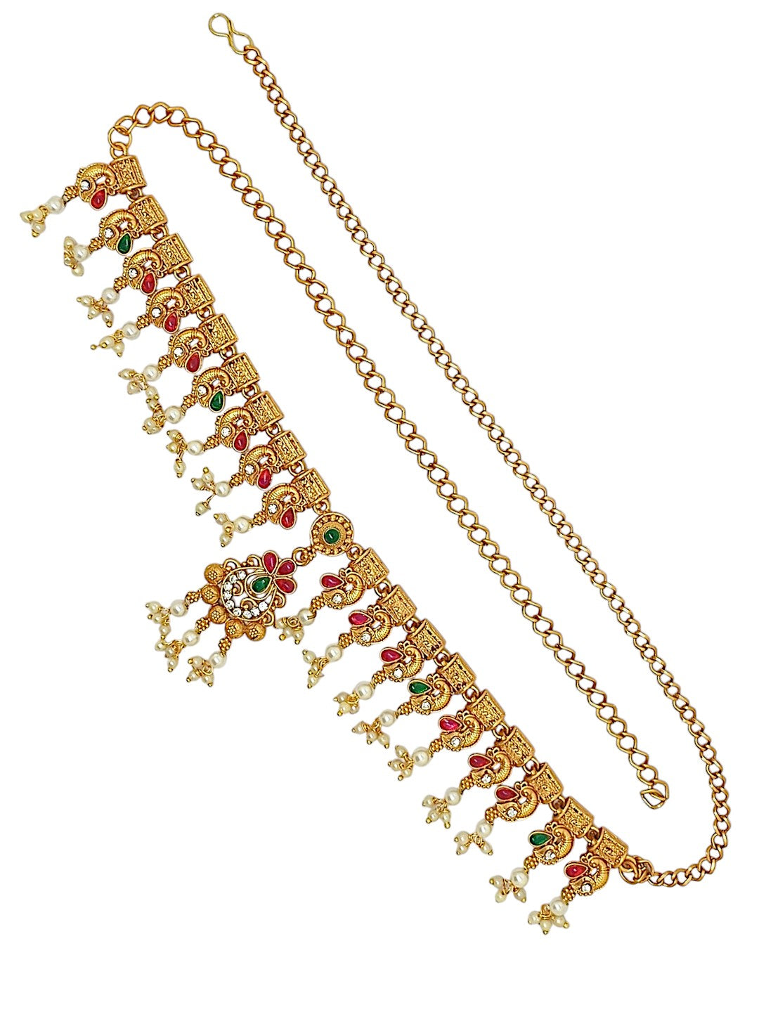 Gold-Toned Peacock Design Waist Chain Studded With Red & Green Stones & Beads. Secured With S-Hook Closure.