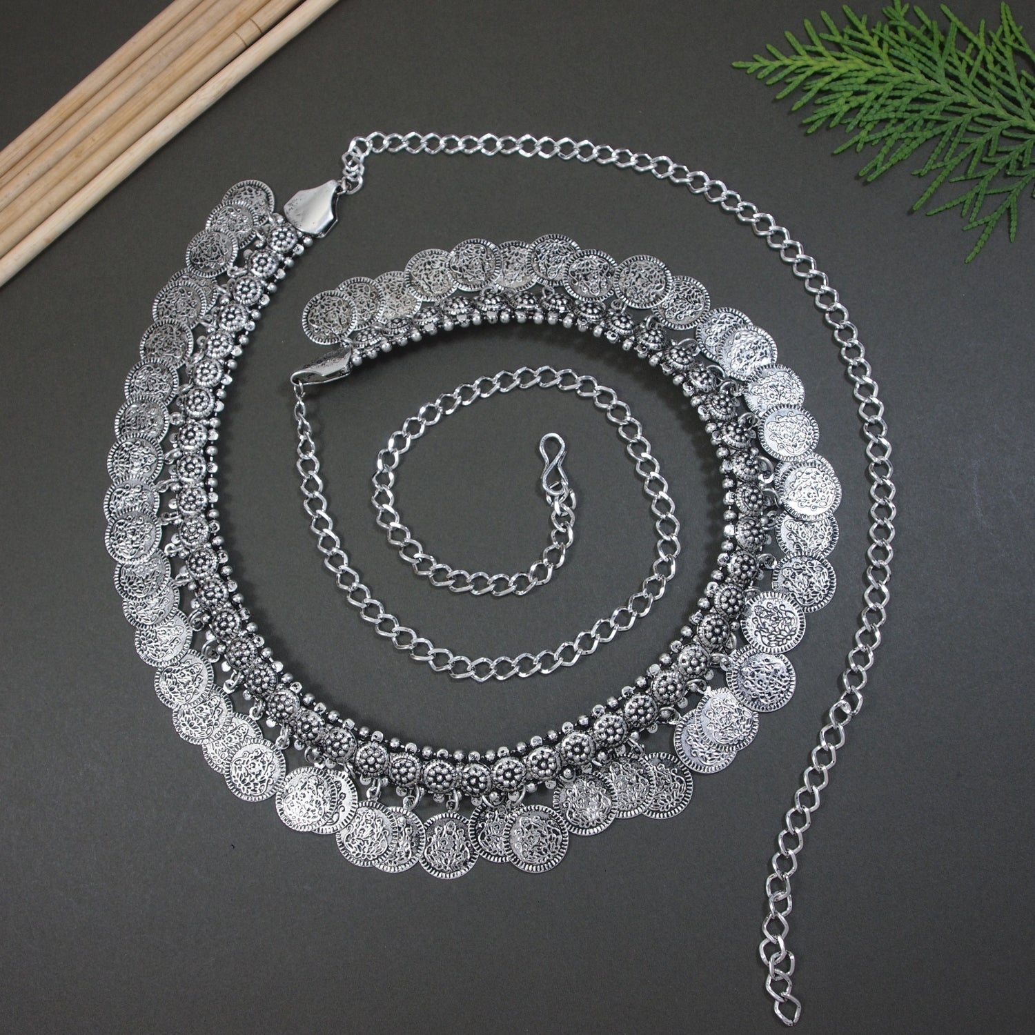 A Silver Oxidized Traditional Ethnic Waist Chain Embellished With Ghungroo Is A Beautiful Piece Of Jewelry That Combines Cultural Elements With A Bohemian Style. The Waist Chain Is Typically Designed With Silver Metal That Has Undergone An Oxidization Process, Giving It An Antique Look. The Chain Is Adjustable, Allowing It To Be Worn At Various Lengths Around The Waist. It Is Adorned With Ghungroos, Which Are Small Metallic Bells Traditionally Used In Indian Dance And Music Performances. The Ghungroos Add A Jingling Sound And A Vibrant Touch To The Waist Chain, Making It Visually Appealing And Audibly Enchanting. This Type Of Waist Chain Is Often Associated With Boho Or Bohemian Fashion, Which Embraces A Free-Spirited And Eclectic Style. It Can Be Worn With Various Outfits, Such As Traditional Indian Attire Like Sarees Or Lehengas, As Well As Contemporary Outfits Like Maxi Skirts, Flowy Dresses, Or Even Jeans And A Blouse. The Waist Chain Adds A Unique And Eye-Catching Element To The Overall Look, Enhancing The Wearer'S Personal Style And Making A Statement.