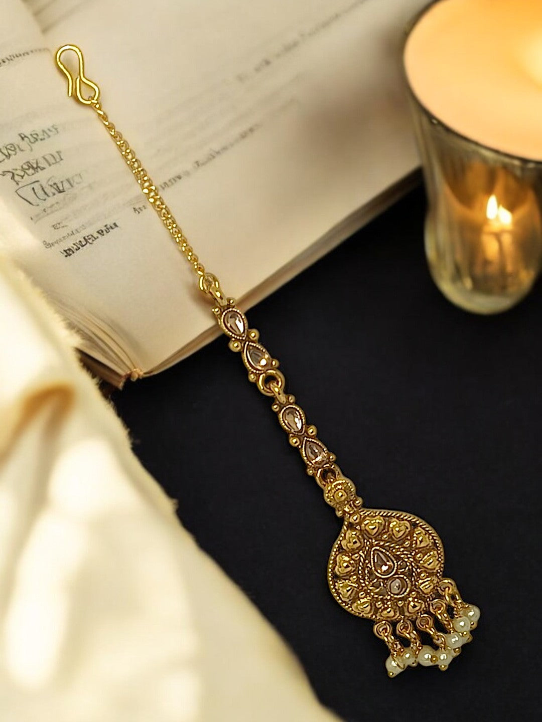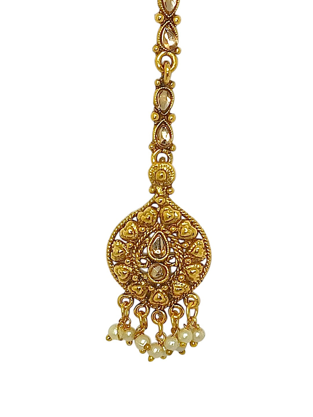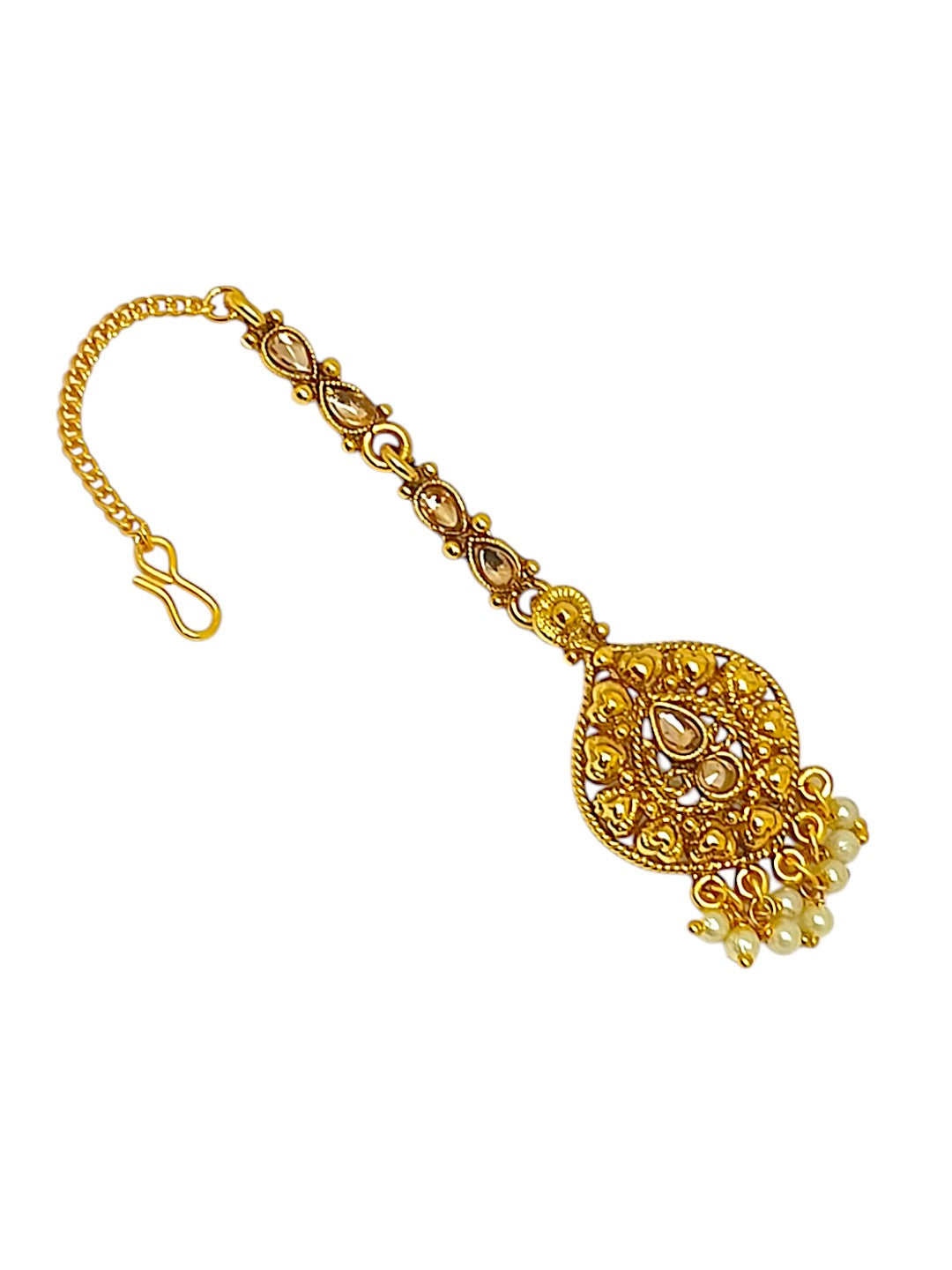 Gold-Toned Artificial Stone And Beads Studded Maang Tikka. Secured With S-Hook Closure