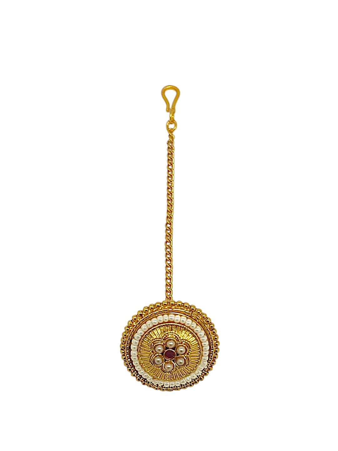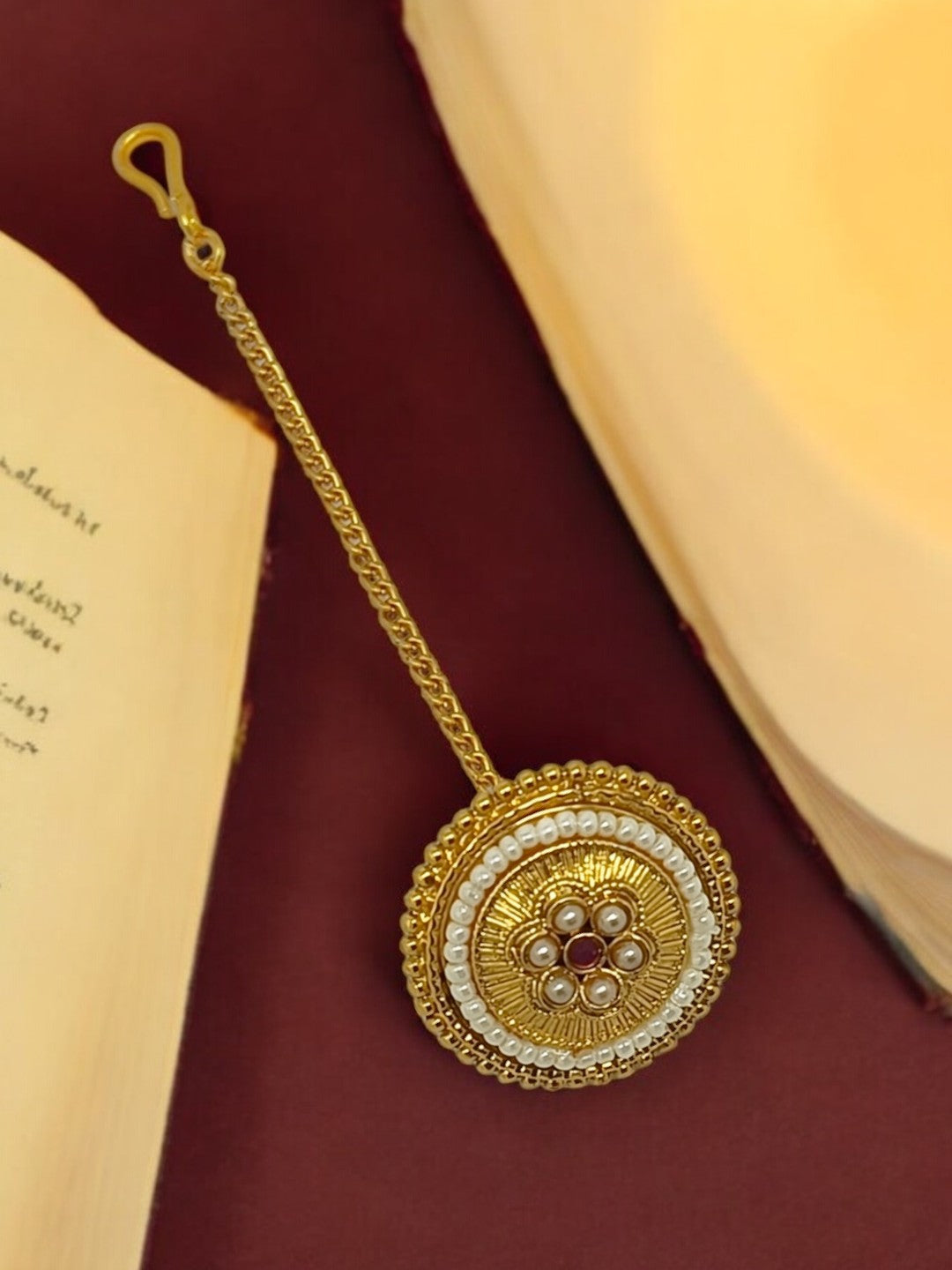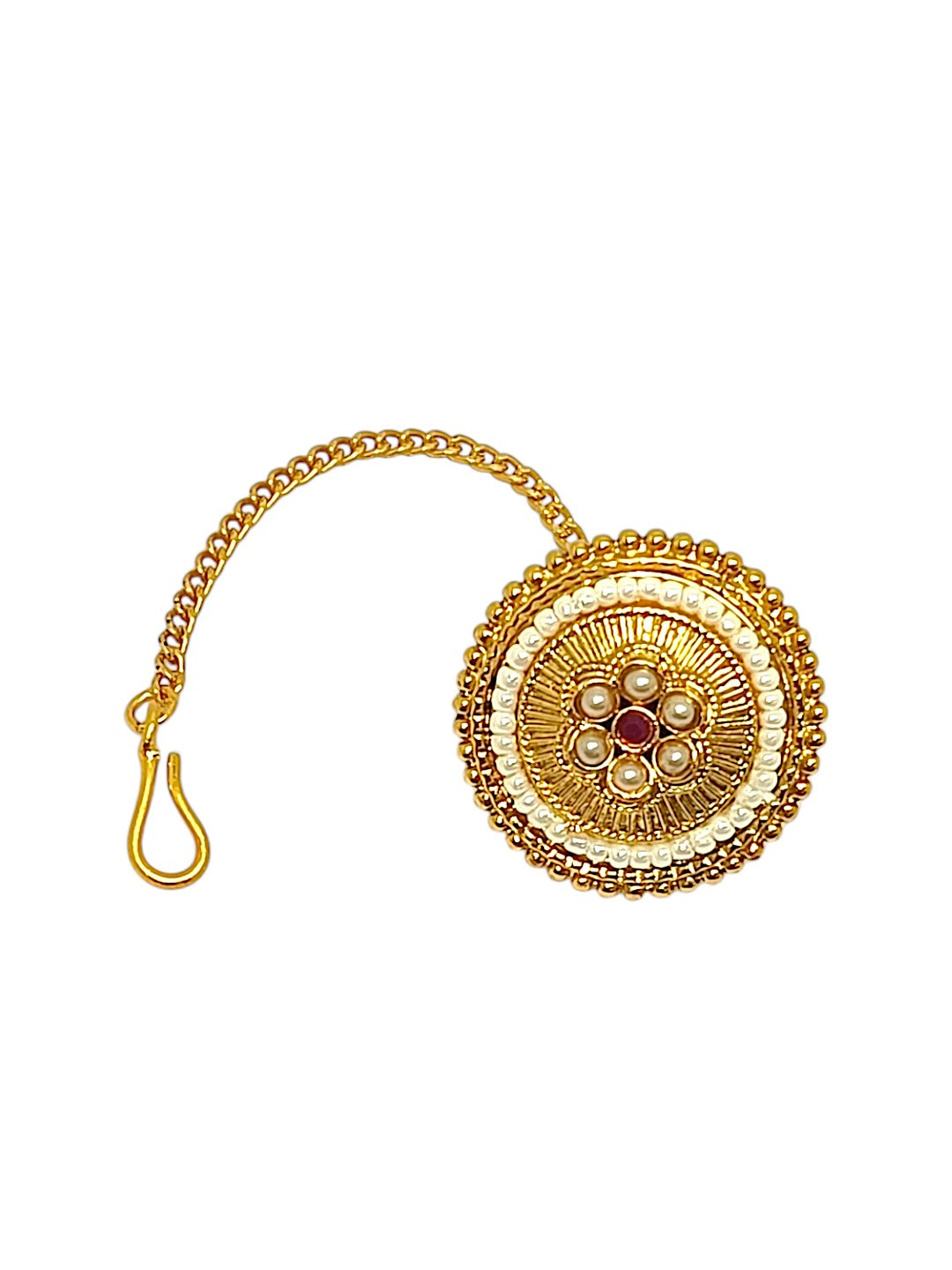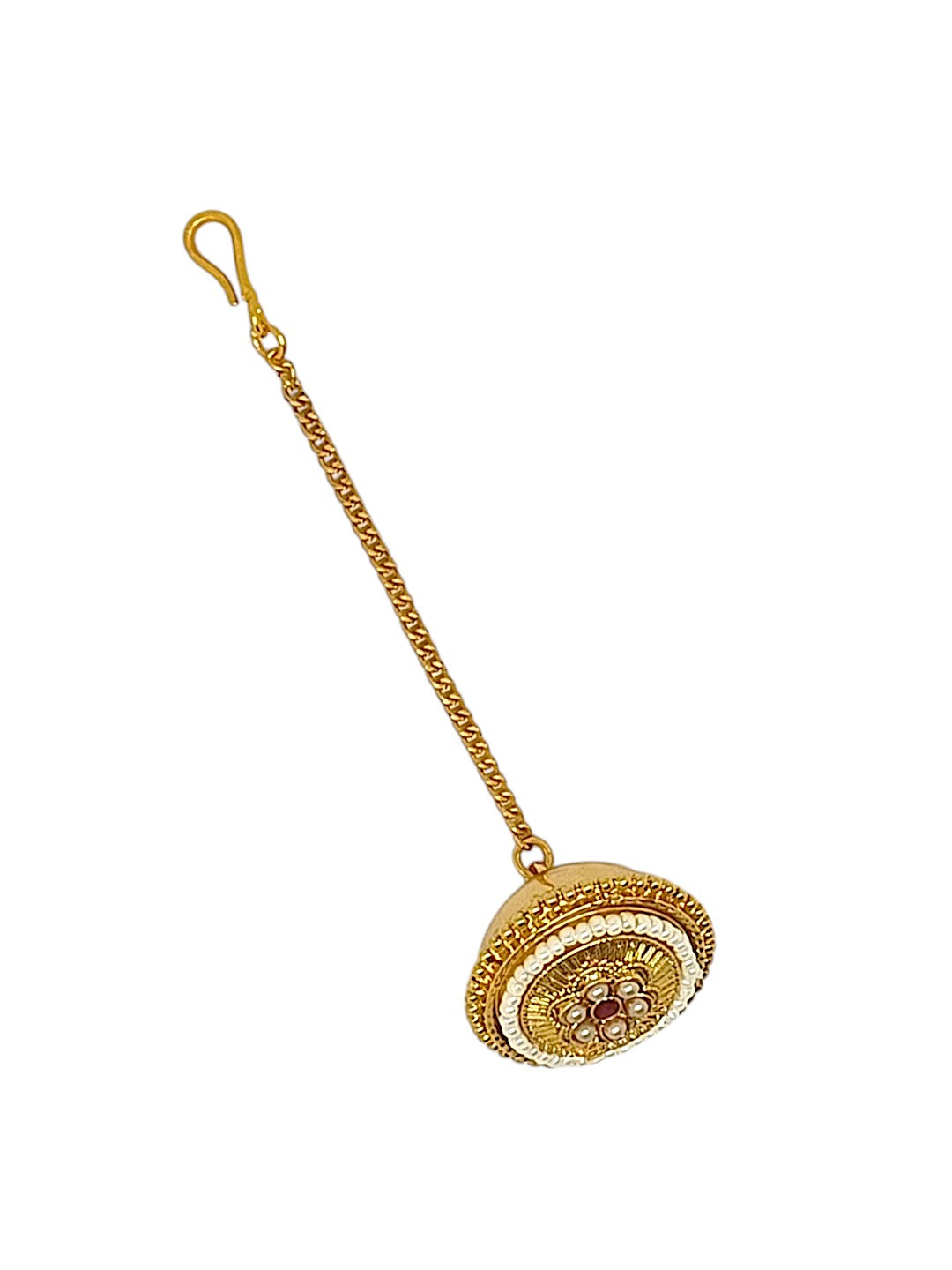 Gold-Toned Rajasthani Borla Maang Tikka Studded With Red Stone And Beads. Secured With S-Hook Closure