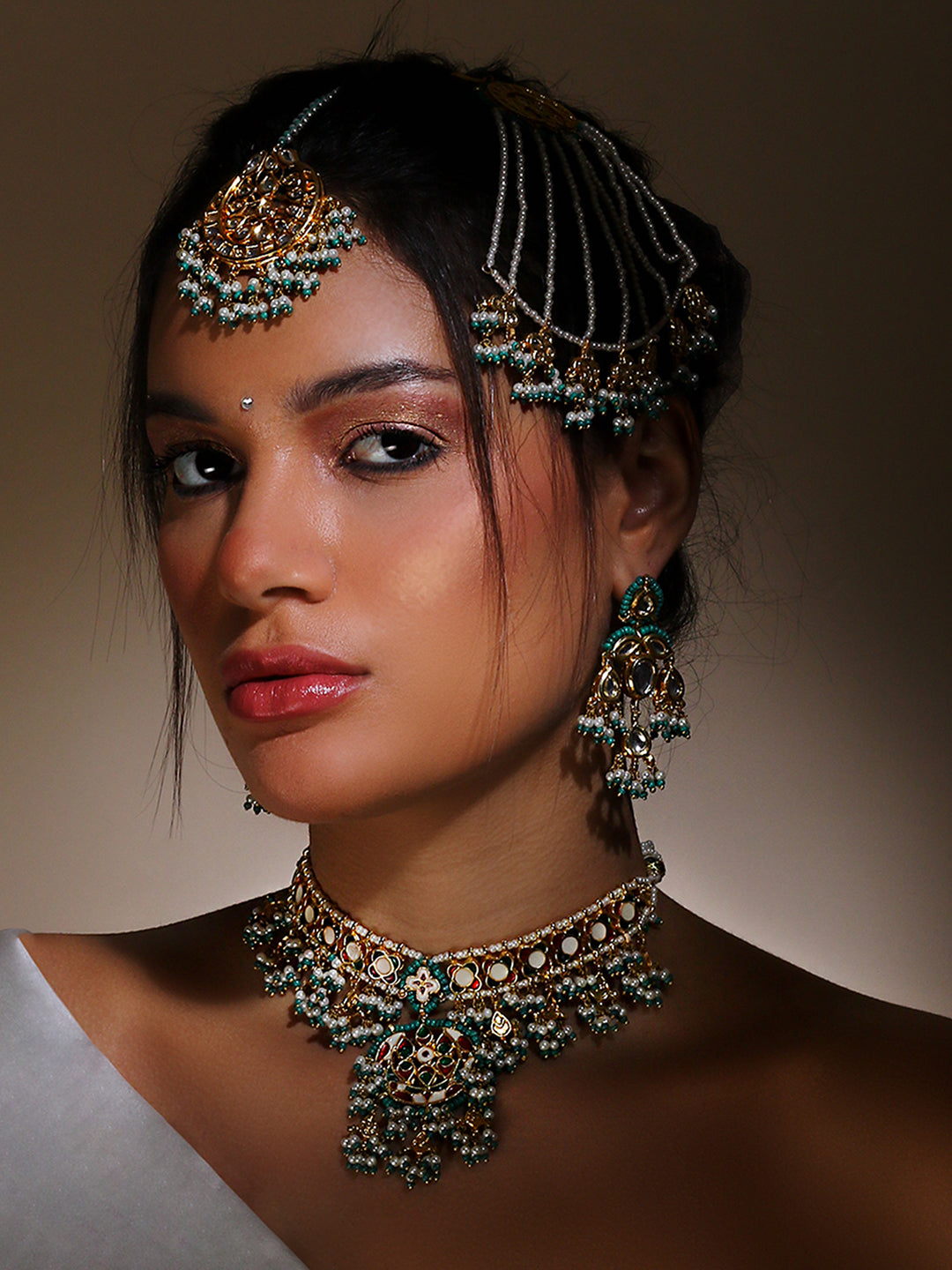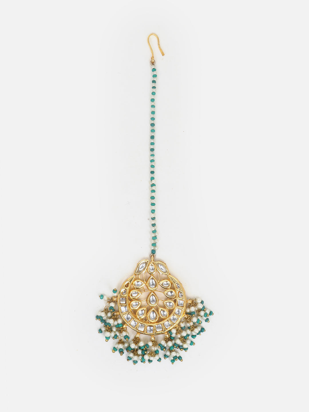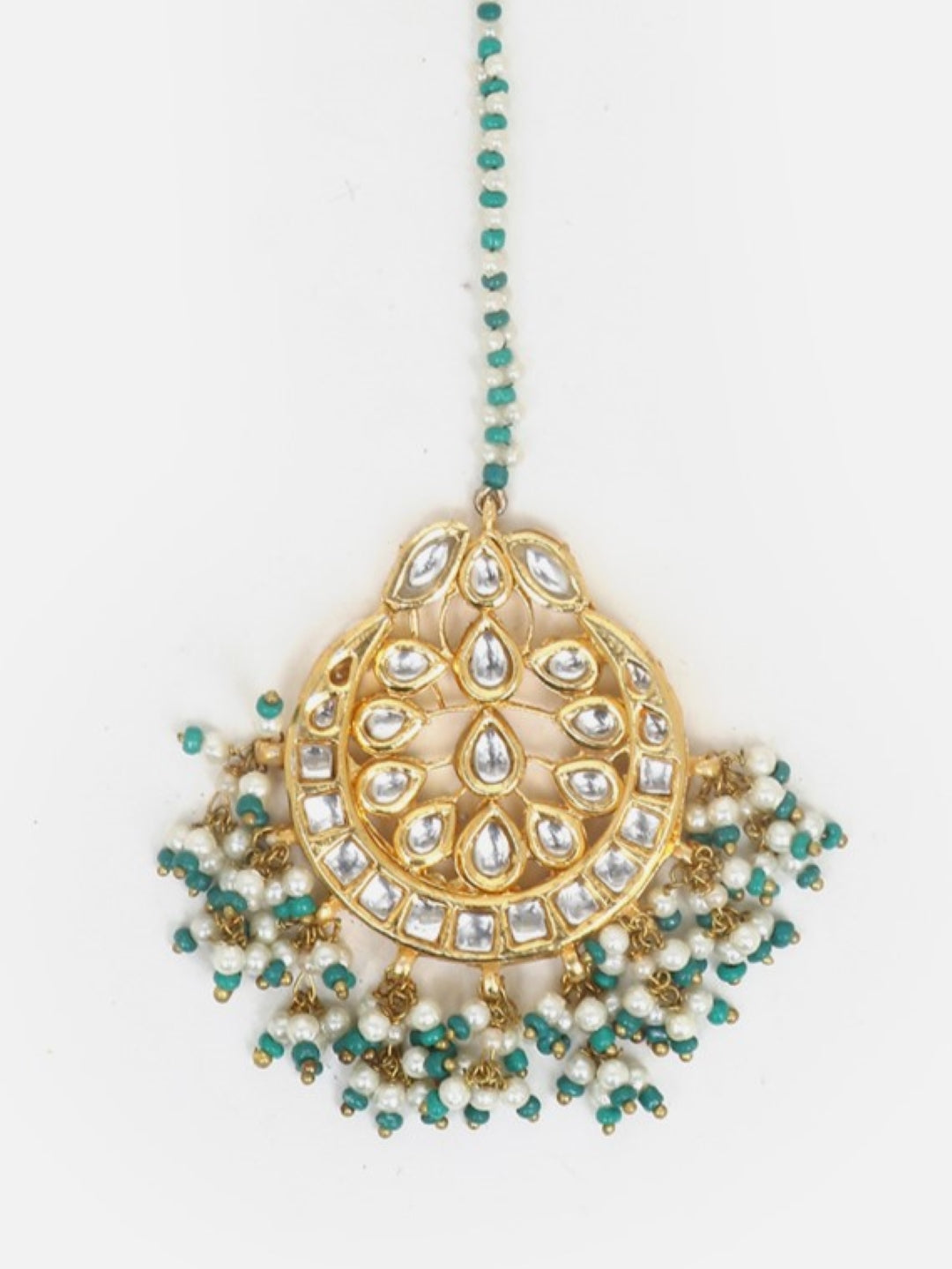 Jewellery Gold And Blue Mangtikka With Big Pc Of Real Jewellery; Category Of Jewellery Is Hair Jewellery; Sub Category Is Maang Tikka; Ideal For Women; Color Is Green, Cream, Gold, White; Gemstones Used - Kundan, Pearls, Natural Stones; Plating Is Gold-Plated; Base Metal Is Alloy; Other Material Used - Kanchain; Size Is Freesize; Adjustable - No; Weight Is 26 Gms; Mesaurements - Length Of Mangtika =19.5 Cm; Width Of Mangtika = 6.5 Cm; Adjustable - No; Content 1 Maang Tikka