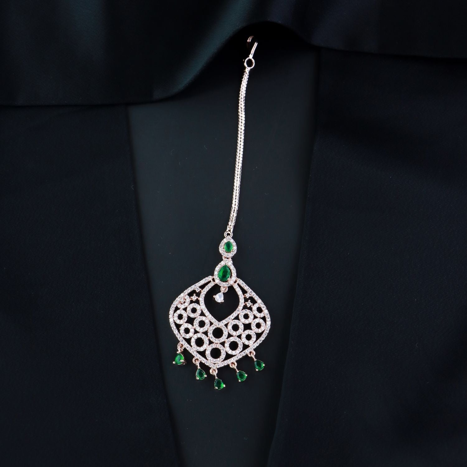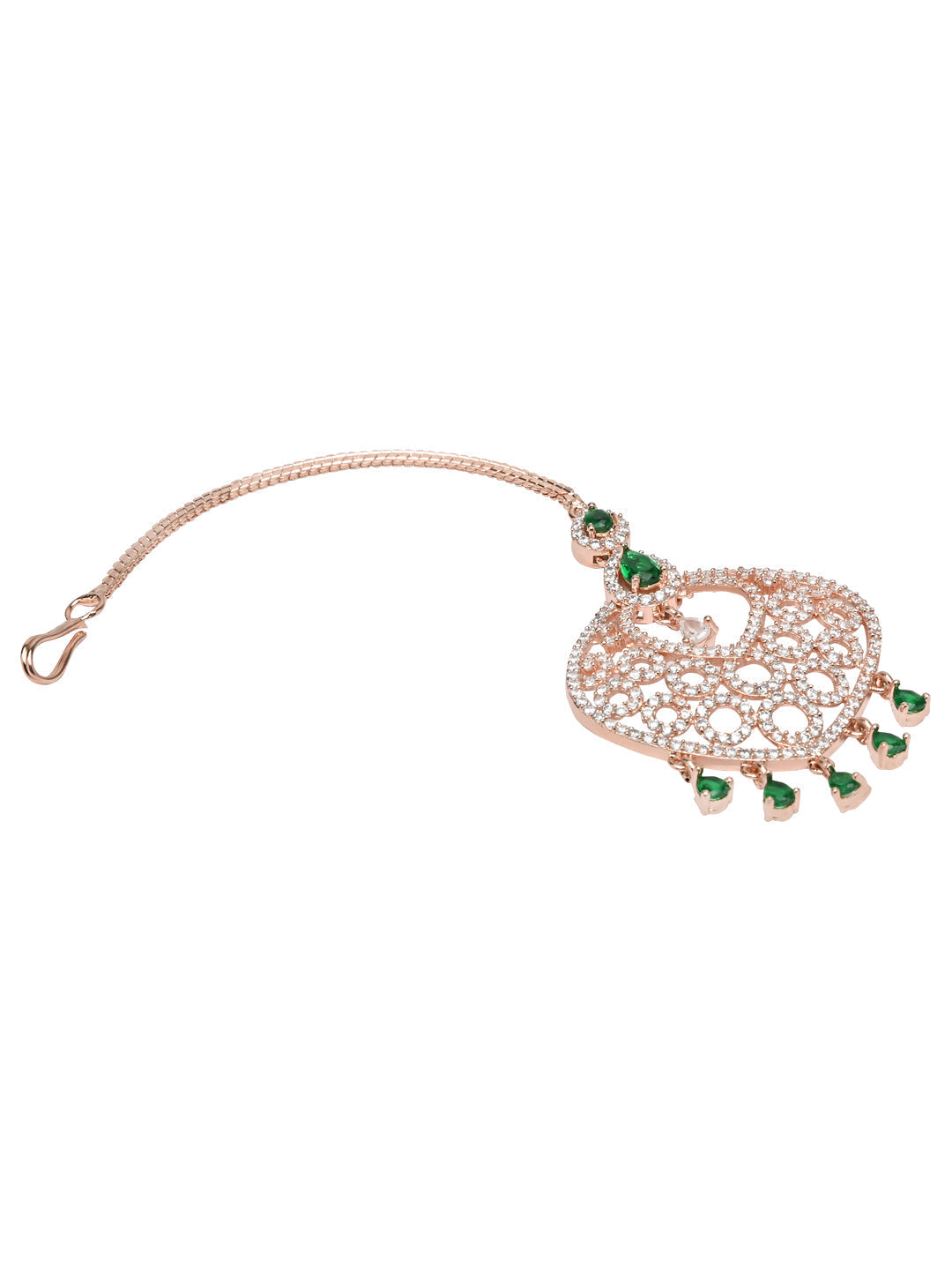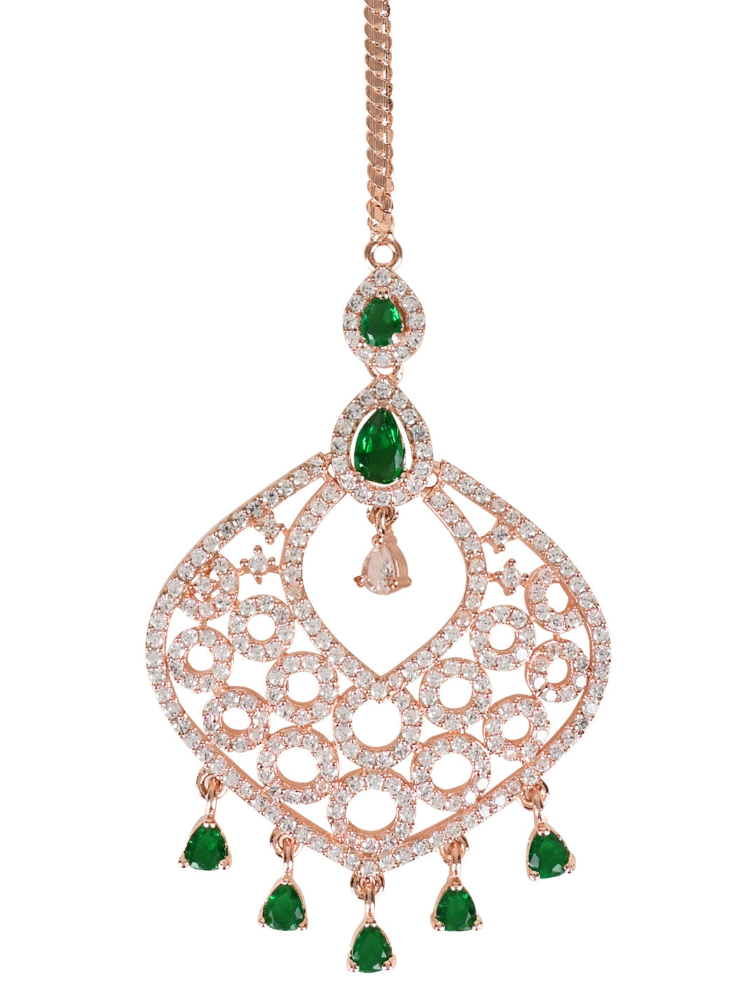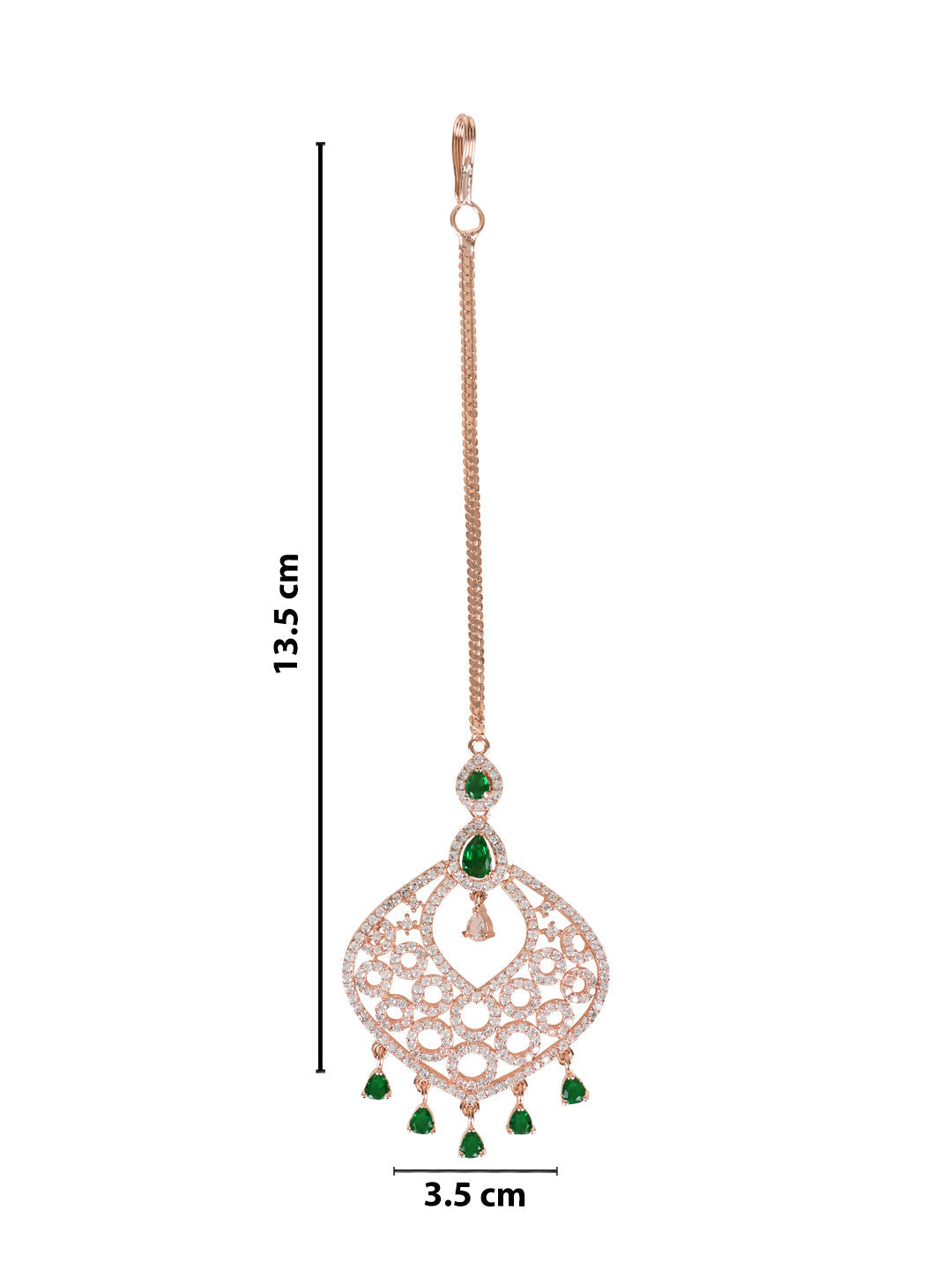 This maang tikka is crafted in Rosegold-plating and features AD Stone studded in it and secured with a hook closure. This captivating indian jewellery maangtikka is a great gifting option and is a perfect pick to add to your jewelry collection. You can style it with ethnic or western clothing.