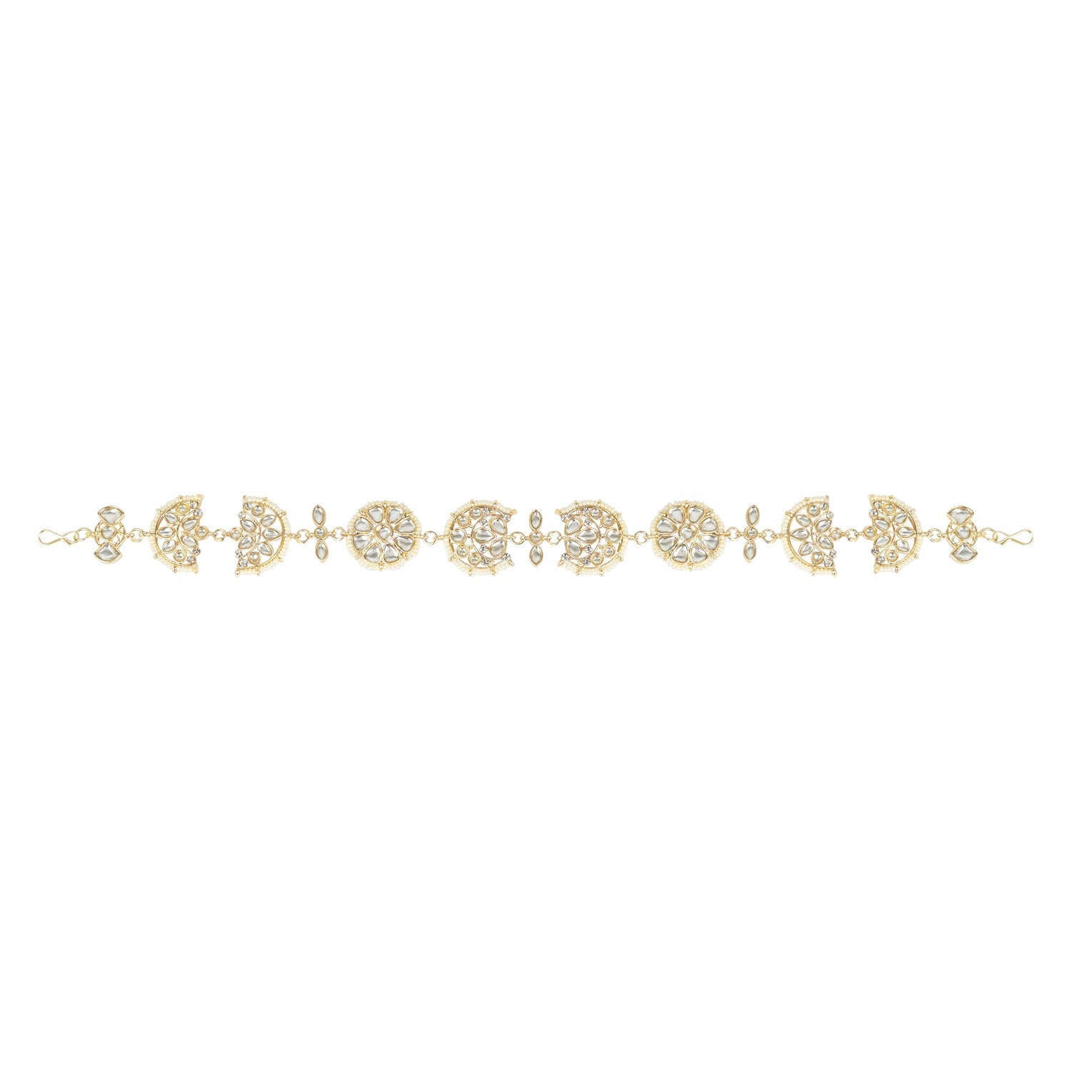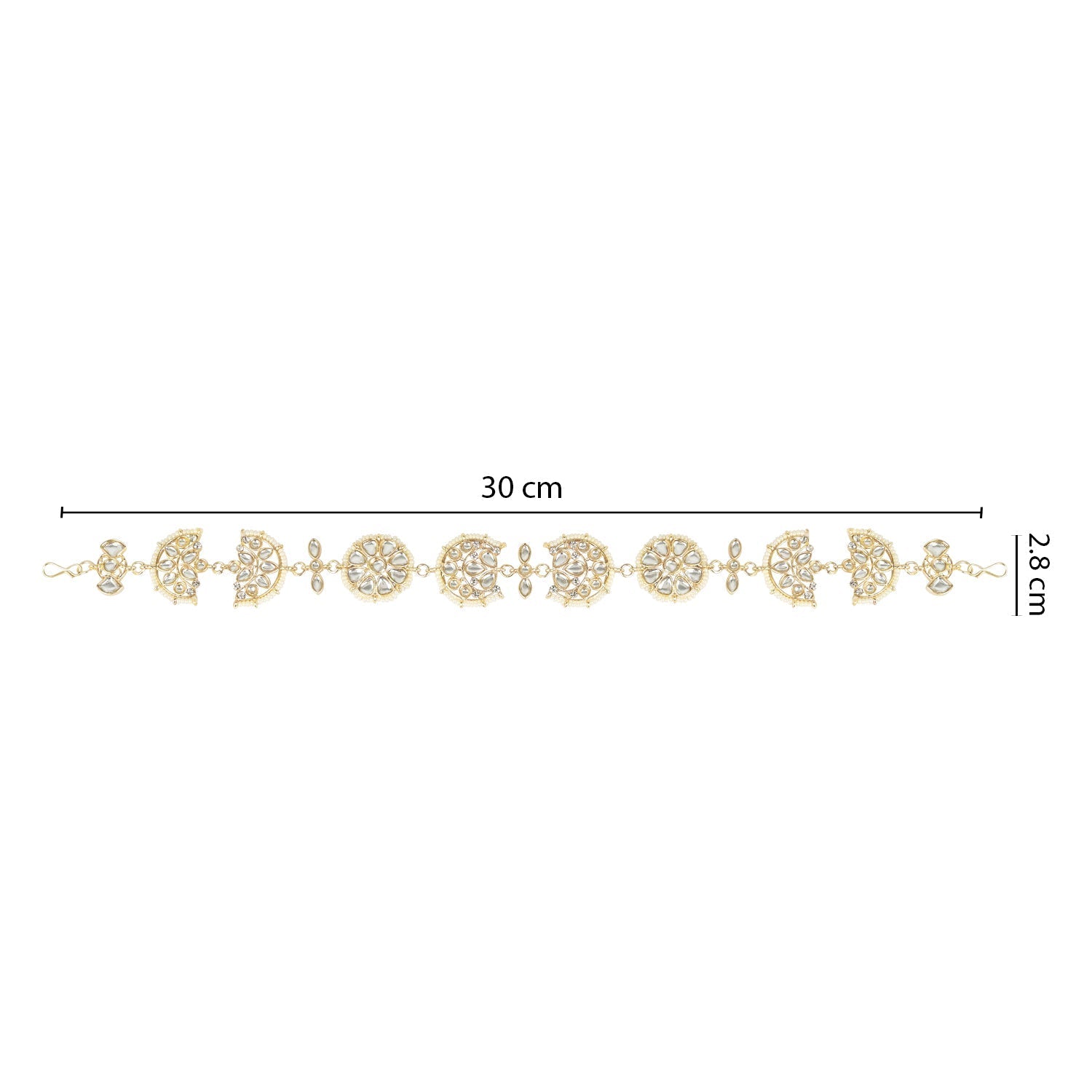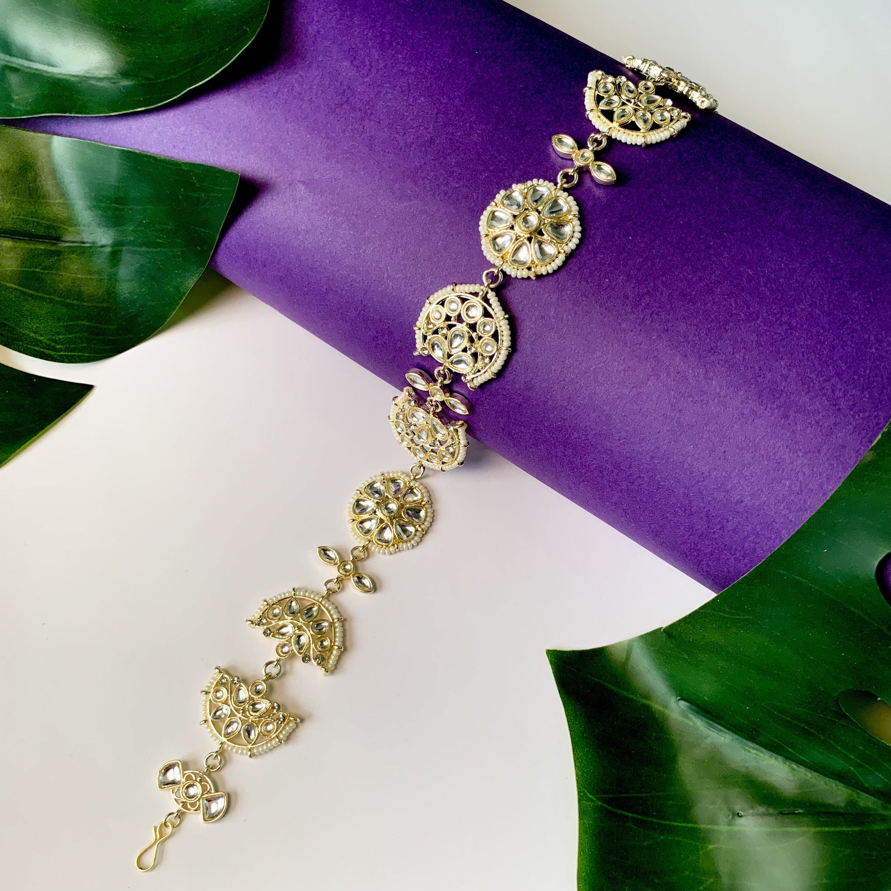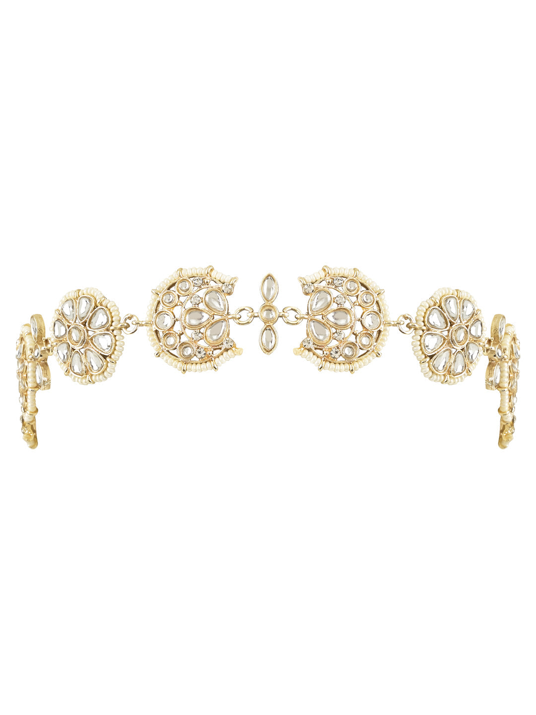 This Is A Stunning And Traditional Piece Of Jewelry That Showcases Intricate Craftsmanship And Luxurious Materials. The Piece Features A Floral Design That Is Inspired By The Traditional Rajasthani Style, Which Is Known For Its Bold And Intricate Motifs. The Base Material Of The Jewelry Is Gold-Plated, Which Adds A Lustrous And Rich Look To The Piece. The Gold Plating Also Ensures That The Piece Is Long-Lasting And Durable. The Floral Design Is Then Embellished With Kundan. The Kundan Stones Used In This Piece Are Of High Quality And Add A Sparkling And Elegant Touch To The Overall Design. In Addition To The Kundan Stones, The Piece Is Also Studded With Pearls, Which Are Known For Their Classic And Timeless Beauty. The Pearls Used In This Piece Are Of High Quality And Have A Lustrous And Smooth Surface That Adds To The Overall Luxurious Look Of The Jewelry. Overall, This Piece Is A Beautiful And Traditional Addition To Any Jewelry Collection. Its Intricate Design, High-Quality Materials, And Attention To Detail Make It A True Work Of Art. Whether Worn For A Special Occasion Or As An Everyday Accessory, This Jewelry Is Sure To Make A Statement And Leave A Lasting Impression.