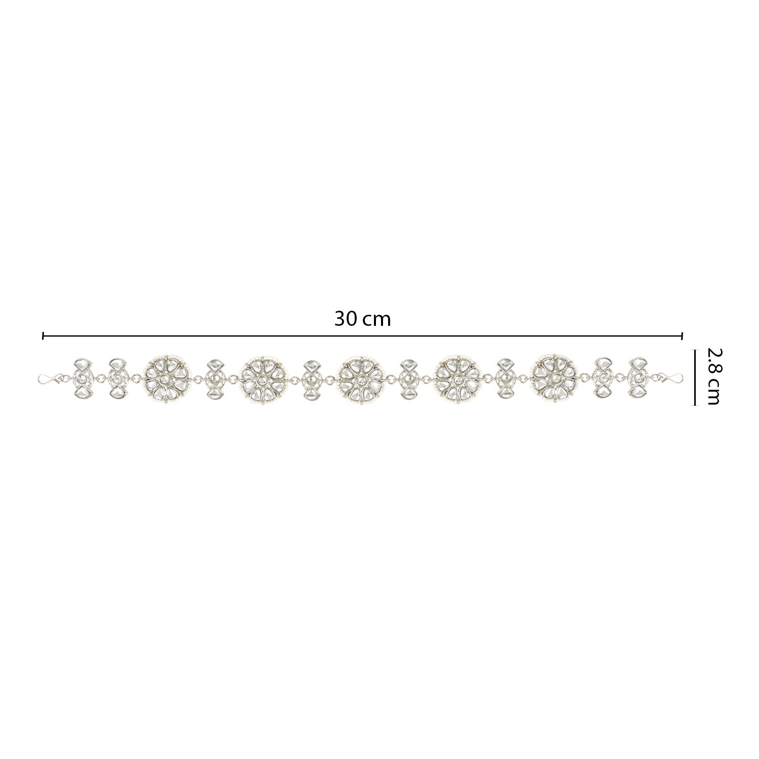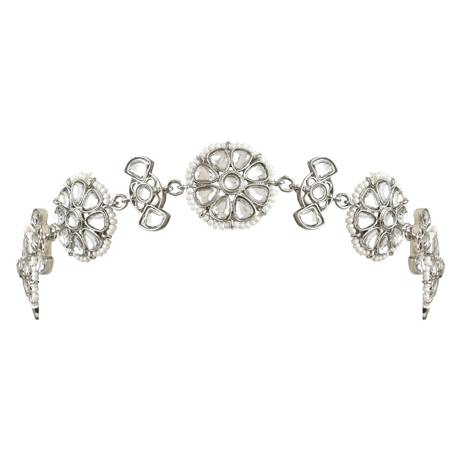 This Is A Stunning And Traditional Piece Of Jewelry That Showcases Intricate Craftsmanship And Luxurious Materials. The Piece Features A Floral Design That Is Inspired By The Traditional Rajasthani Style, Which Is Known For Its Bold And Intricate Motifs. The Base Material Of The Jewelry Is Silver-Plated, Which Adds A Lustrous And Rich Look To The Piece. The Silver Plating Also Ensures That The Piece Is Long-Lasting And Durable. The Floral Design Is Then Embellished With Kundan. The Kundan Stones Used In This Piece Are Of High Quality And Add A Sparkling And Elegant Touch To The Overall Design. In Addition To The Kundan Stones, The Piece Is Also Studded With Pearls, Which Are Known For Their Classic And Timeless Beauty. The Pearls Used In This Piece Are Of High Quality And Have A Lustrous And Smooth Surface That Adds To The Overall Luxurious Look Of The Jewelry. Overall, This Piece Is A Beautiful And Traditional Addition To Any Jewelry Collection. Its Intricate Design, High-Quality Materials, And Attention To Detail Make It A True Work Of Art. Whether Worn For A Special Occasion Or As An Everyday Accessory, This Jewelry Is Sure To Make A Statement And Leave A Lasting Impression.