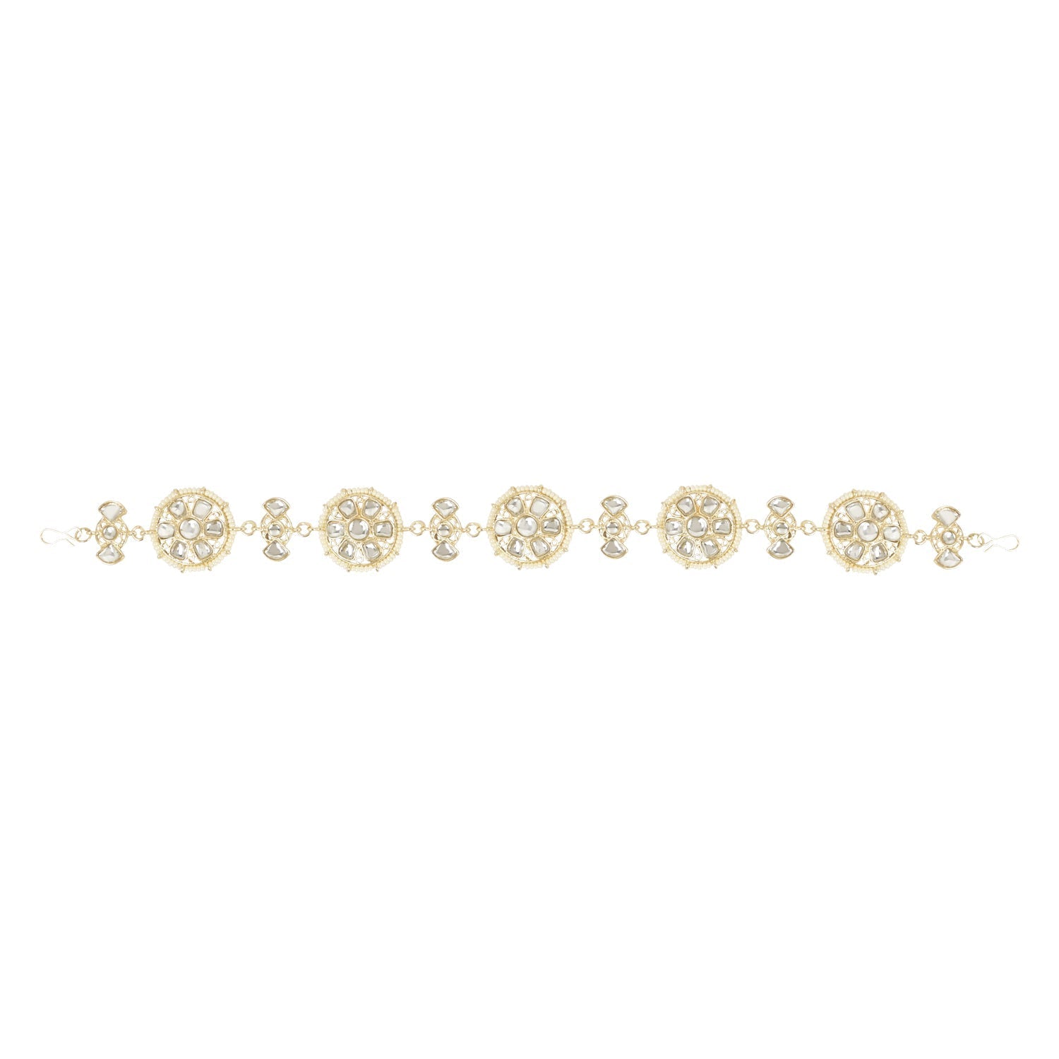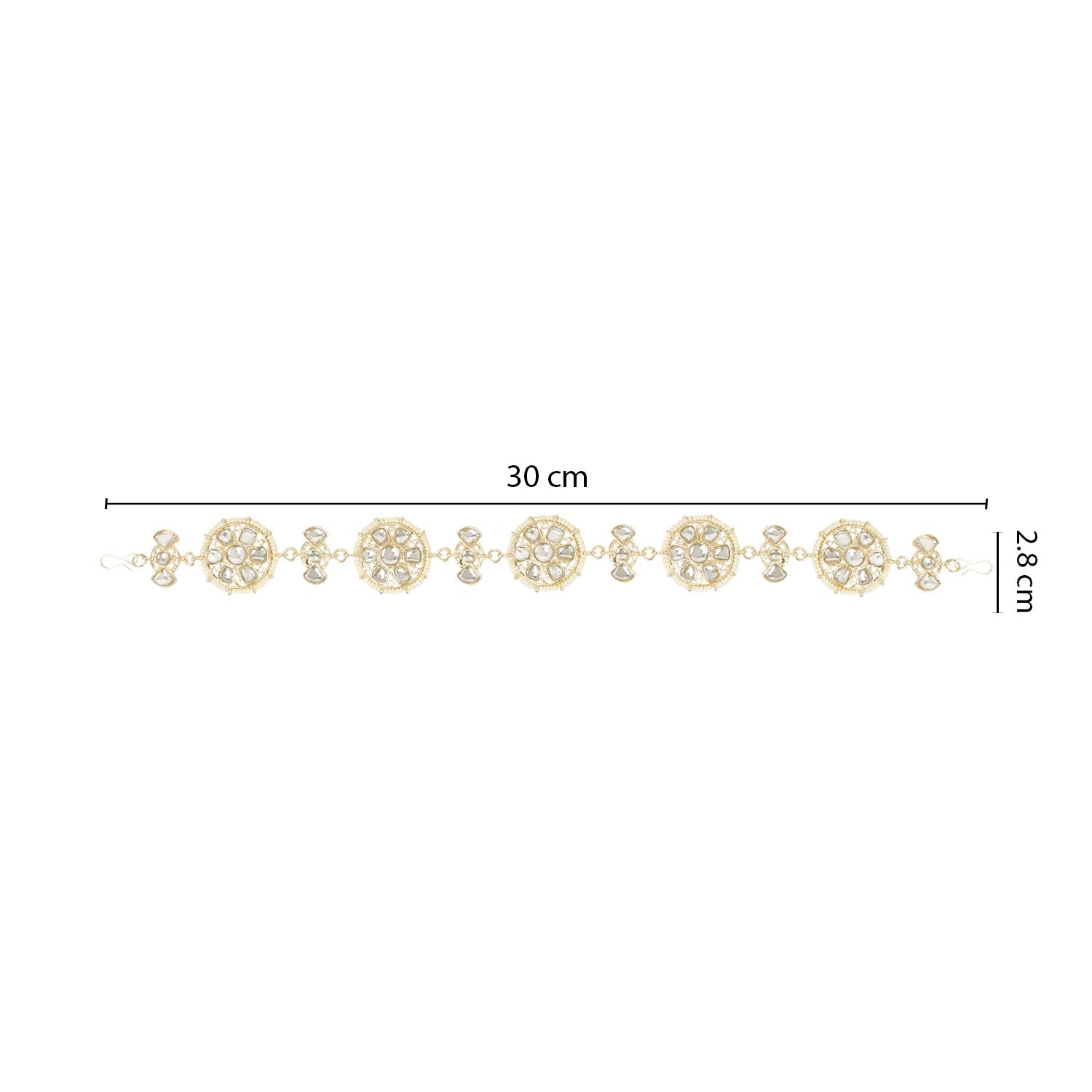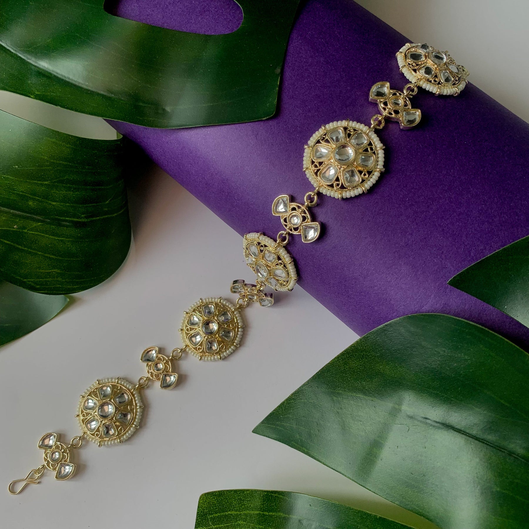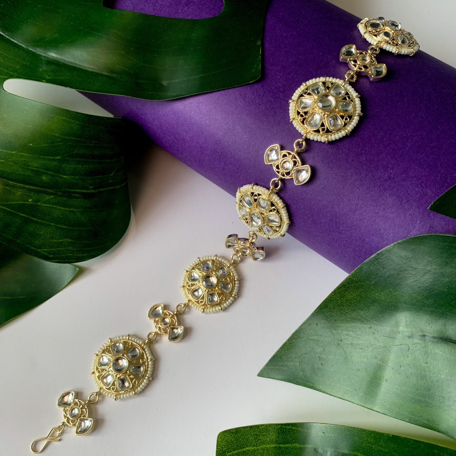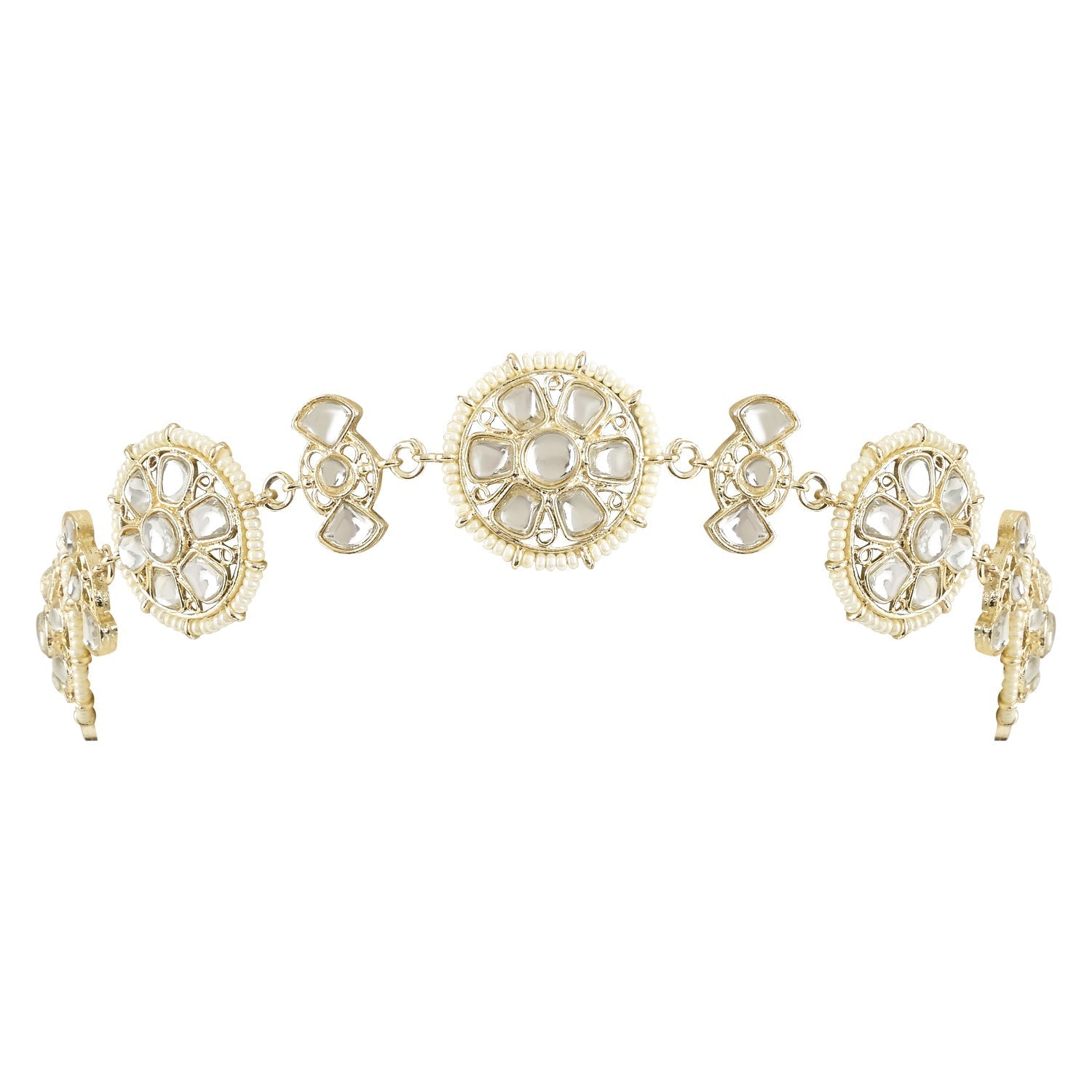 This Is A Stunning And Traditional Piece Of Jewelry That Showcases Intricate Craftsmanship And Luxurious Materials. The Piece Features A Floral Design That Is Inspired By The Traditional Rajasthani Style, Which Is Known For Its Bold And Intricate Motifs. The Base Material Of The Jewelry Is Gold-Plated, Which Adds A Lustrous And Rich Look To The Piece. The Gold Plating Also Ensures That The Piece Is Long-Lasting And Durable. The Floral Design Is Then Embellished With Kundan. The Kundan Stones Used In This Piece Are Of High Quality And Add A Sparkling And Elegant Touch To The Overall Design. In Addition To The Kundan Stones, The Piece Is Also Studded With Pearls, Which Are Known For Their Classic And Timeless Beauty. The Pearls Used In This Piece Are Of High Quality And Have A Lustrous And Smooth Surface That Adds To The Overall Luxurious Look Of The Jewelry. Overall, This Piece Is A Beautiful And Traditional Addition To Any Jewelry Collection. Its Intricate Design, High-Quality Materials, And Attention To Detail Make It A True Work Of Art. Whether Worn For A Special Occasion Or As An Everyday Accessory, This Jewelry Is Sure To Make A Statement And Leave A Lasting Impression.