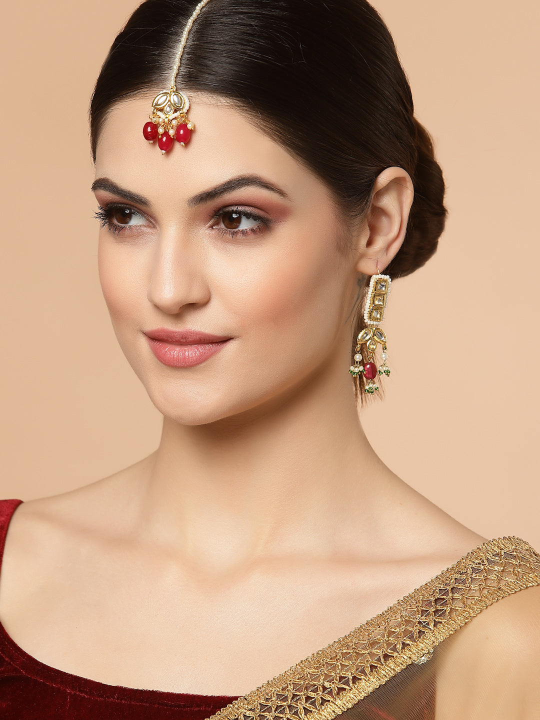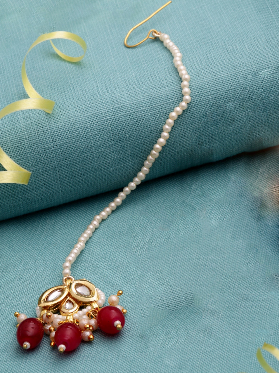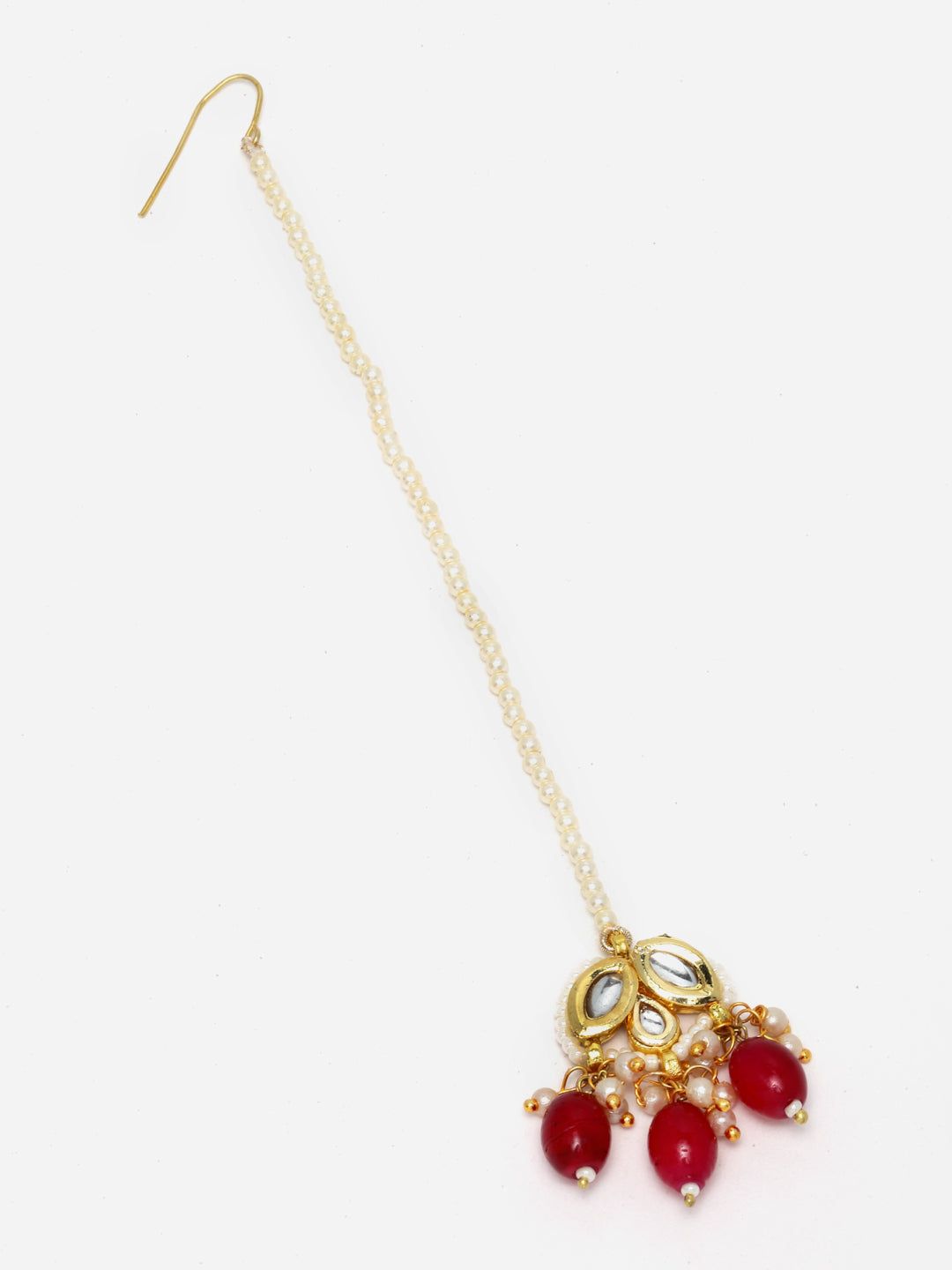 Cute And Red Is The Combination Every Girl In You Look For... Simple Kundan Pc Highlighted With Precious Ruby Red Stone Is What Makes This Pc Unique And You As Well.; Category Of Jewellery Is Hair Jewellery; Sub Category Is Maang Tikka; Ideal For Women; Color Is Red, Gold, White; Gemstones Used - Kundan, Pearls, Natural Stones; Plating Is Gold-Plated; Base Metal Is Alloy; Other Material Used - None; Size Is Freesize; Adjustable - Yes; Weight Is 7 Gms; Mesaurements - Length Of Maang Tikka =15 Cm; Width Of Maang Tikka = 3 Cm; Adjustable - Yes; Content 1 Maang Tikka
