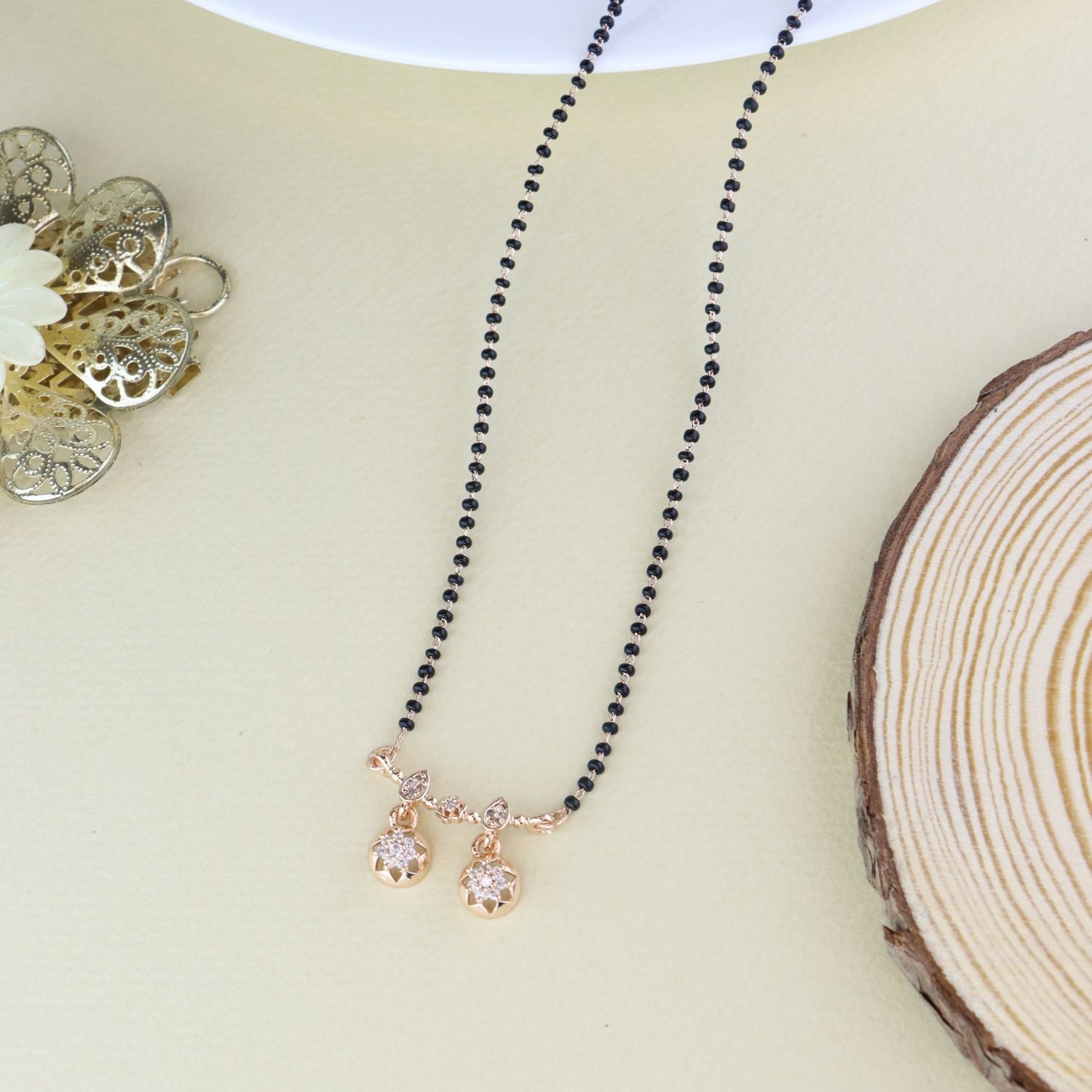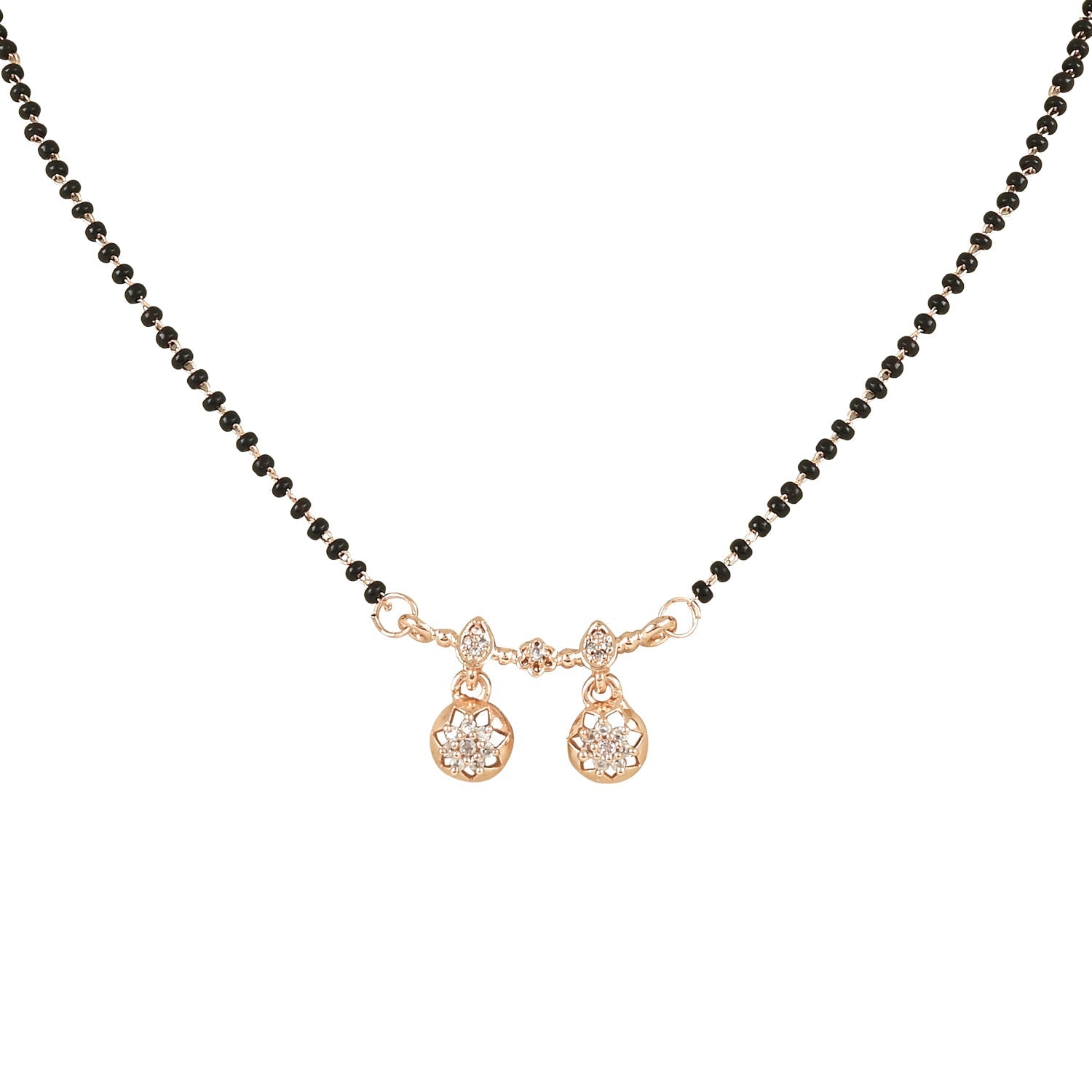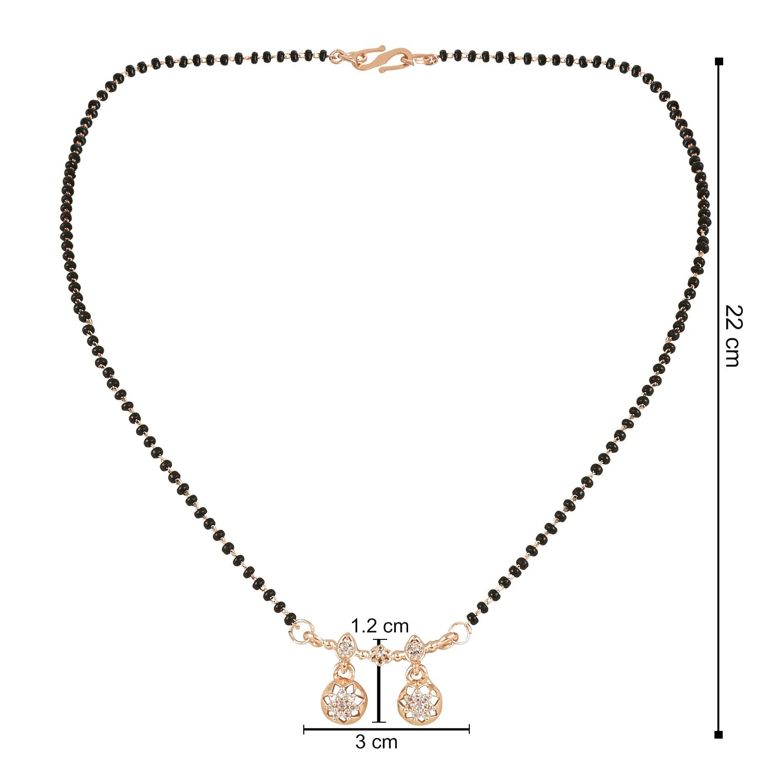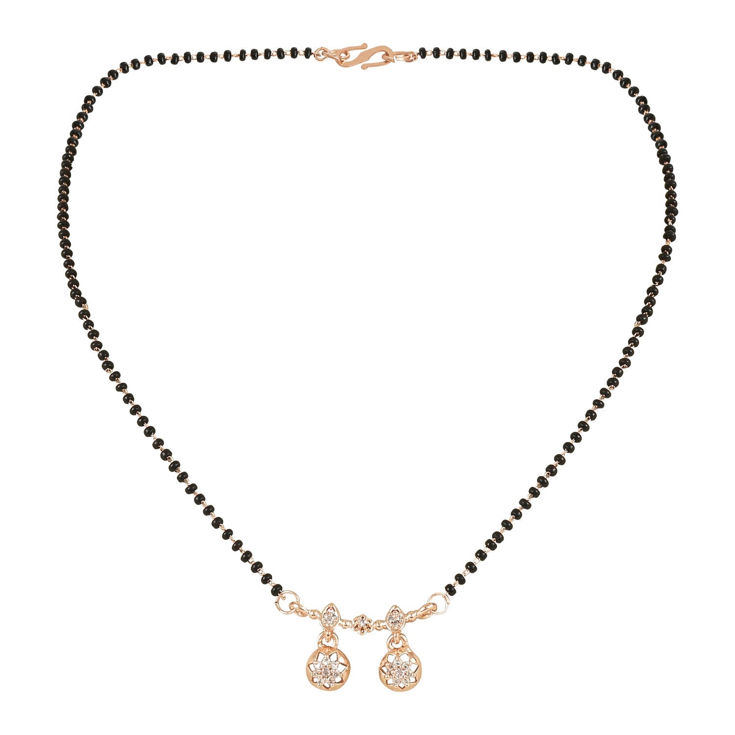The black bead chain of the mangalsutra is designed to complement the pendant and adds a touch of tradition and culture to the piece. The black beads are believed to have protective and auspicious properties in Indian culture, making this mangalsutra a meaningful and symbolic piece of jewelry. This Rose Gold Plated Traditional Single Line American Diamond Pendant with Black Bead Chain Mangalsutra is perfect for women who appreciate the beauty of traditional Indian jewelry with a modern twist. It is a versatile piece that can be worn with a variety of outfits and is sure to make a statement wherever it is worn.