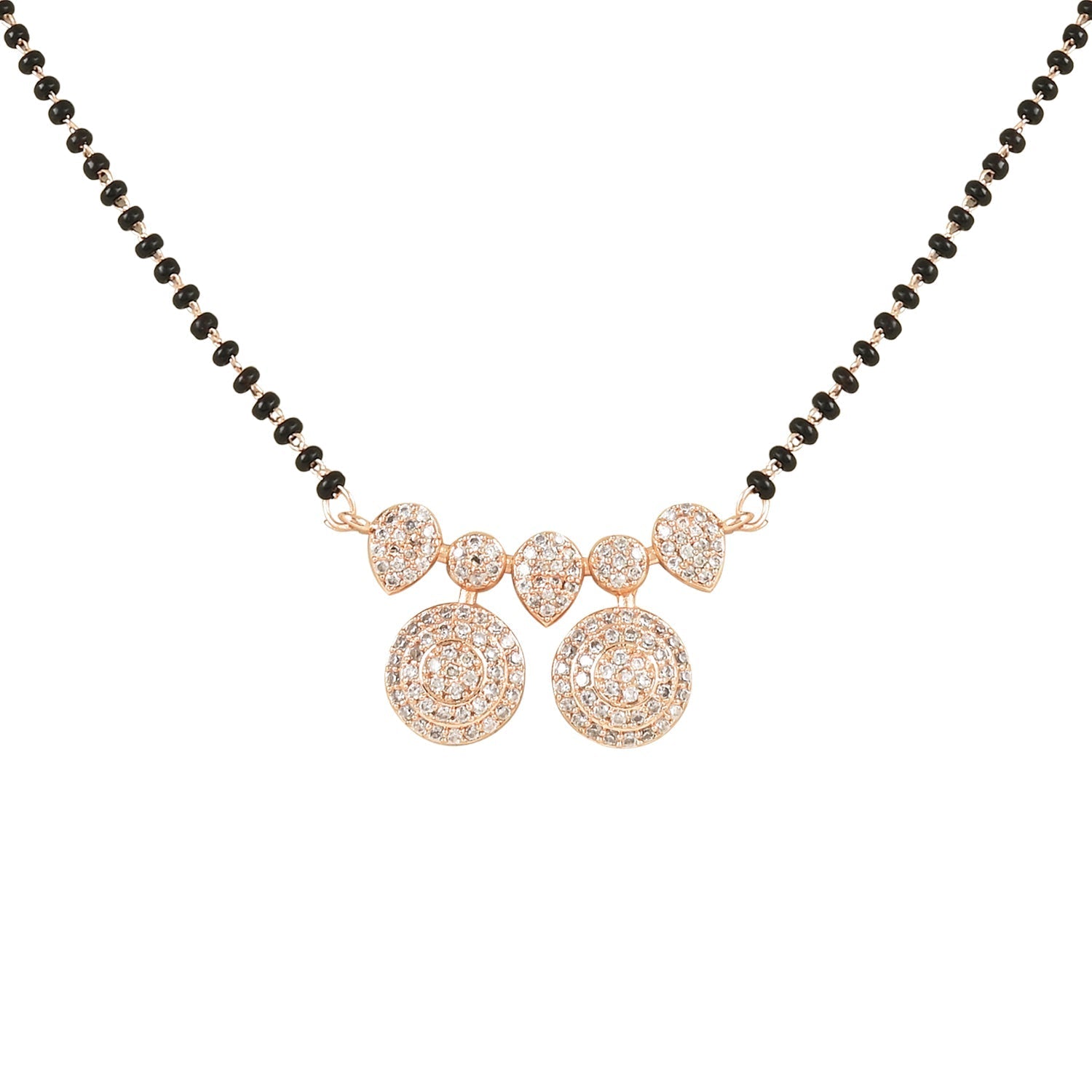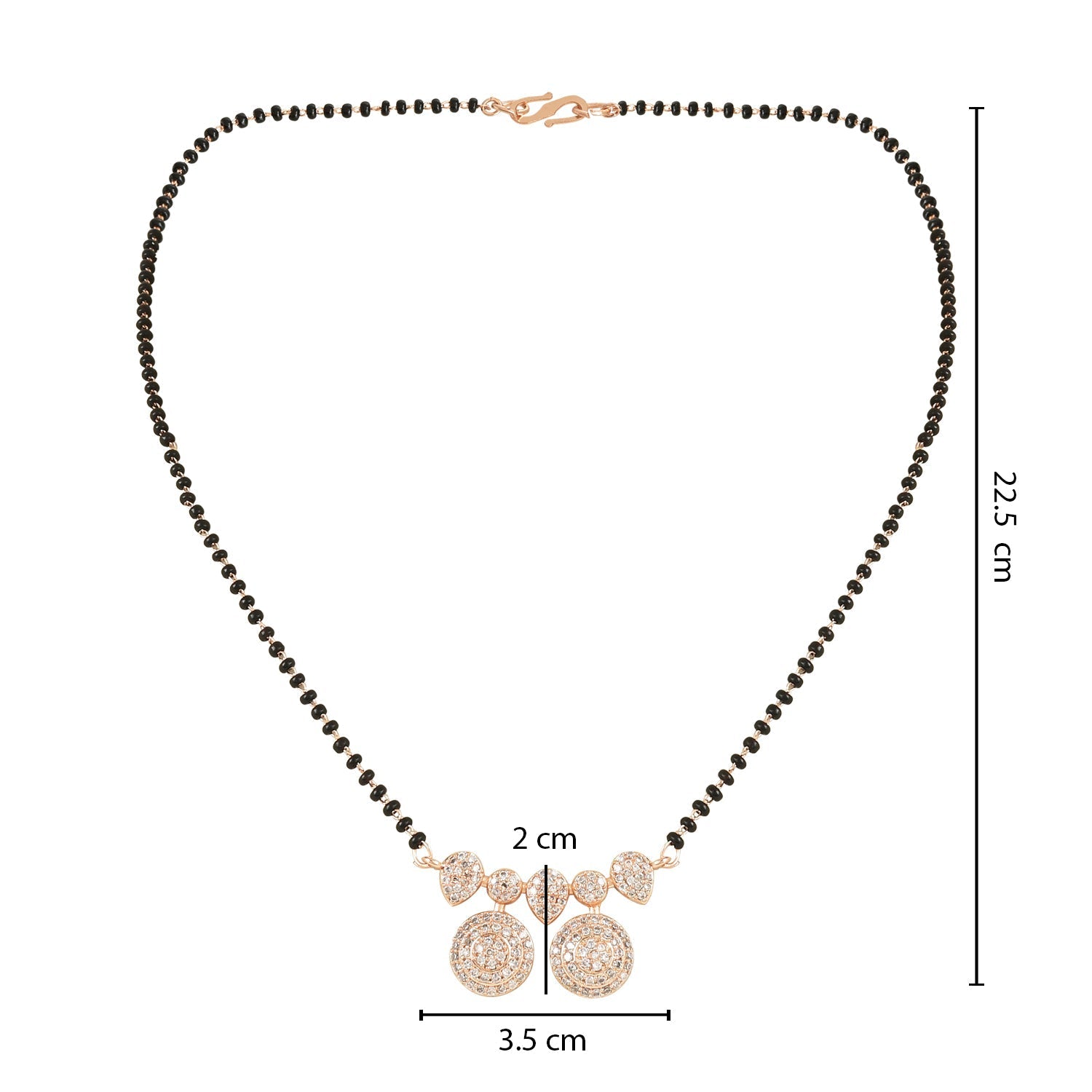 The black bead chain of the mangalsutra is designed to complement the pendant and adds a touch of tradition and culture to the piece. The black beads are believed to have protective and auspicious properties in Indian culture, making this mangalsutra a meaningful and symbolic piece of jewelry. This Rose Gold Plated Traditional Single Line American Diamond Pendant with Black Bead Chain Mangalsutra is perfect for women who appreciate the beauty of traditional Indian jewelry with a modern twist. It is a versatile piece that can be worn with a variety of outfits and is sure to make a statement wherever it is worn.
