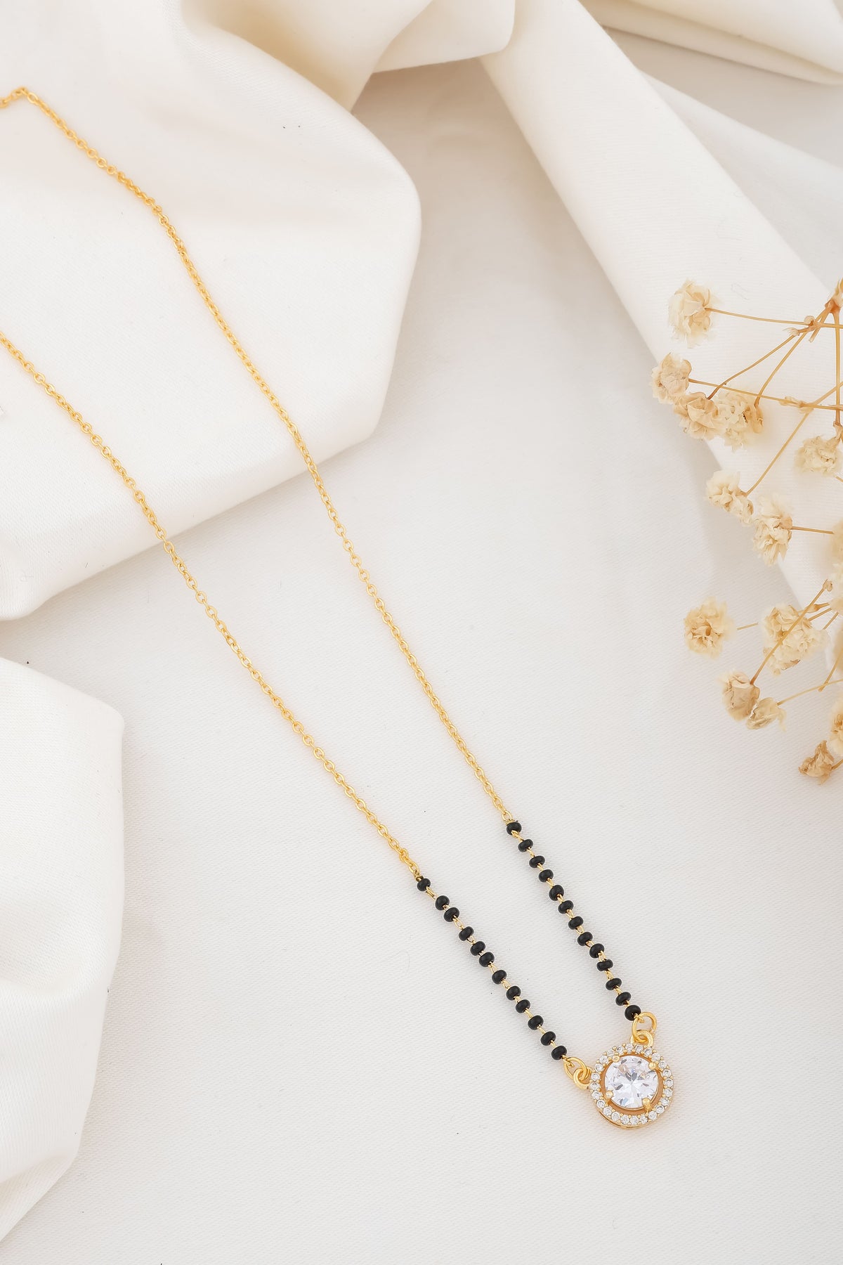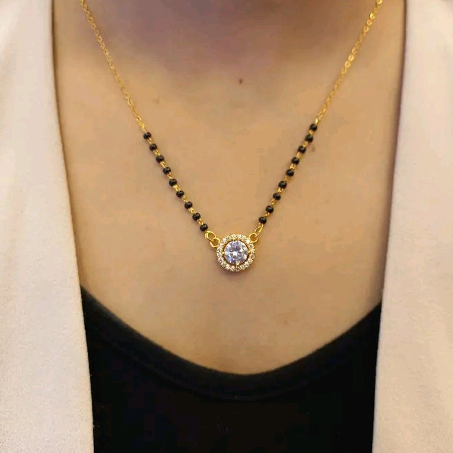 This Exquisite Mangalsutra Is A Perfect Blend Of Tradition And Modern Elegance. Designed For The Modern Indian Woman, It Features A Delicate Gold-Plated Chain Adorned With Classic Black Beads, A Cultural Symbol Of Love, Prosperity, And Marital Bliss. The Black Beads Are Spaced Evenly Along The Chain, Interspersed With Small Gold Accents For A Refined Touch.