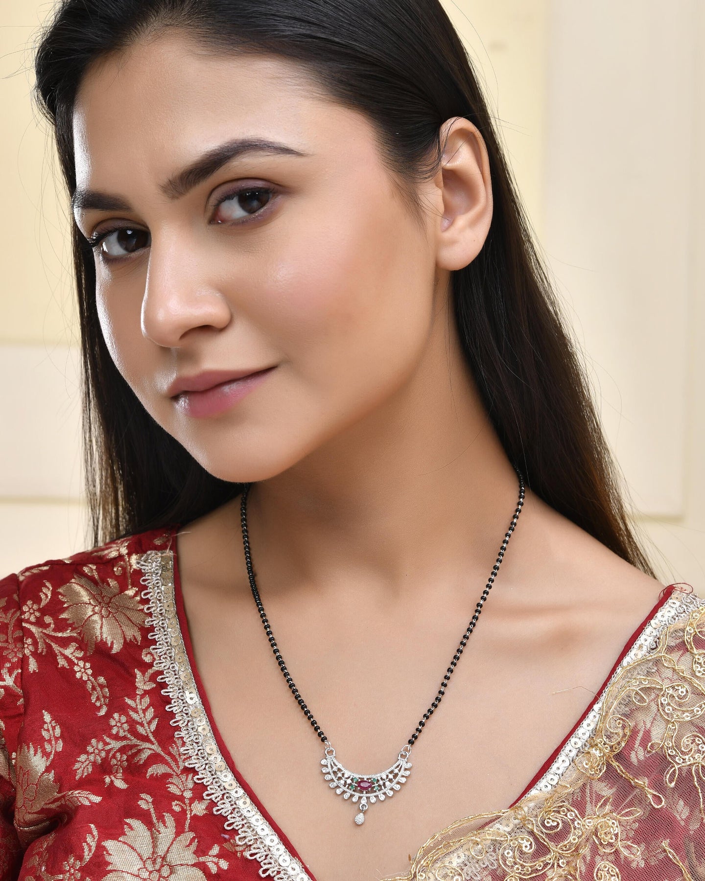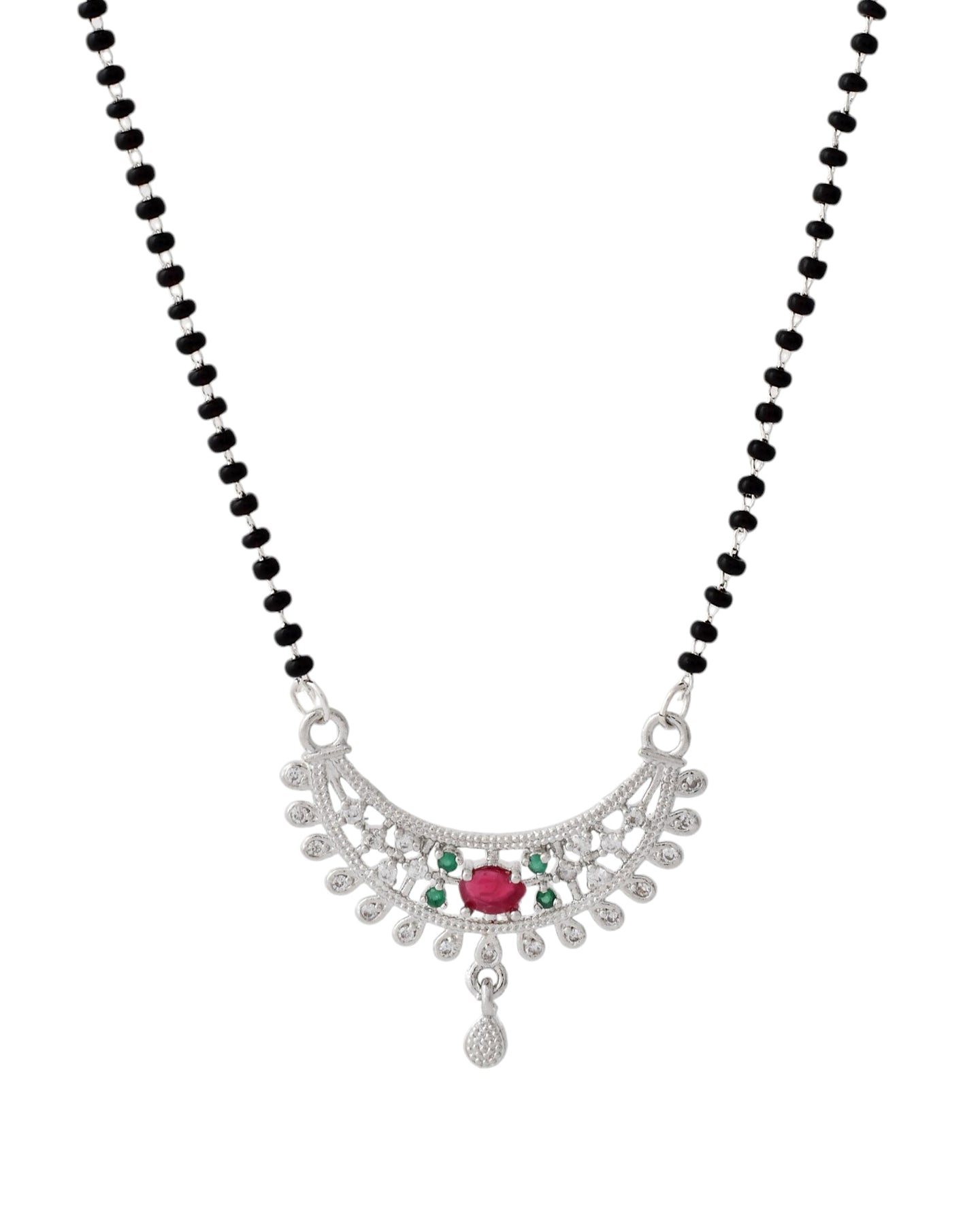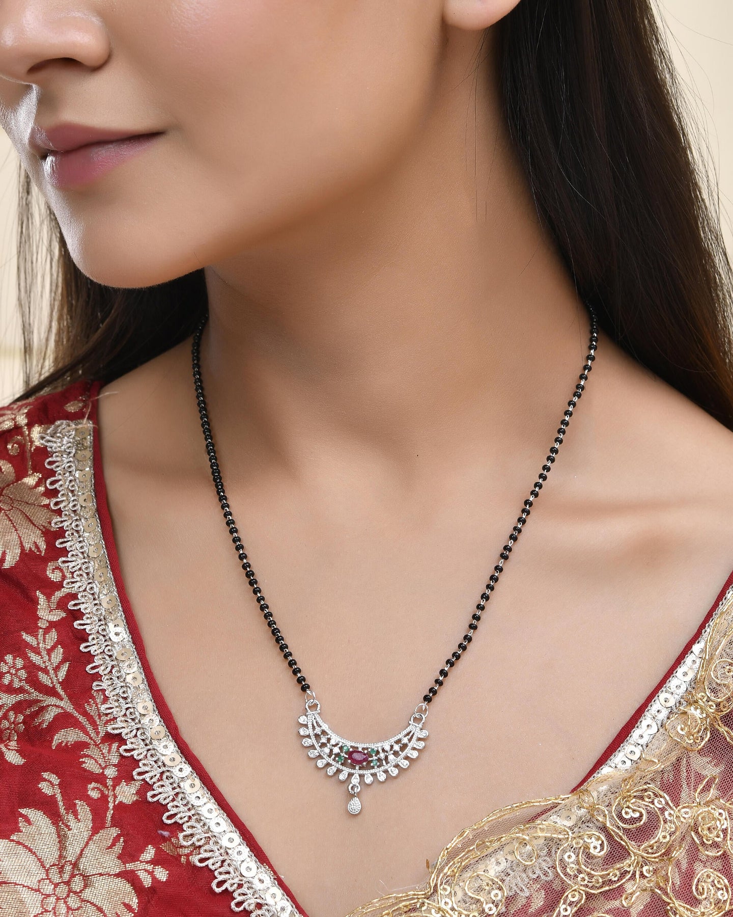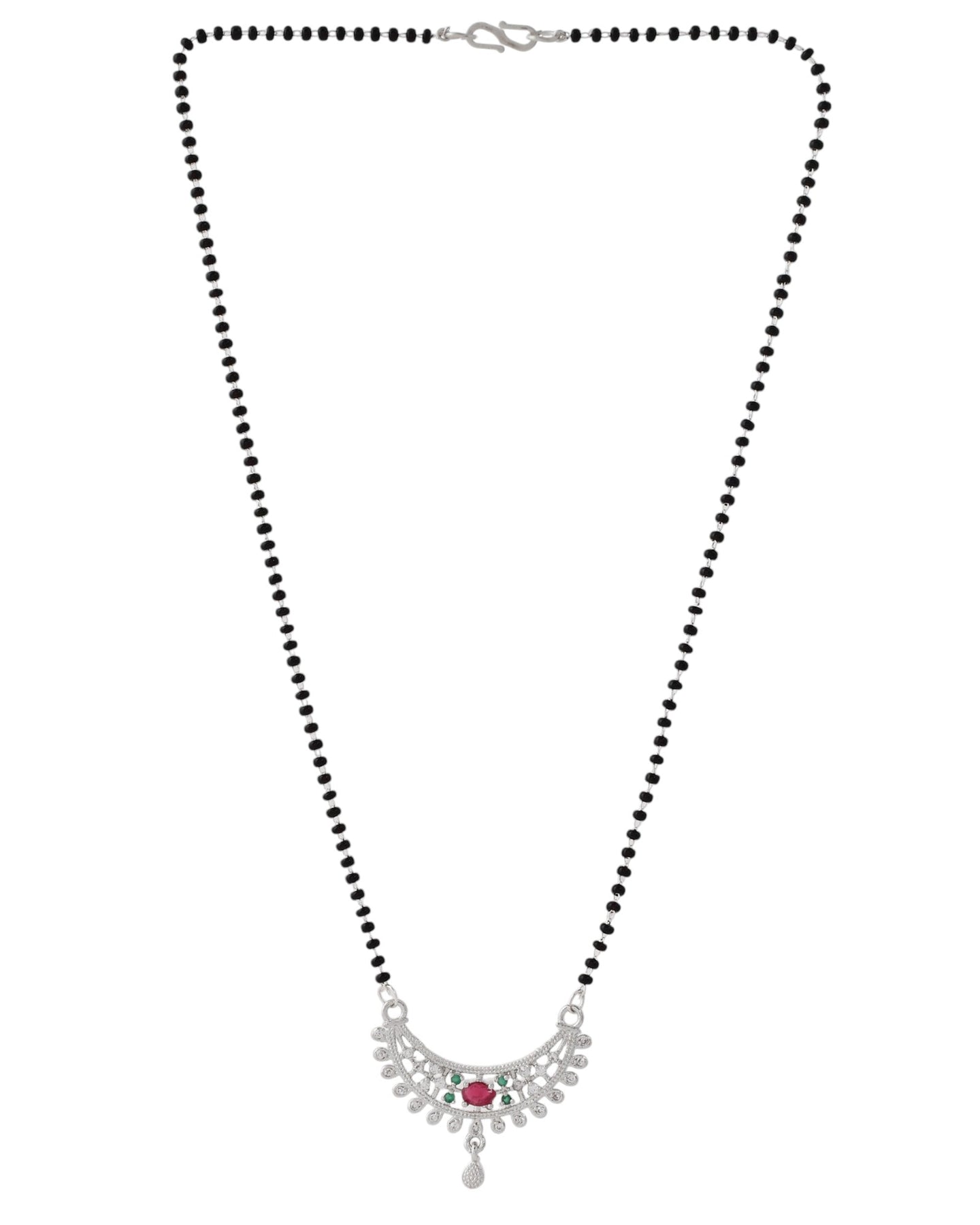 Celebrate The Beauty Of Tradition With A Touch Of Modern Elegance! This Silver-Plated Mangal Sutra Features A Delicate Black Bead Chain Paired With A Floral-Inspired Pendant Adorned With Sparkling White Stones, A Vivid Ruby-Red Centerpiece, And Emerald-Green Accents — Symbolizing Love, Prosperity, And Strength.