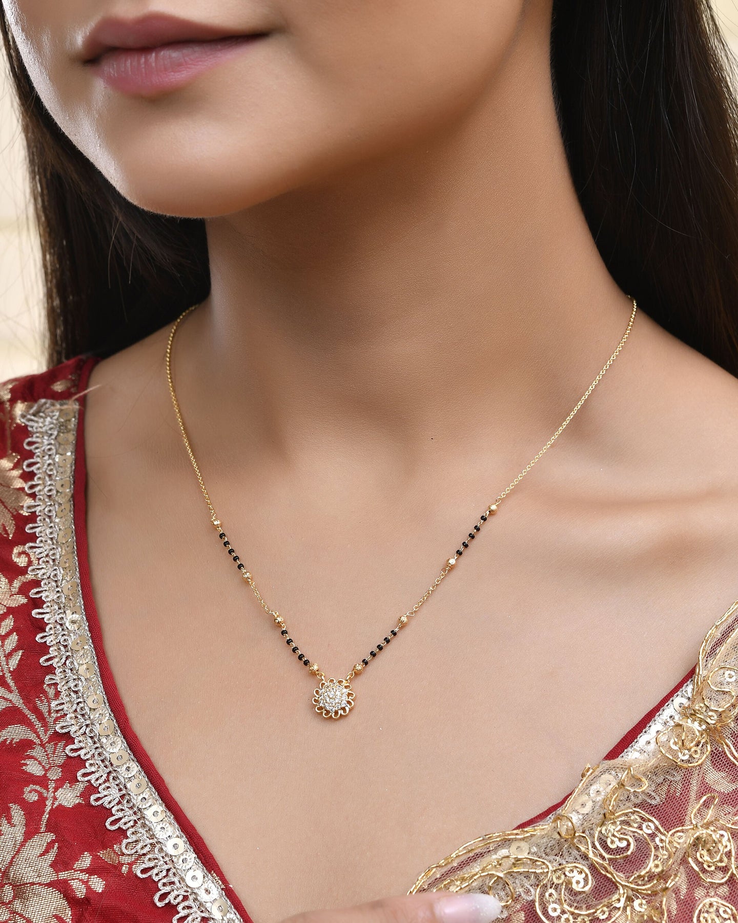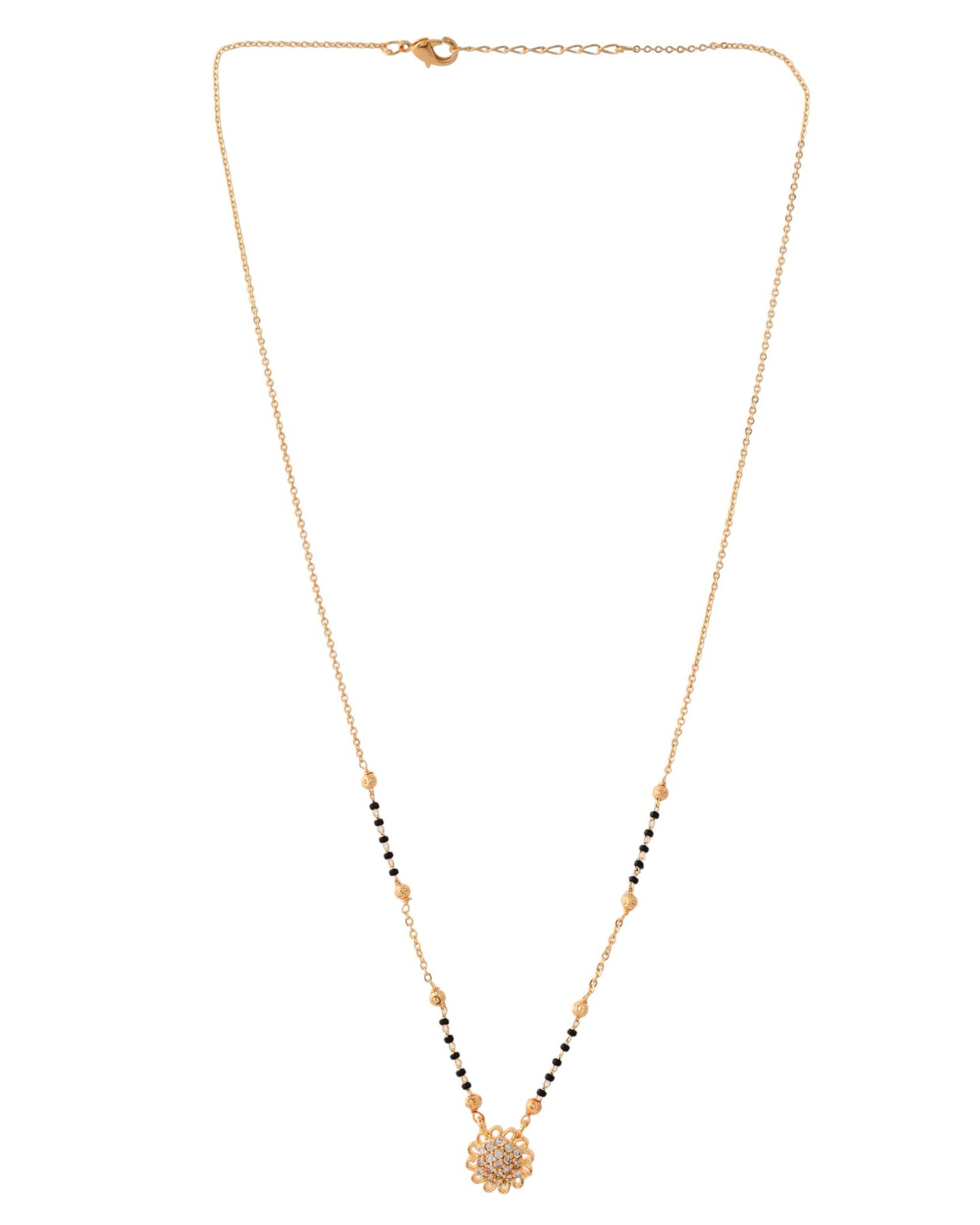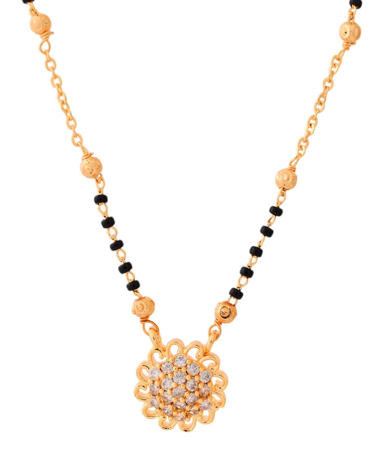 Embrace Tradition With A Modern Twist! This Stunning Gold-Plated Mangal Sutra Features A Delicate Dual-Chain Design Adorned With Classic Black Beads And Golden Accents. The Centerpiece Is A Gorgeous Floral Pendant Encrusted With Sparkling White Stones, Symbolizing Blossoming Love And Prosperity.
