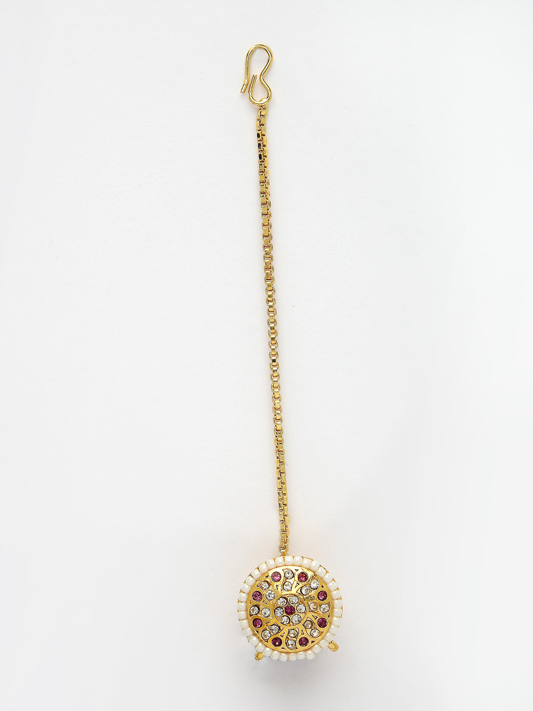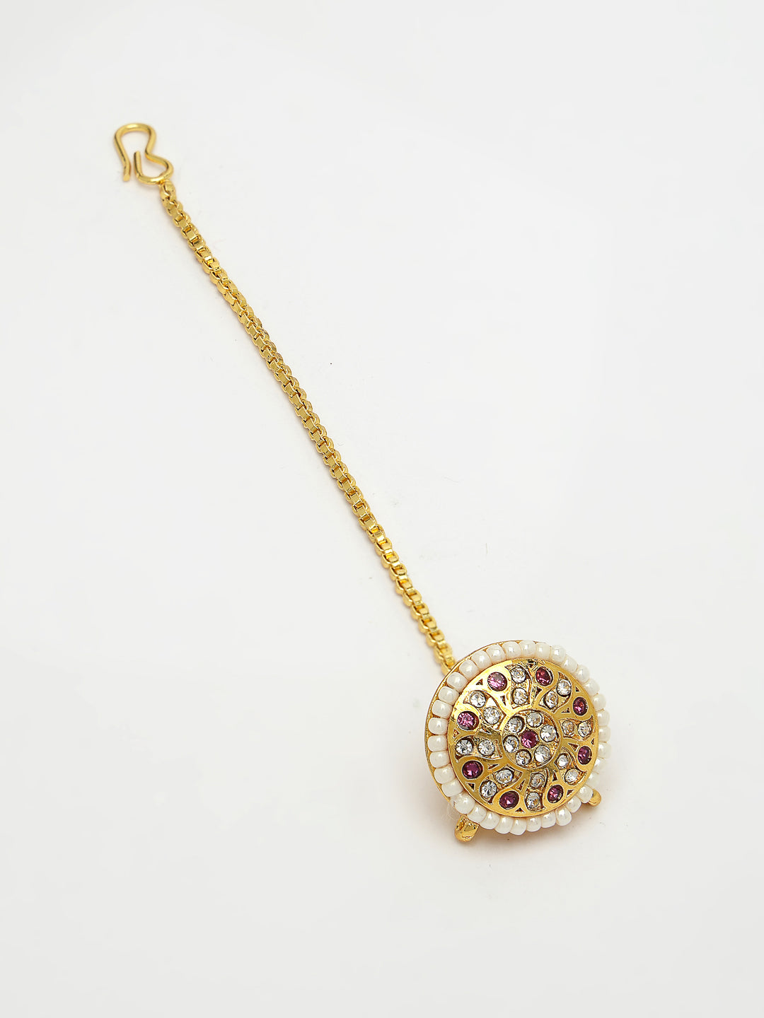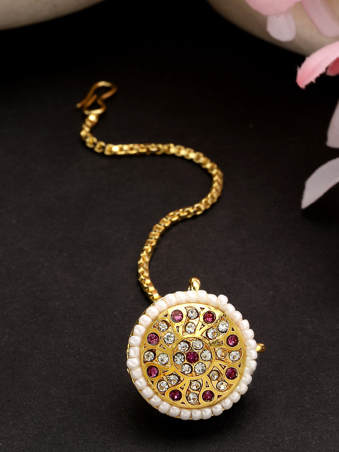 Style Note: The NVR Women Gold-Plated CZ Stone-Studded Borla Maang Tikka is a stunning piece of traditional Indian jewelry. Crafted with intricate detail and adorned with CZ stones, this Maang Tikka features a borla design, which is characterized by its central pendant that hangs on the forehead. The gold plating adds a touch of elegance and richness, making it perfect for weddings, festivals, and other special occasions. It enhances the bride's attire with cultural significance and adds a regal charm to the overall look. Ideal for those who appreciate traditional craftsmanship and want to make a statement with their accessories.