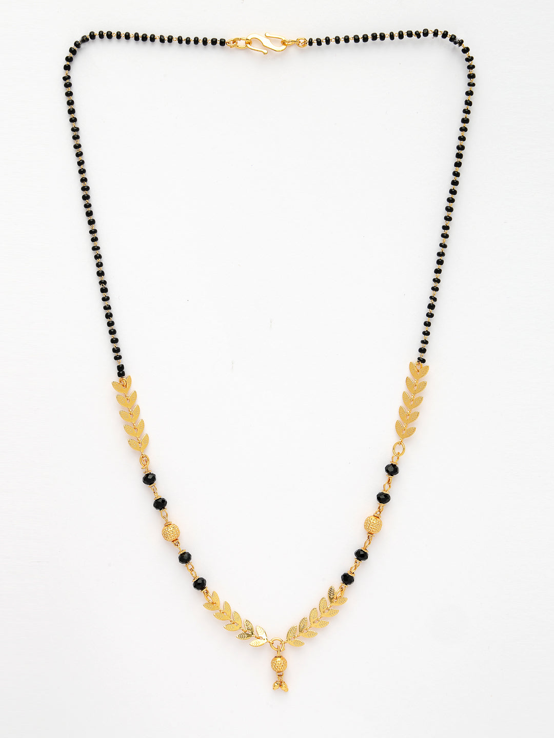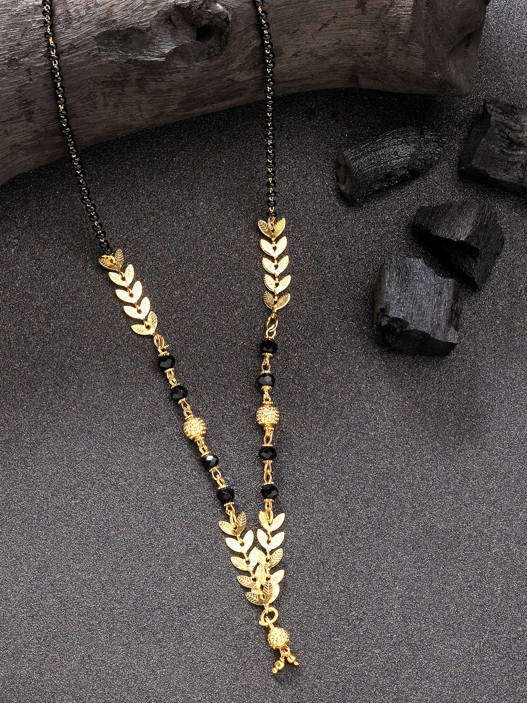 Style Note: The NVR Women Short Mangalsutra Designs Gold Plated & Black Beaded Mangalsutra is a stylish and elegant piece of traditional Indian jewelry. Crafted with gold plating and adorned with black beads, this mangalsutra offers a modern twist on a classic design. The short length makes it ideal for everyday wear, while the combination of gold and black beads adds sophistication and contrast. It symbolizes marital commitment and cultural heritage, making it a meaningful accessory for married women. Perfect for enhancing both traditional and contemporary outfits, this mangalsutra celebrates timeless beauty and marital bliss with its understated yet impactful design.