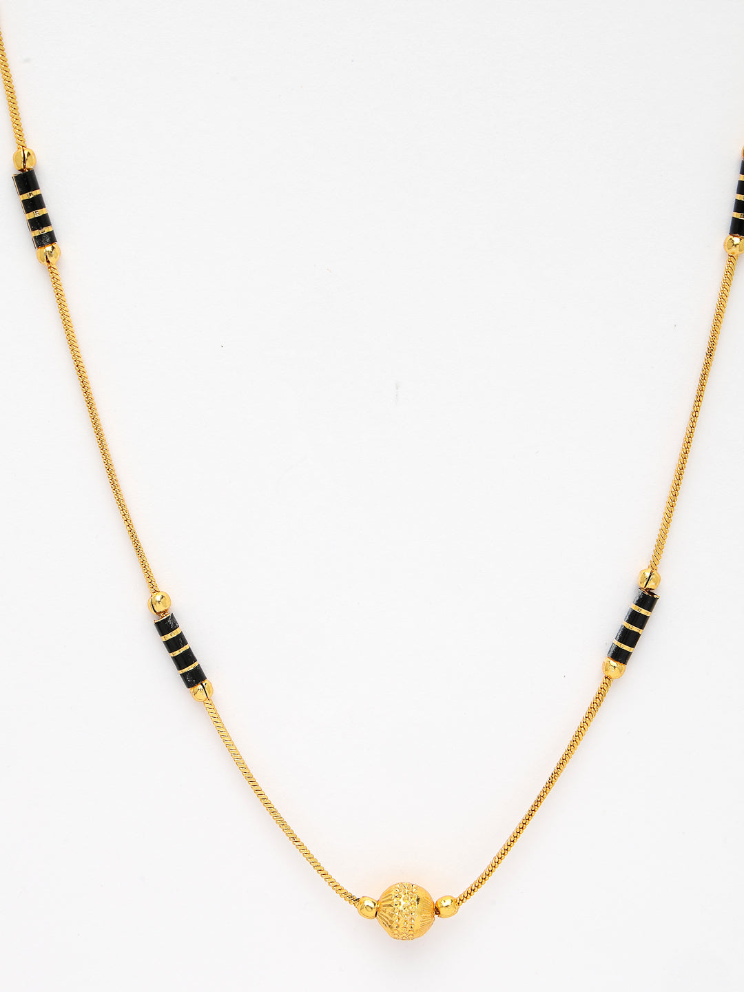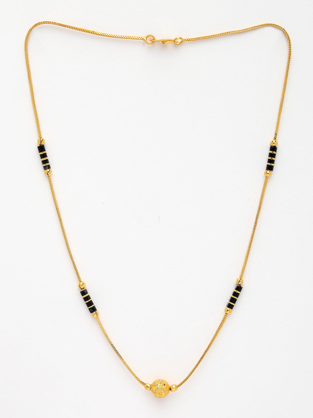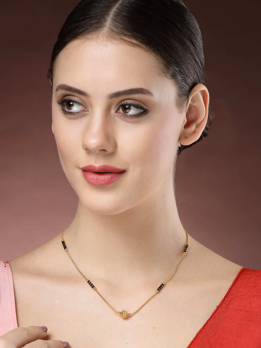 Style Note: The NVR Women Gold-Plated Mangalsutra is a timeless and essential piece of jewelry for married women in Indian culture. Crafted with gold plating, this mangalsutra typically features a black beaded chain with a central pendant, symbolizing marital commitment and auspiciousness. It is a traditional accessory worn daily by married women to signify their married status and is often adorned with intricate designs or motifs that hold cultural significance. The gold plating adds a touch of elegance and richness to the piece, making it a cherished and meaningful accessory that enhances the wearer's ensemble with its cultural and aesthetic value.