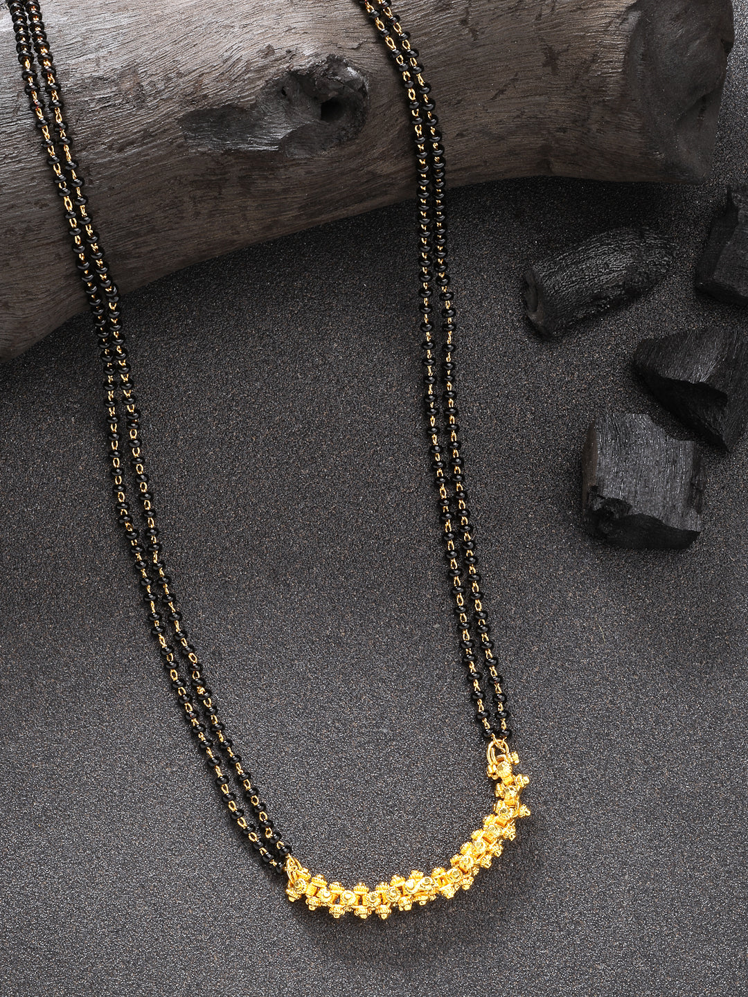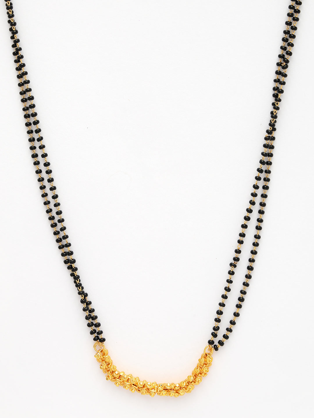Style Note: The NVR Women Gold-Plated Black Beaded Mangalsutra is a classic and elegant piece of traditional Indian jewelry. Crafted with gold plating and featuring a black beaded chain, this mangalsutra symbolizes marital commitment and cultural heritage. It is an essential accessory for married women, worn daily as a symbol of their married status and auspiciousness. The combination of gold plating and black beads adds a touch of sophistication and timeless beauty to the piece, making it a meaningful and revered item in Indian culture. Perfect for both traditional and contemporary attire, this mangalsutra enhances the wearer's ensemble with its symbolic and aesthetic significance.