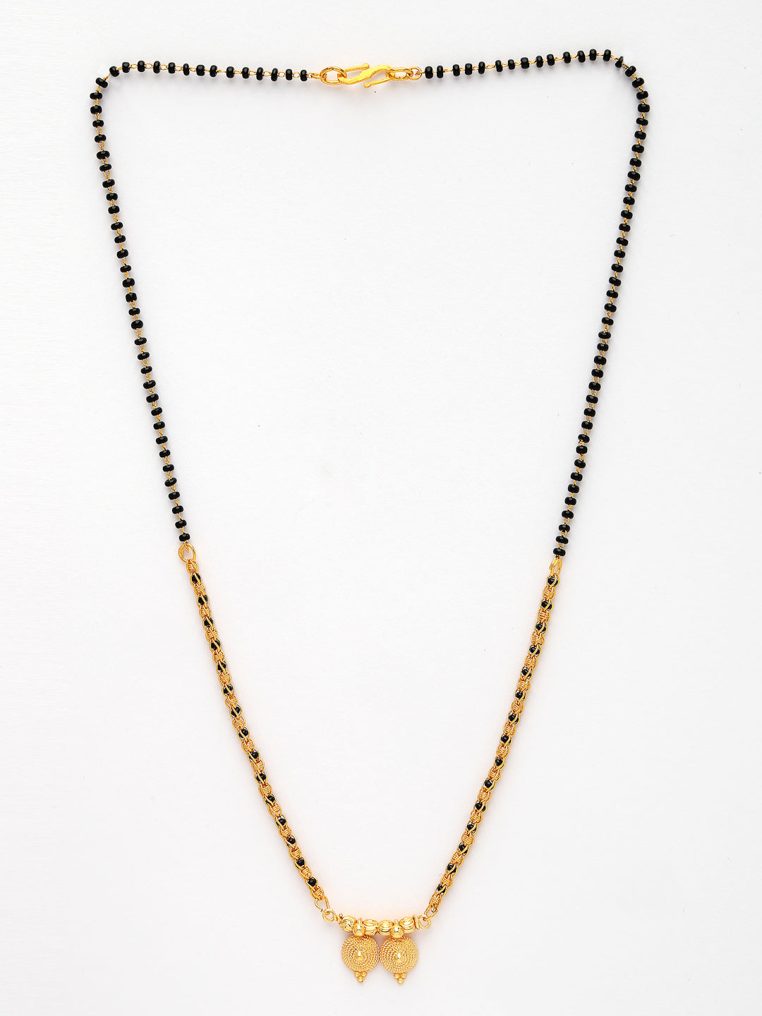 Style Note: The NVR Women Set of 5 Gold-Plated Black Beaded Mangalsutra is a traditional and elegant piece of jewelry that holds cultural significance in Indian weddings and traditions. It typically features a black beaded chain made of beads such as glass, metal, or other materials, symbolizing marital commitment and auspiciousness. The gold-plated finish adds a touch of elegance and richness to the piece, making it suitable for daily wear by married women to signify their marital status. This mangalsutra is not only a symbol of marriage but also a cherished accessory that enhances the wearer's traditional attire with its timeless design and cultural importance.