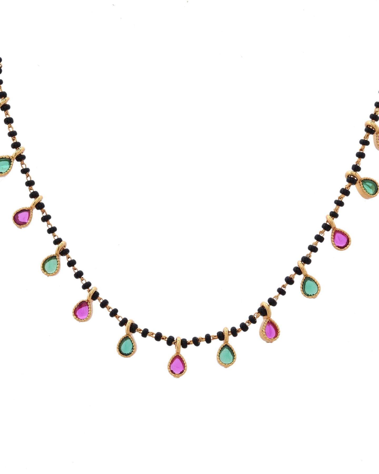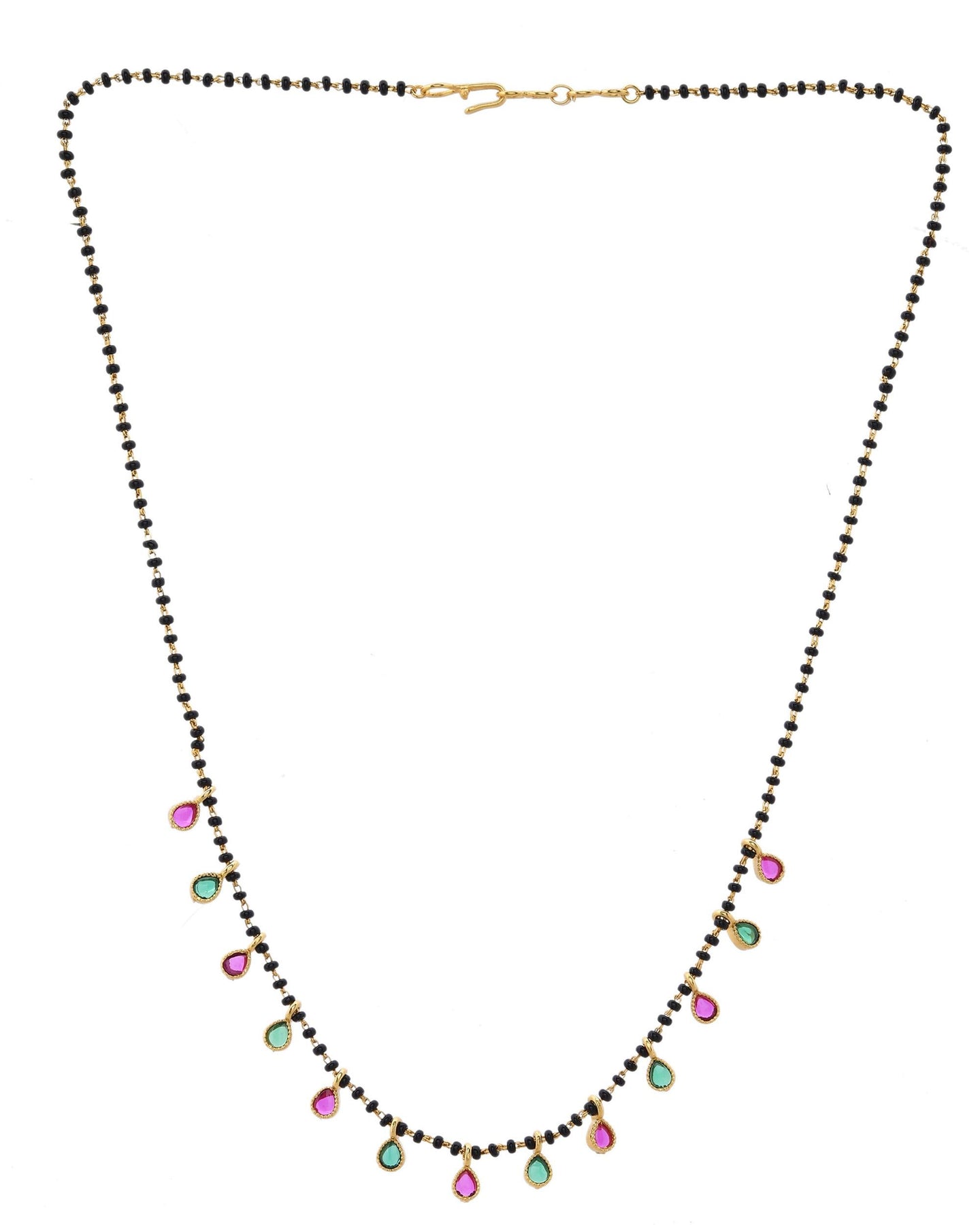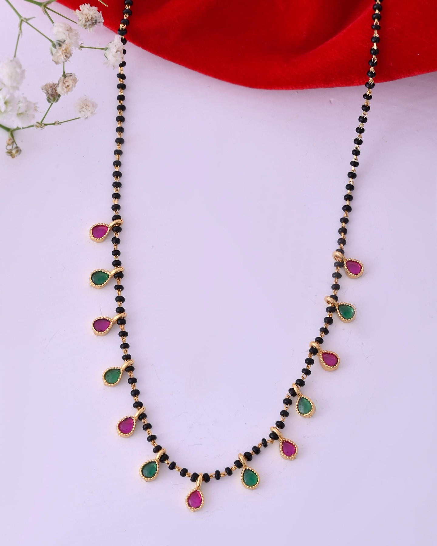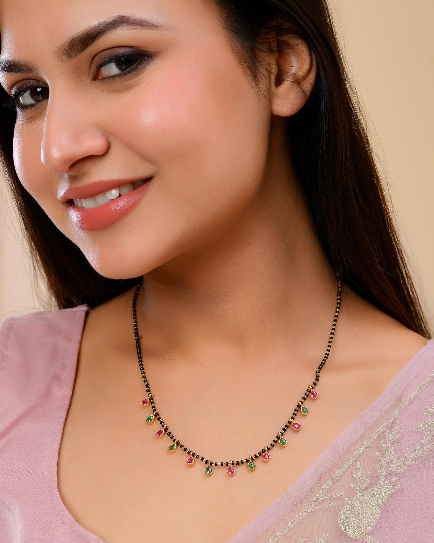 The Gold Plated Ad Studded Drop-Shaped Mangalsutra Is A Beautiful Fusion Of Tradition And Contemporary Design. The Drop-Shaped Pendant, Adorned With Sparkling Ad Stones, Offers A Graceful And Elegant Look. With Its Gold-Plated Chain, This Mangalsutra Adds A Touch Of Sophistication To Any Outfit. Perfect For Daily Wear Or Special Occasions, It’S A Symbol Of Love And Commitment.