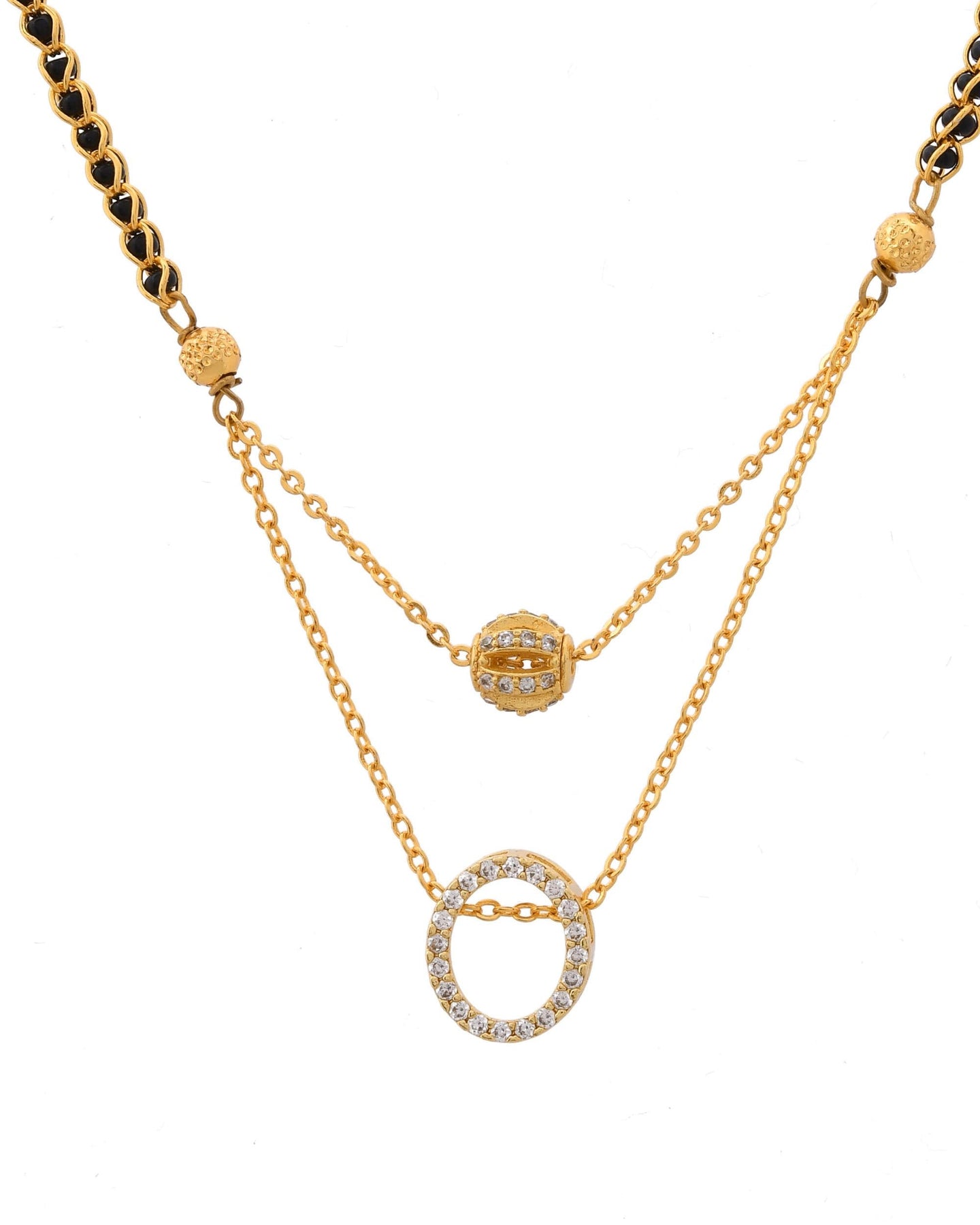 The Gold Plated Ad Studded Oval-Shaped Mangalsutra Is A Perfect Blend Of Elegance And Modern Design. The Oval Pendant, Studded With Sparkling Ad Stones, Offers A Refined, Sophisticated Look. The Gold-Plated Chain Enhances Its Timeless Appeal, Making It Ideal For Both Daily Wear And Special Occasions. A Beautiful Symbol Of Love And Commitment, This Mangalsutra Adds Grace To Any Outfit.