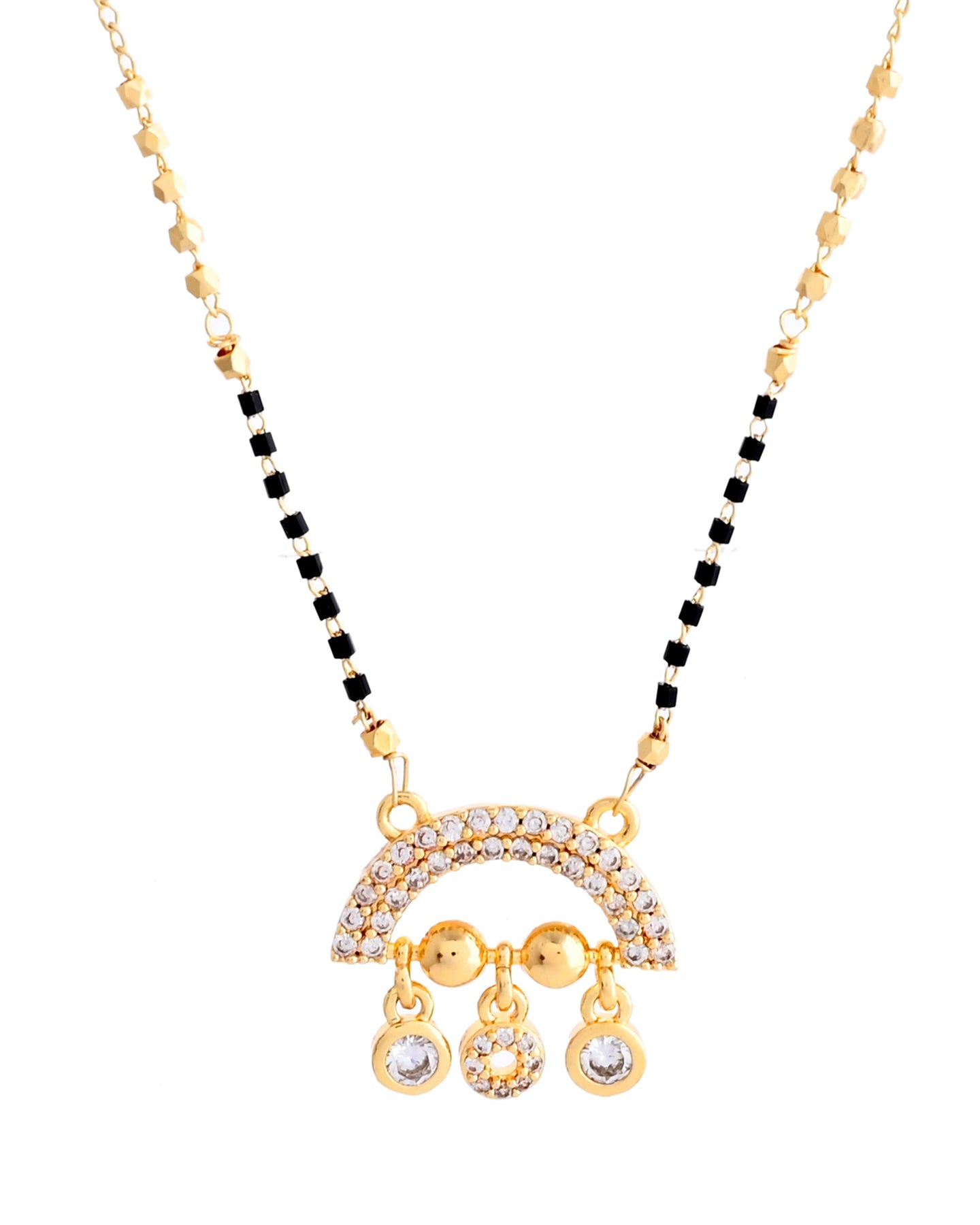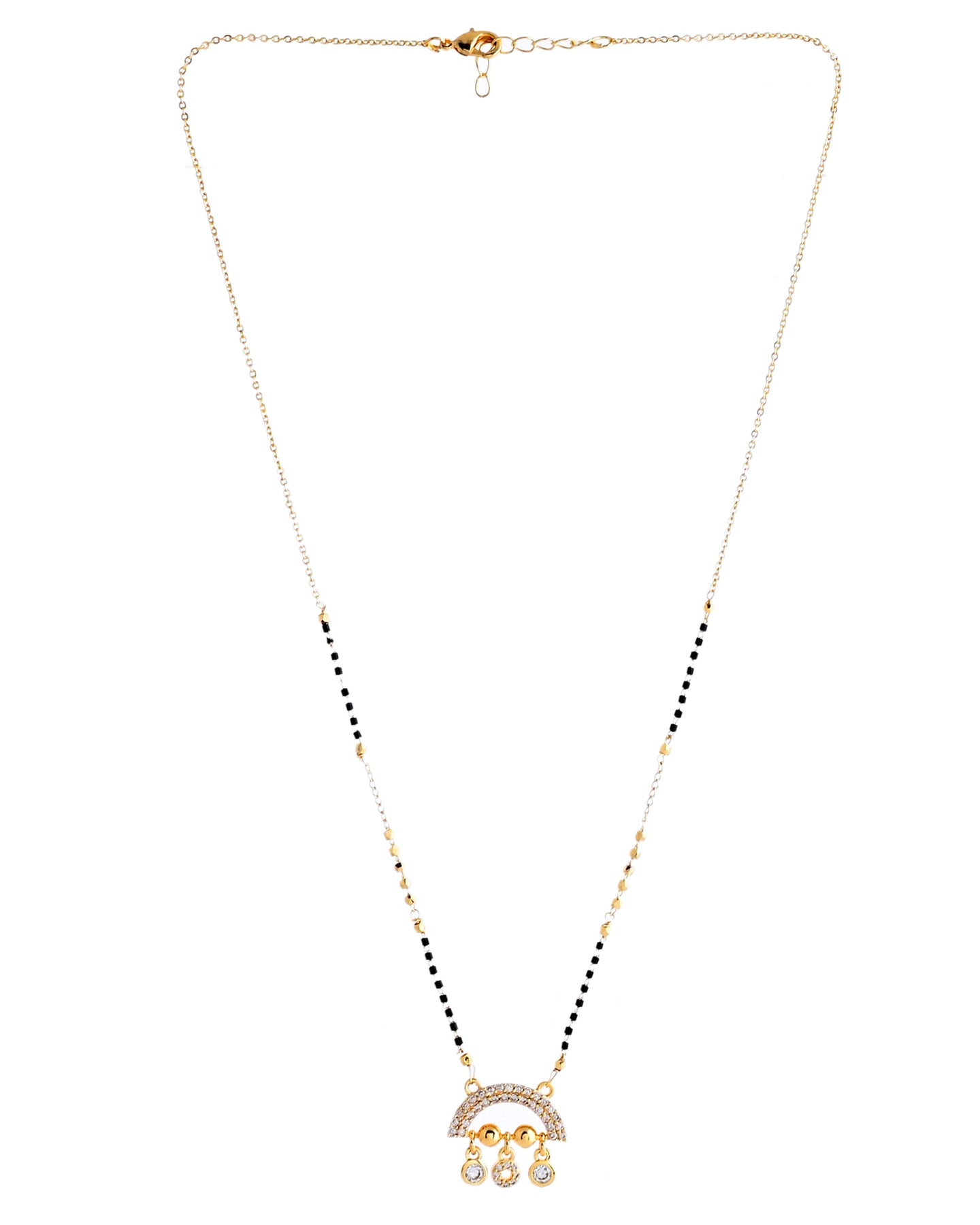 This Gold Plated Ad Studded Half Done Shape Mangalsutra Blends Traditional Symbolism With Modern Elegance. Featuring Stunning Ad Stones And A Unique Half-Done Shape, This Mangalsutra Adds A Refined Touch To Your Look. Perfect For Weddings Or Special Occasions, It Embodies Grace And Beauty, Making It A Timeless Piece That Enhances Your Jewelry Collection With Elegance And Charm.