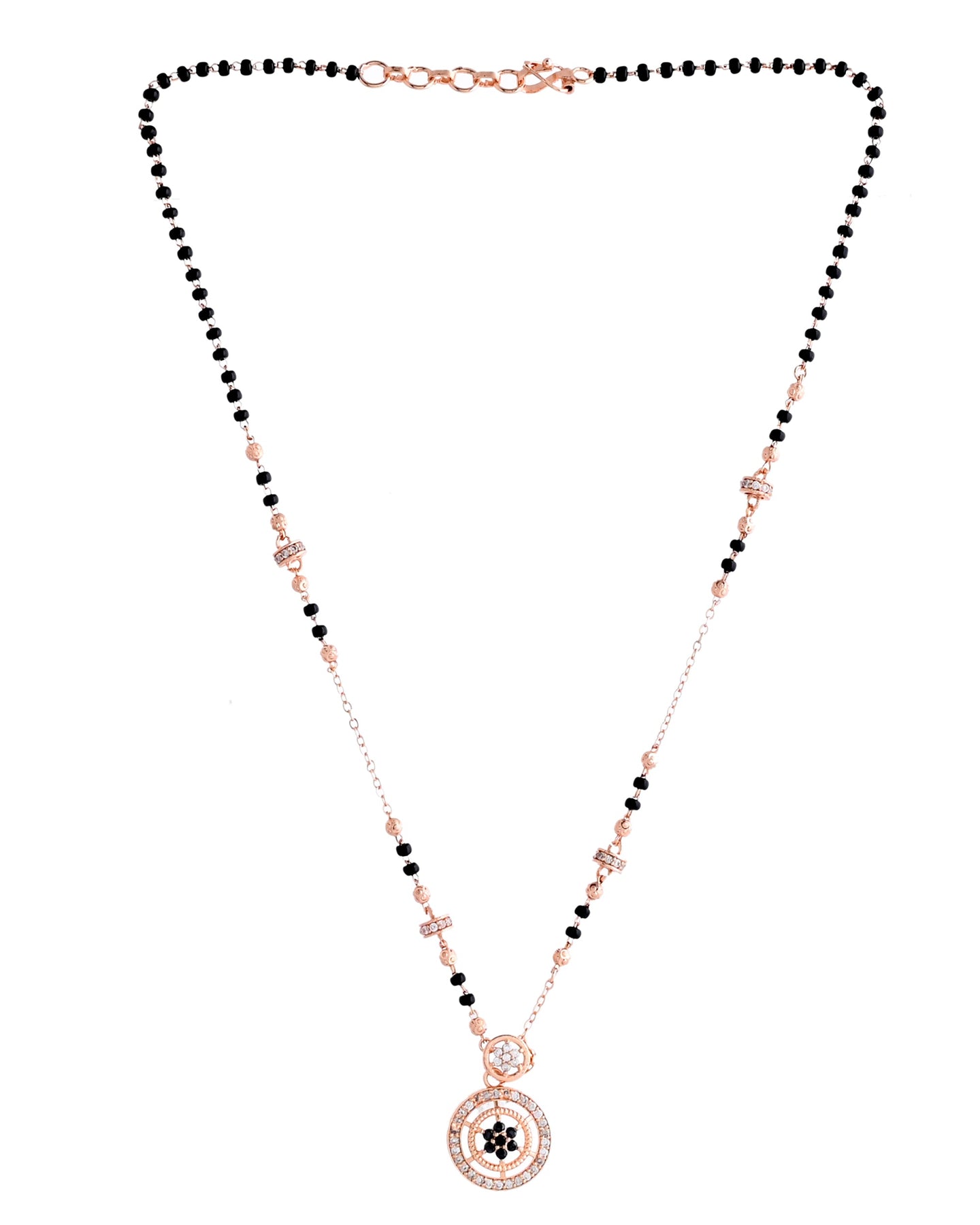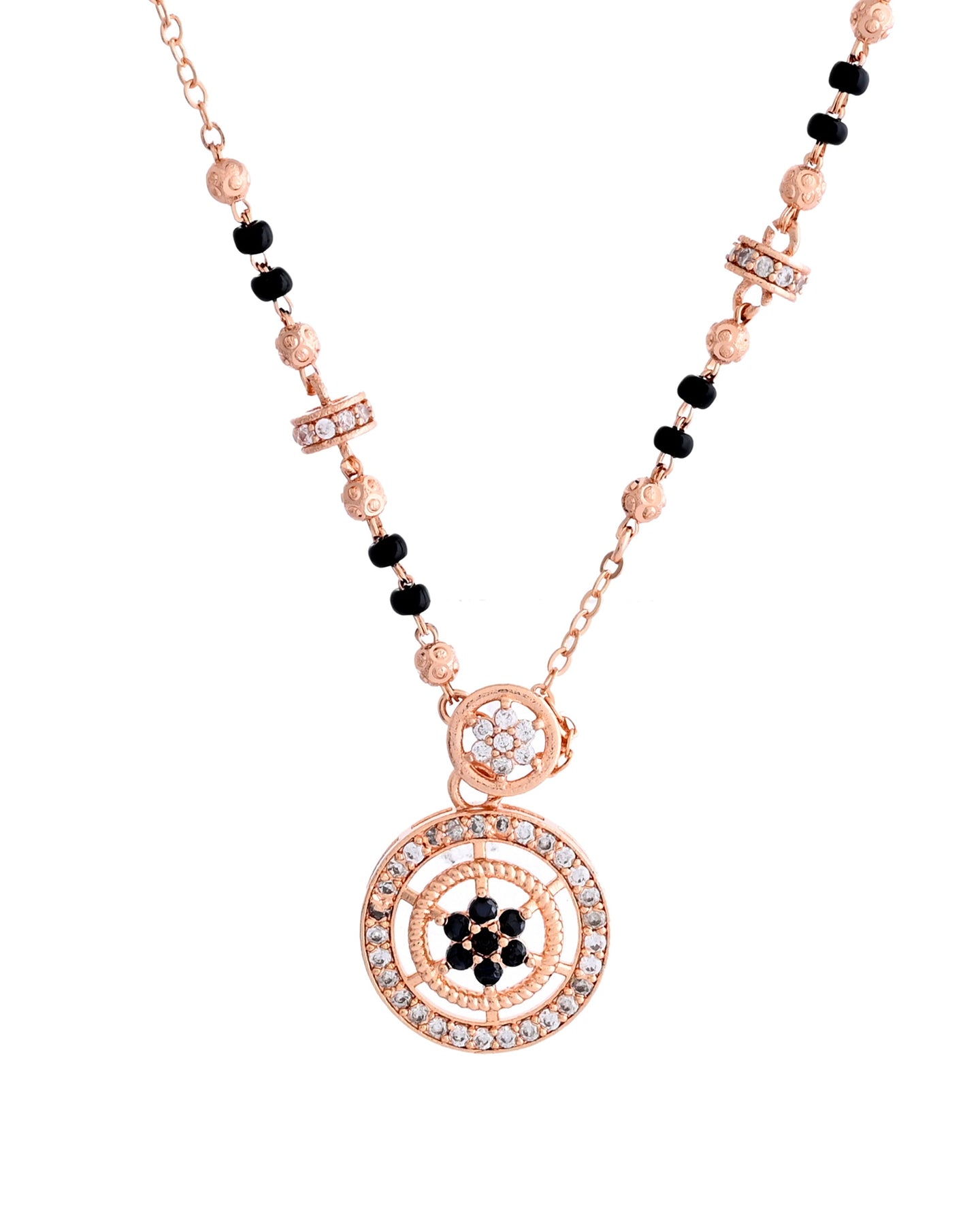 This Rose Gold Plated Stone Studded Circular Mangalsutra Combines Elegance With Modern Design. Featuring A Circular Pendant Adorned With Sparkling Stones And Set In A Beautiful Rose Gold-Plated Finish, It Adds A Sophisticated Touch To Any Outfit. Perfect For Weddings, Anniversaries, Or Special Occasions, This Mangalsutra Symbolizes Love And Commitment While Offering A Timeless And Stylish Appeal.