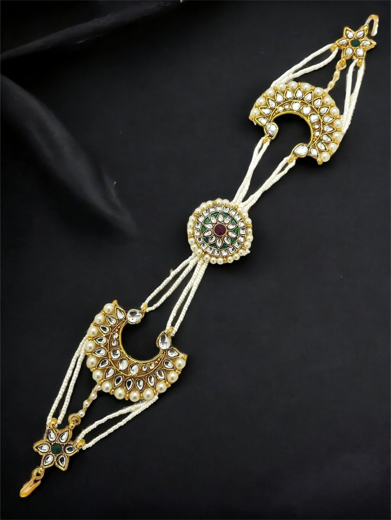 Mughal Chandbali Style , A Captivating Head Jewelry Piece Designed To Adorn Your Bridal Ensemble With Grace And Sophistication. Kundan And Pearl Mathapatti Is Set To Shimmer And Sparkle , Reflecting The Beauty Of Traditional Indian Craftsmanship. This Exquisite Sheeshphool Features A Delicately Cascading Pearl String Patterns Along Your Hairline To Create A Regal Aura. Whether Worn As The Crowning Jewel Of Your Traditional Ensemble Or To Elevate Your Look For A Special Occasion, This Mathapatti Is Sure To Leave A Lasting Impression.