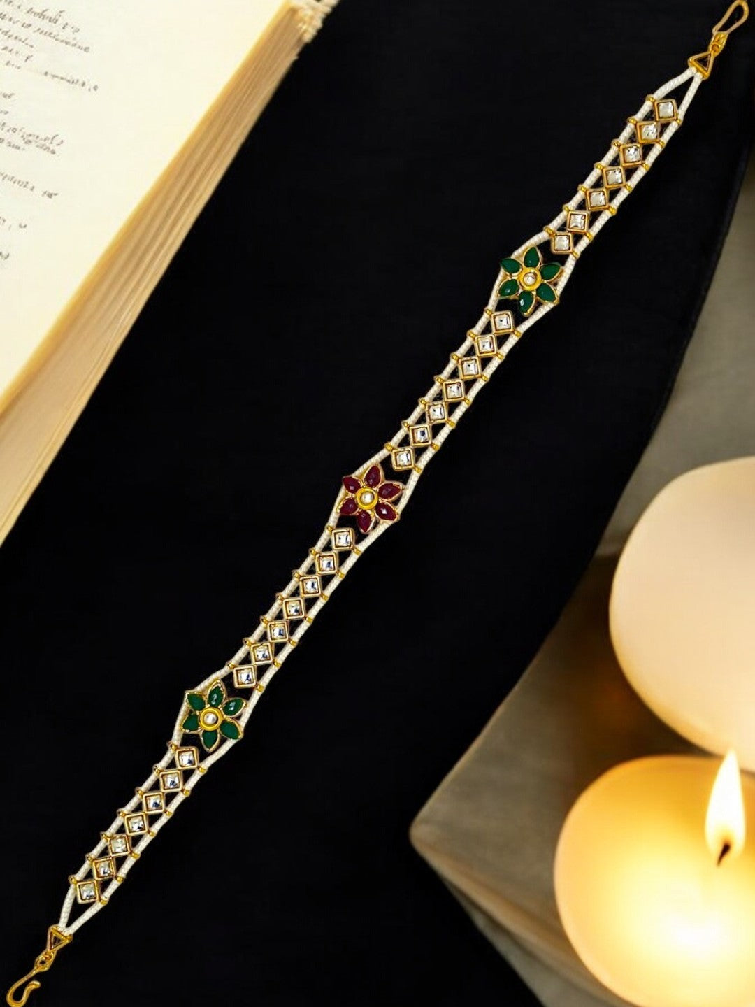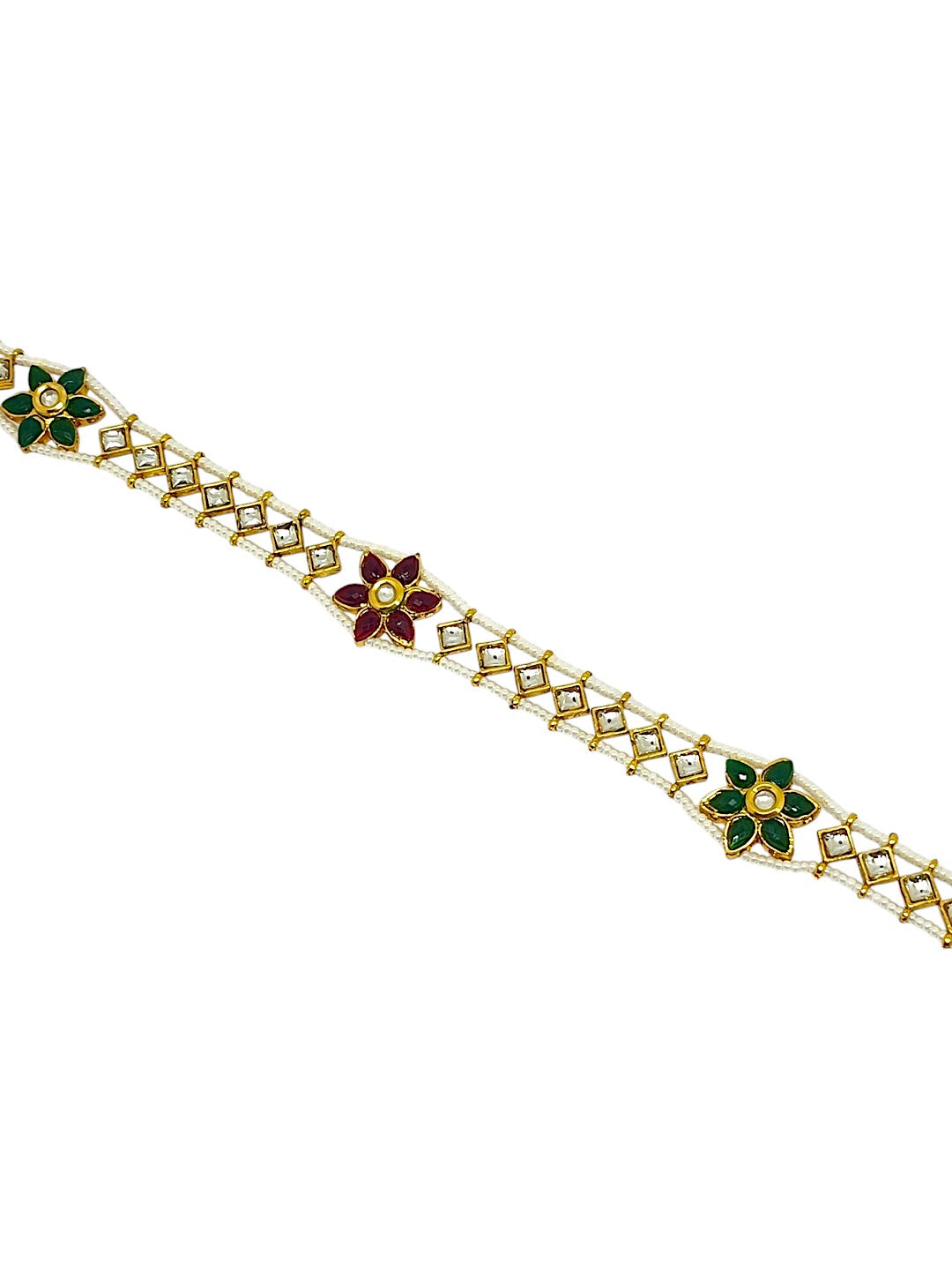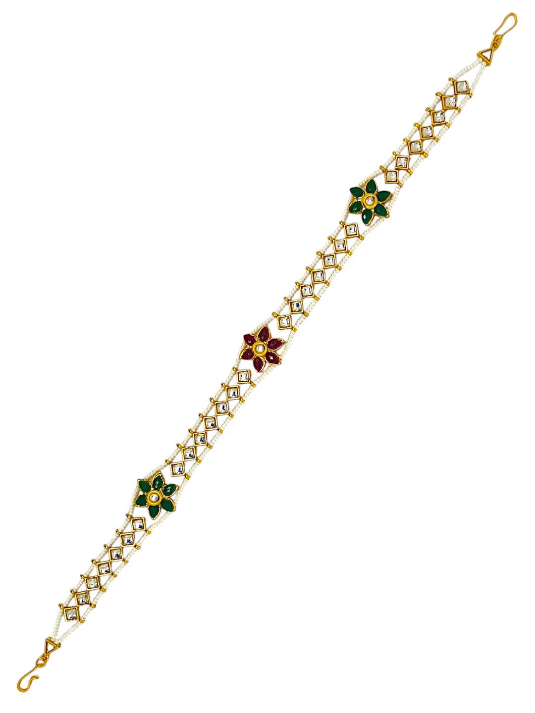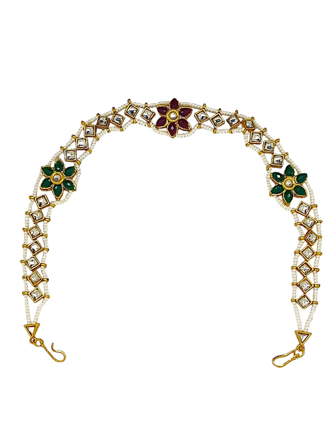 Gold-Toned Pink,Green And White Artificial Kundan-Studded And Deaded Matha Patti. Secured With Hook Closure