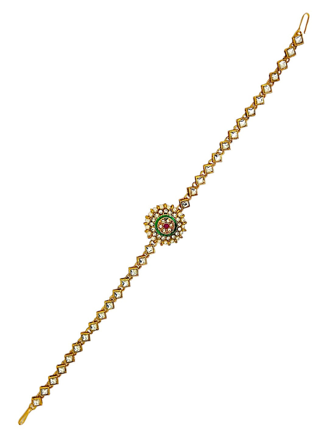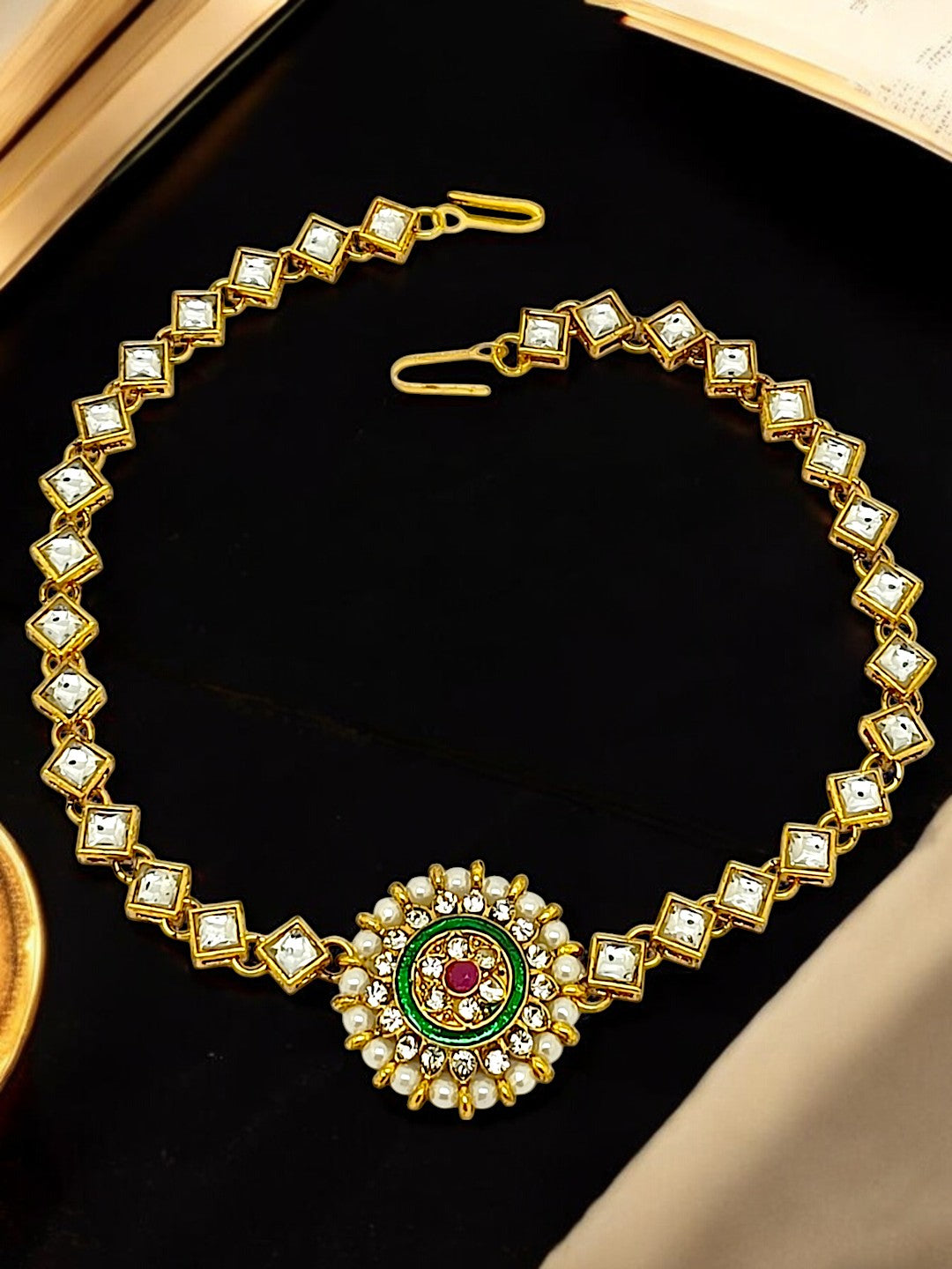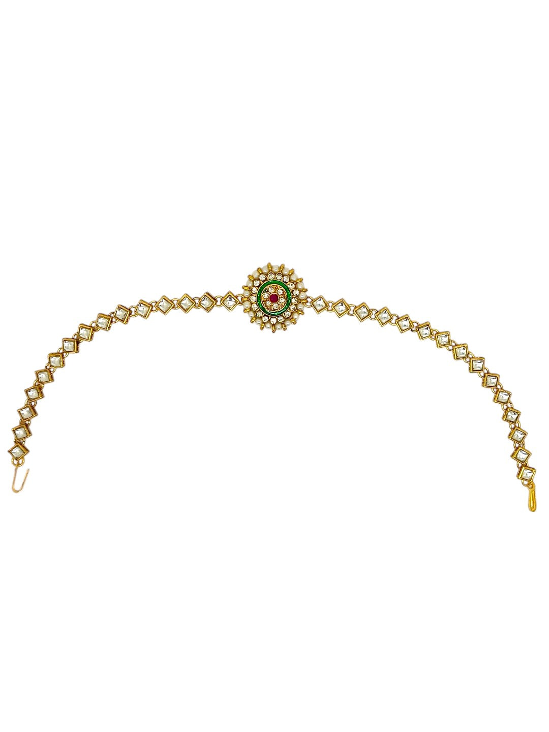 Gold-Toned Round Shape Matha Patti Studded With Cz Stone Kundan And Beaded. Secured With Hook Closure.