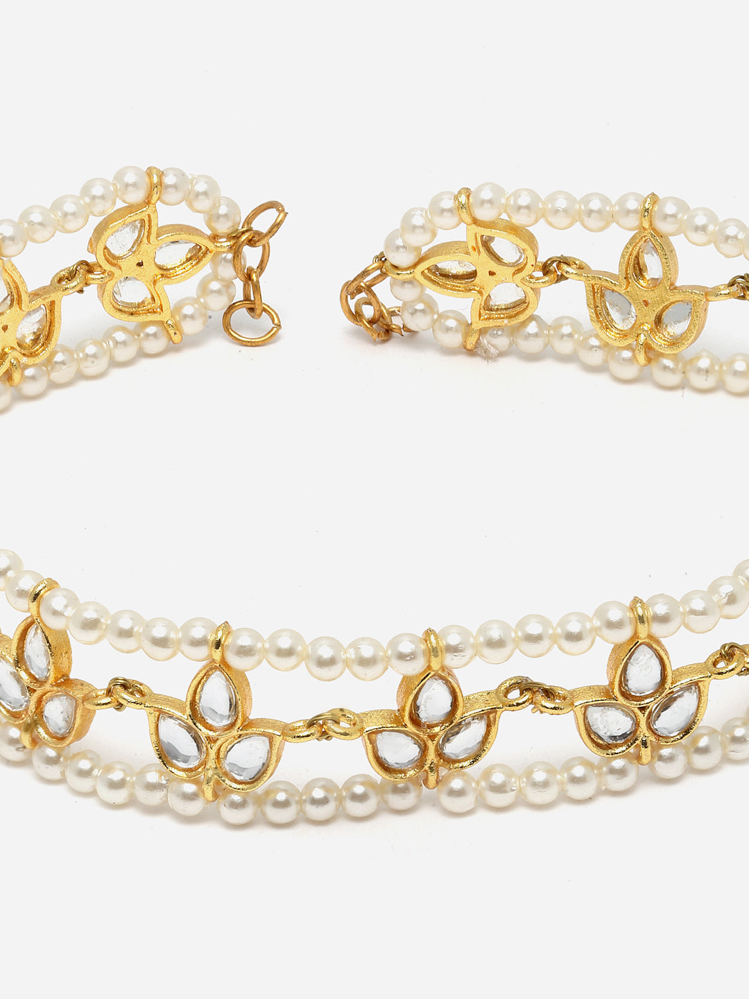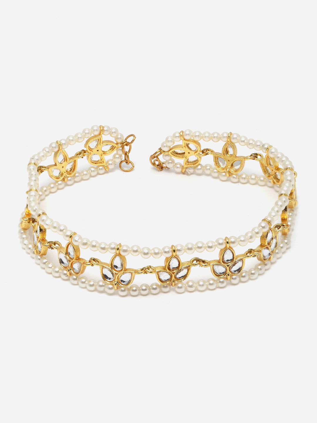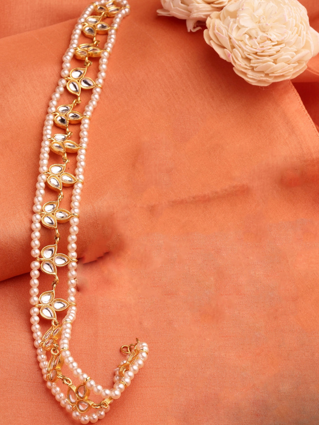 Kundan Head Band With Pearl Highlight Is Simple And Elegant Pc Which Can Be Used In Daily Basis... Inspired By Deepika Paducone Look Of Cannes 2022.; Category Of Jewellery Is Hair Jewellery; Sub Category Is Head Chain; Ideal For Women; Color Is Gold, White; Gemstones Used - Kundan, Pearls, Natural Stones; Plating Is Gold-Plated; Base Metal Is Alloy; Other Material Used - Adjustable Chain; Size Is Freesize; Adjustable - Yes; Weight Is 23 Gms; Mesaurements - Length Of Head Chain =29 Cm; Width Of Head Chain = 2 Cm; Adjustable - Yes; Content 1 Head Chain