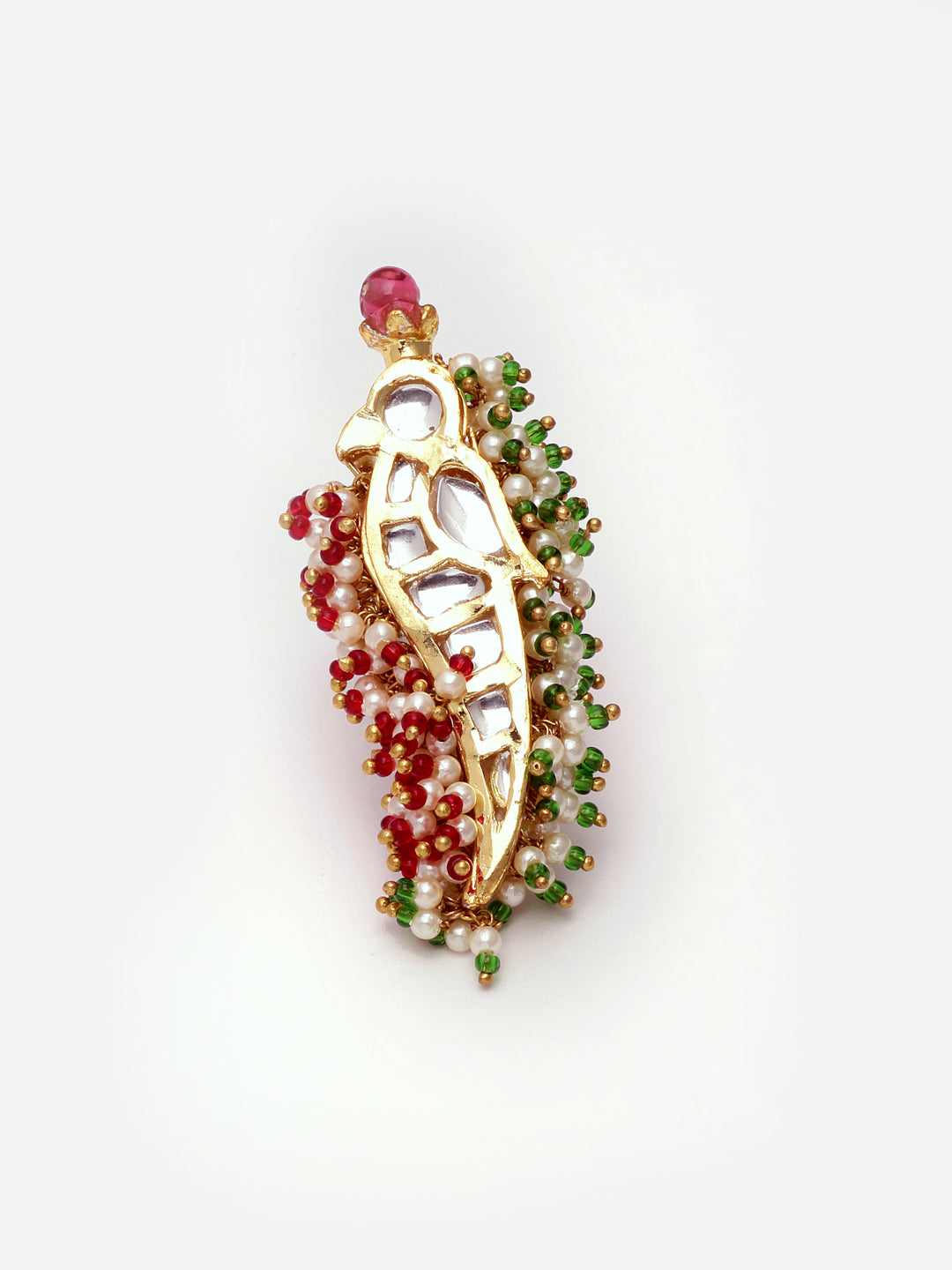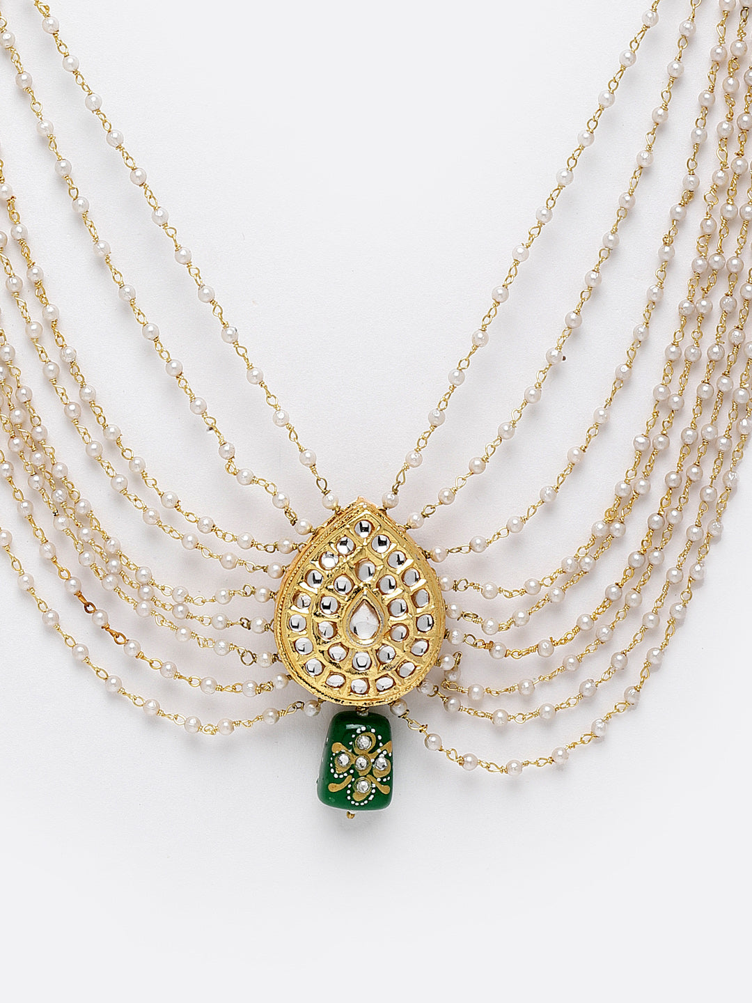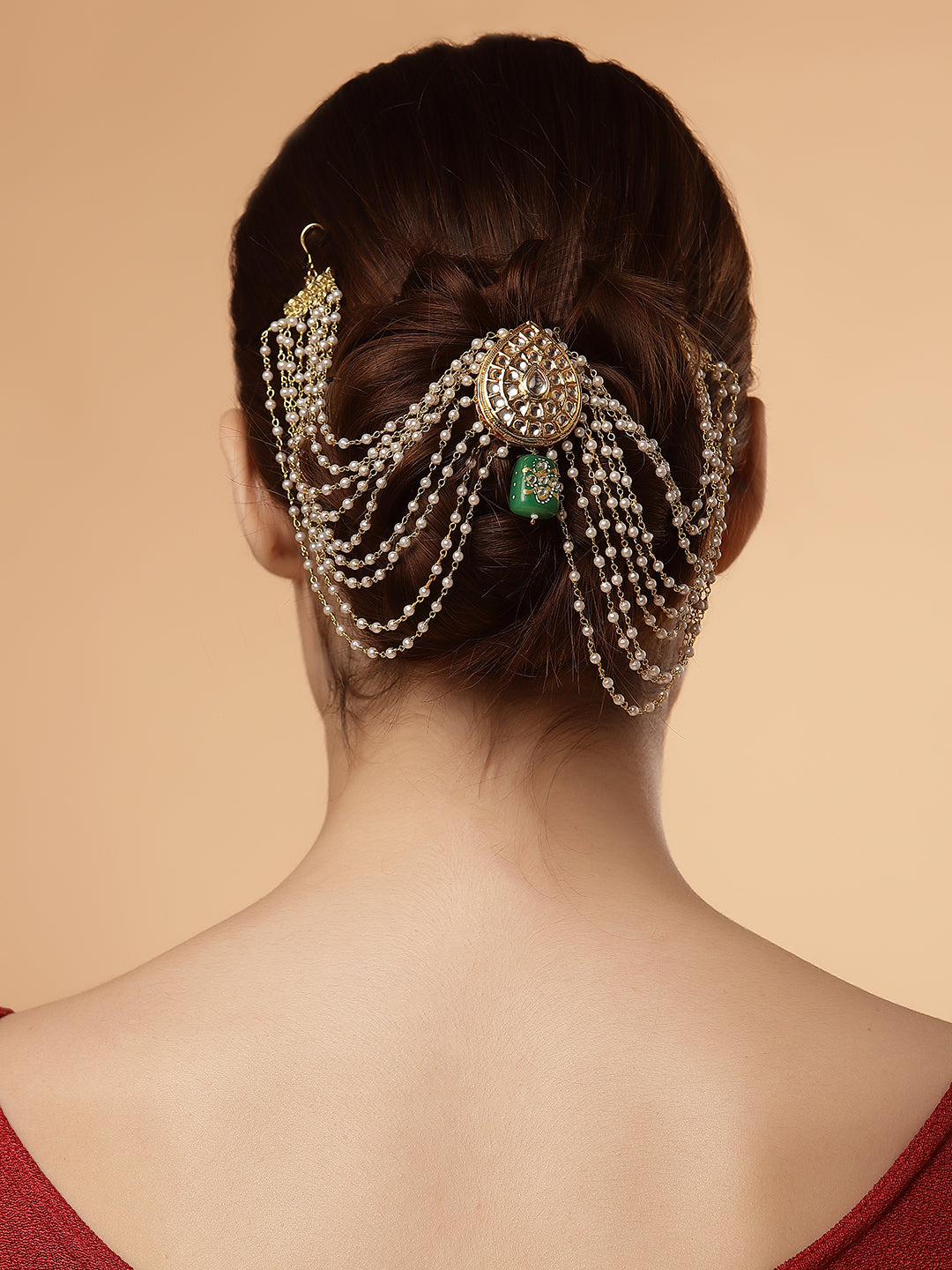 Handcrafted Kundan With Pearl Drop Juda (Hair Accesori) Is What Makes U Flaunt Best Version Of You This Festive Season.; Category Of Jewellery Is Hair Jewellery; Sub Category Is Juda Accessory; Ideal For Women; Color Is Green, Gold, White; Gemstones Used - Kundan, Pearls, Natural Stones; Plating Is Gold-Plated; Base Metal Is Alloy; Other Material Used - None; Size Is Freesize; Adjustable - Yes; Weight Is 45 Gms; Mesaurements - Length Of Hair Accessory =34 Cm; Width Of Hair Accessory = 10 Cm; Adjustable - Yes; Content 1 Hair Accessory