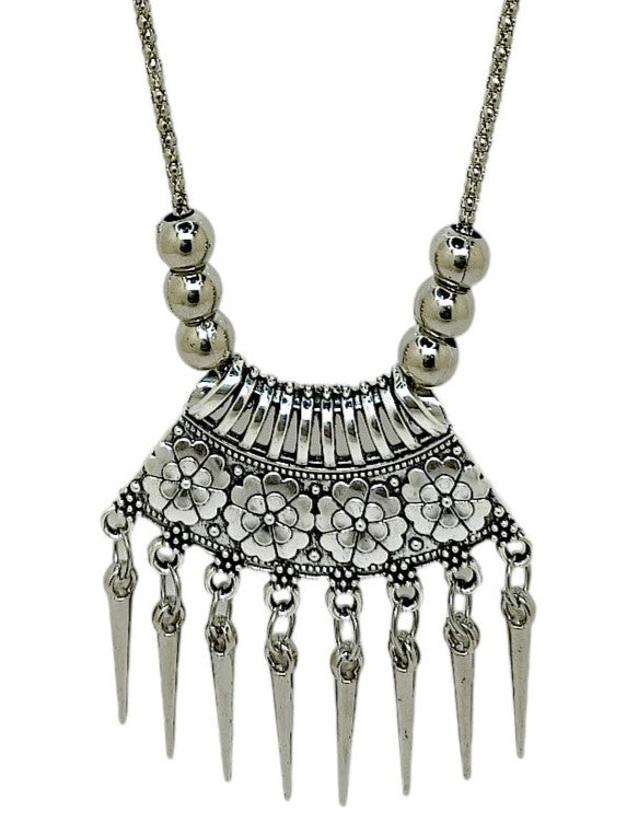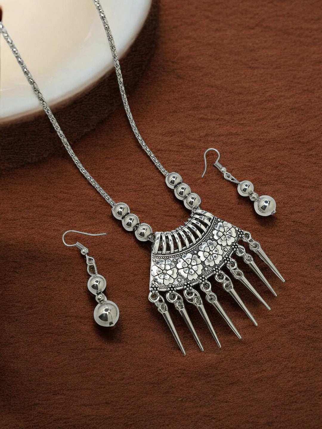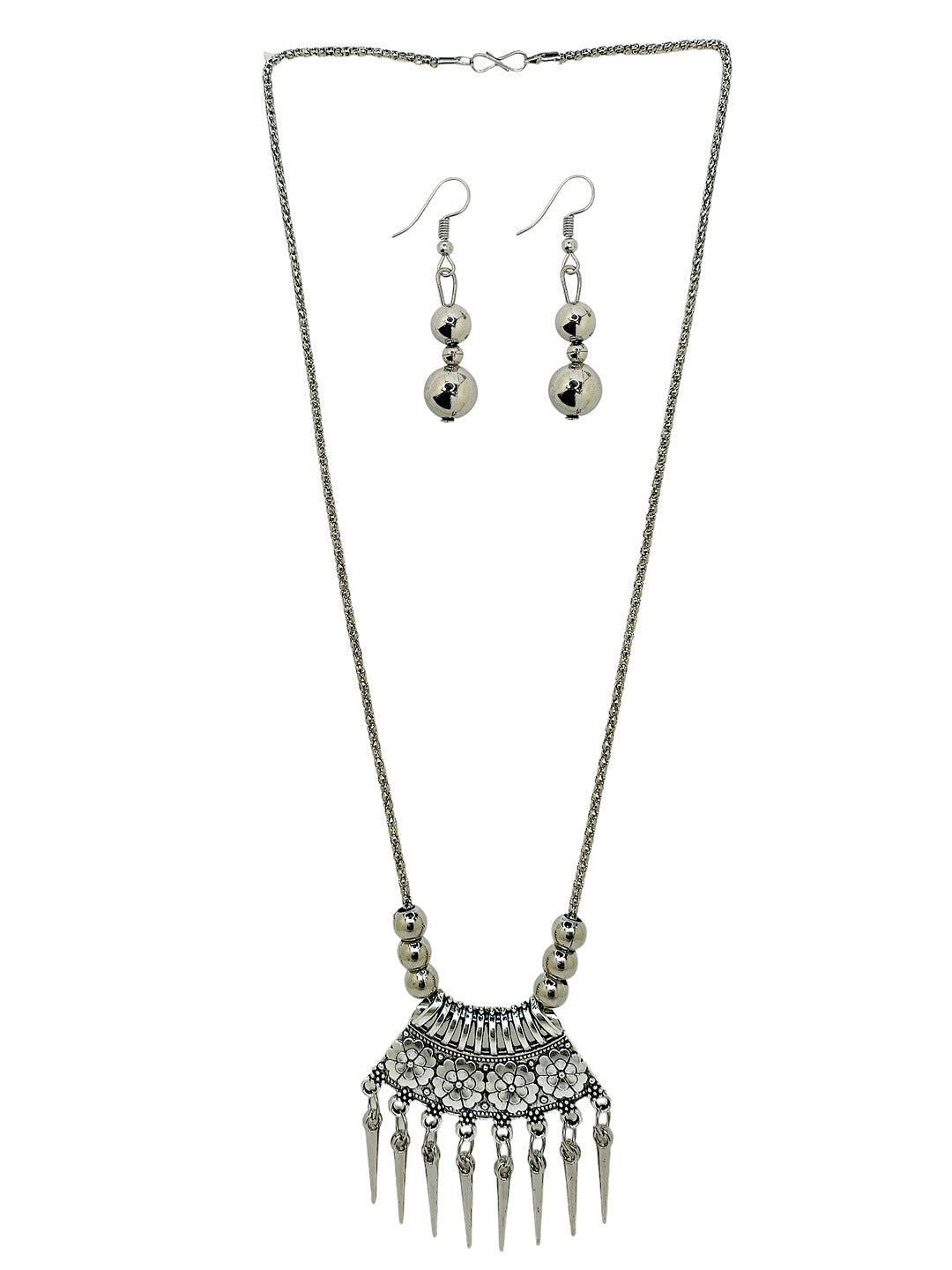 Silver-Toned Oxidised Long Necklace, Secured With S-Hook Closure. A Matching Earring Secured With Fish Closure