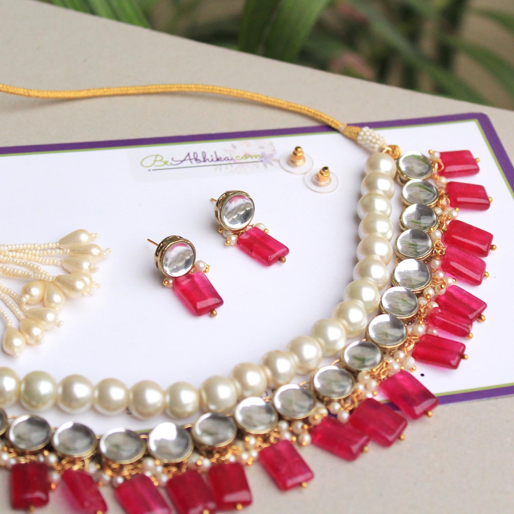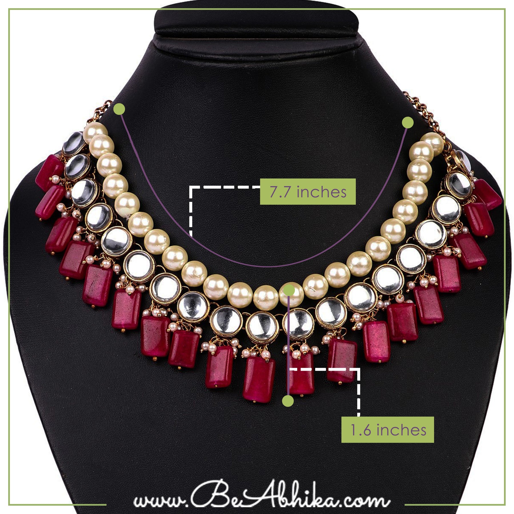This Necklace With Contemporary Styling Of Traditional Elements Like Kundans, Pearls And Semi Precious Stones Will Look Absolutely Stunning With Any Kind Of Outfit/Color. If You Want Something Exquisite And Contemporary But Also Want To Keep The Traditional Feel Alive, Choose This Pair Of Kundan And Stone Necklace.