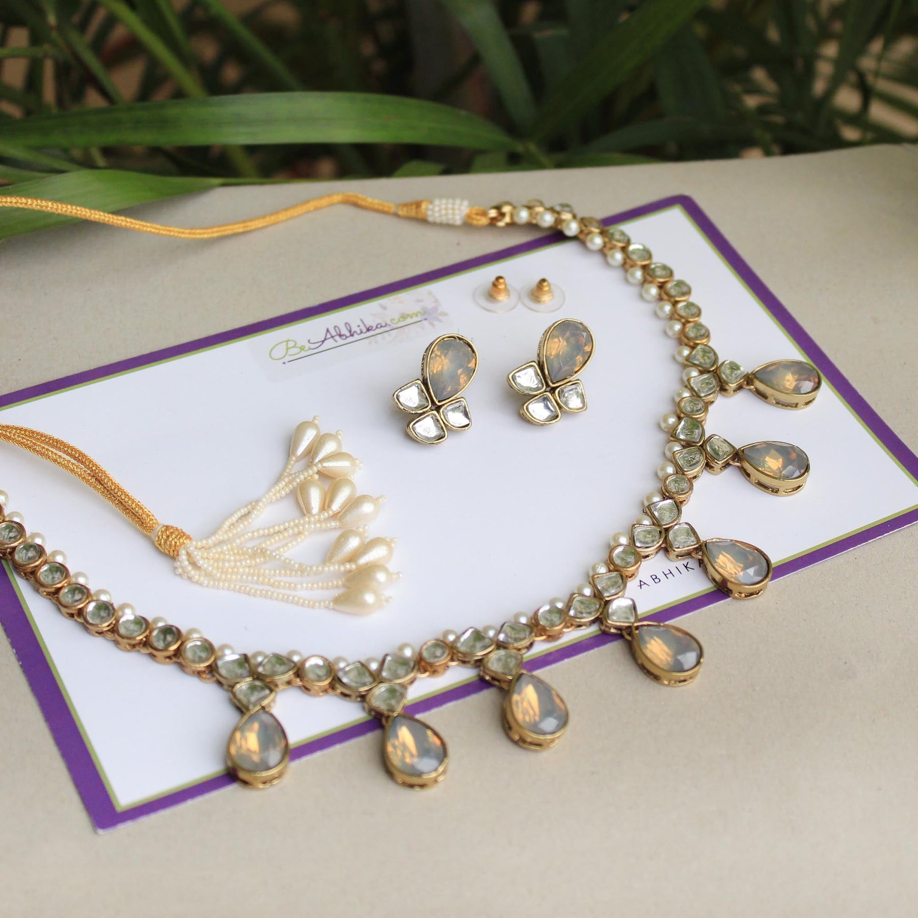 Pastels Are The Color Of The Season And What'S Better Than Mixing Traditional And Contemporary..Nothing! This Necklace Is Amalgamation Of Very Modern Slate Grey Colored Crystals With Ethnic And Forever Classic Kundans. Adorned Further With Tiny White Pearls The Neckline Gives Off A Very Fresh Vibe.