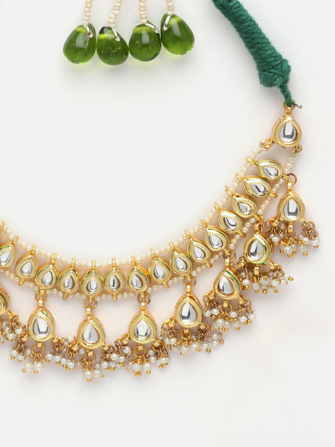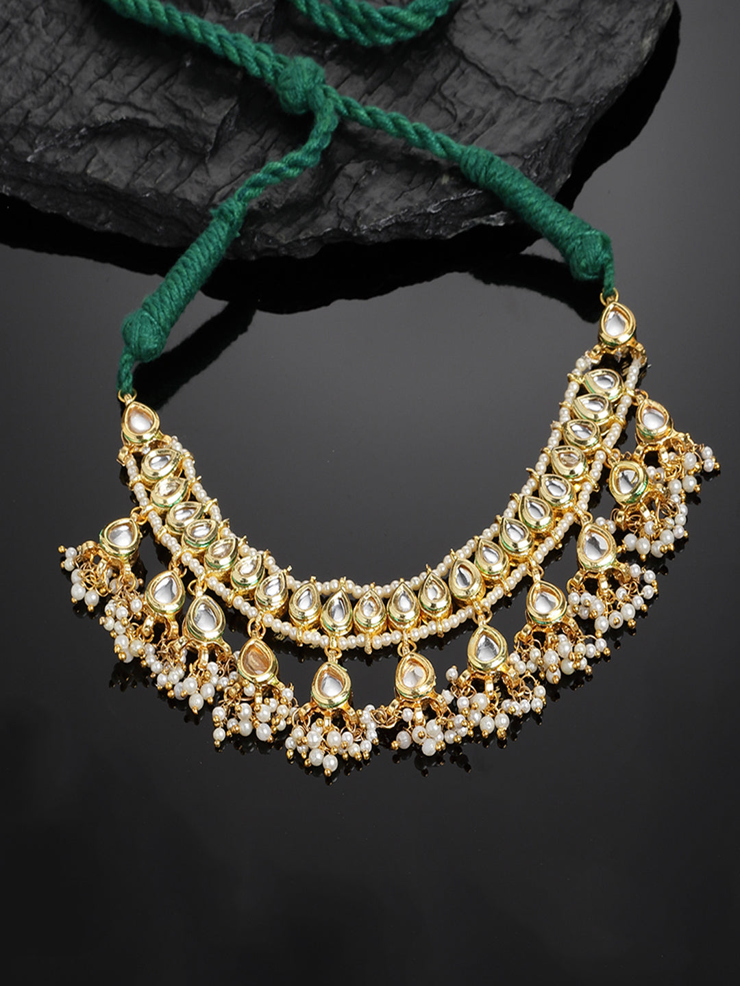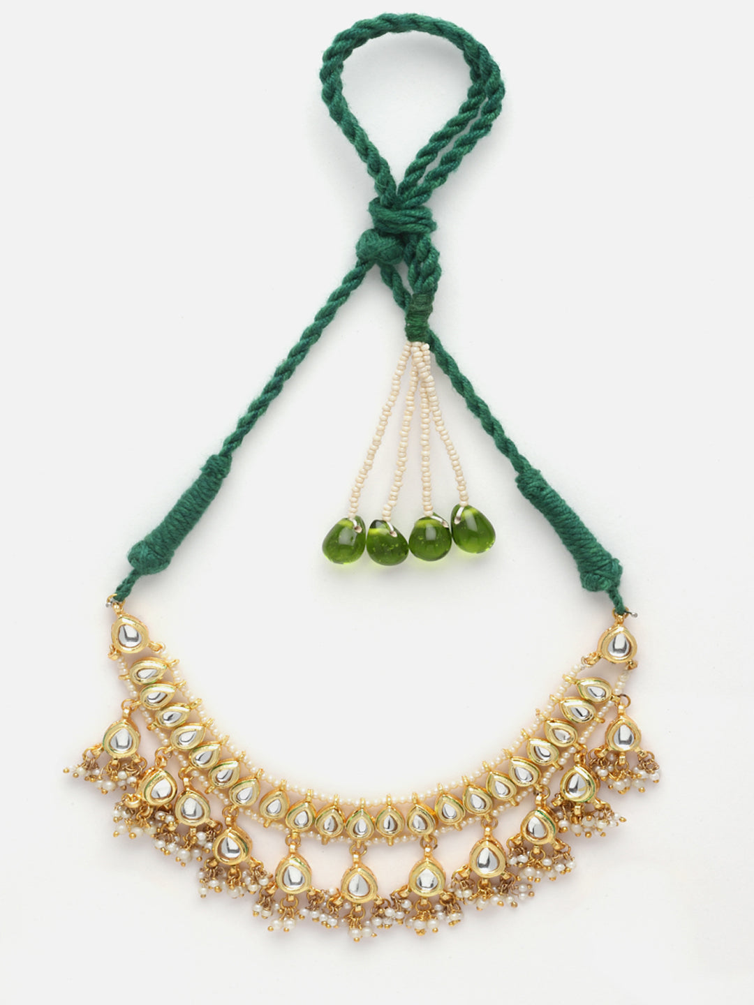 Kundandrop Eck Line; Category Of Jewellery Is Necklace; Sub Category Is Chokar; Ideal For Women; Color Is Green, Gold, White; Gemstones Used - Kundan, Pearls, Natural Stones; Plating Is Gold-Plated; Base Metal Is Alloy; Other Material Used - Adjustable Dori; Size Is Freesize; Adjustable - Yes; Weight Is 69 Gms; Mesaurements - Length Of Necklace =53 Cm; Width Of Necklace = 4.2 Cm; Adjustable - Yes; Content 1 Necklace