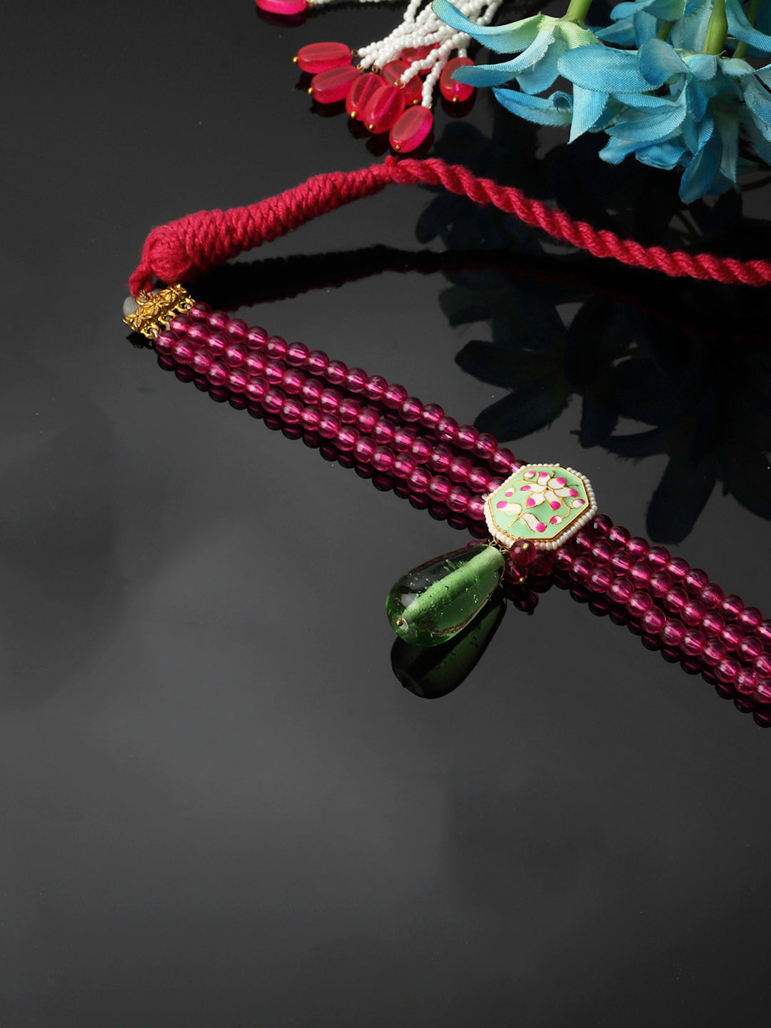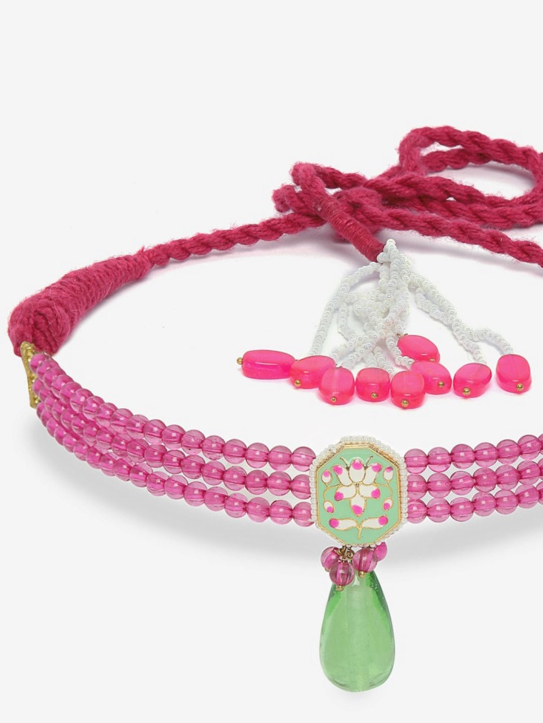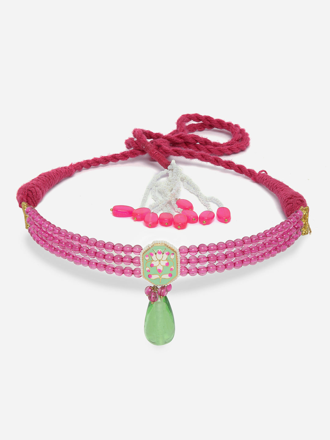 Meenakari And Handmade Dori Latkan Chokar Elegant And Smart Wear; Category Of Jewellery Is Necklace; Sub Category Is Chokar; Ideal For Women; Color Is Pink, Green, White, Gold; Gemstones Used - Pearls, Natural Stones; Plating Is Gold-Plated; Base Metal Is Alloy; Other Material Used - Adjustable Dori; Size Is Freesize; Adjustable - Yes; Weight Is 26 Gms; Mesaurements - Length Of Necklace =42 Cm; Width Of Necklace = 3 Cm; Adjustable - Yes; Content 1 Necklace