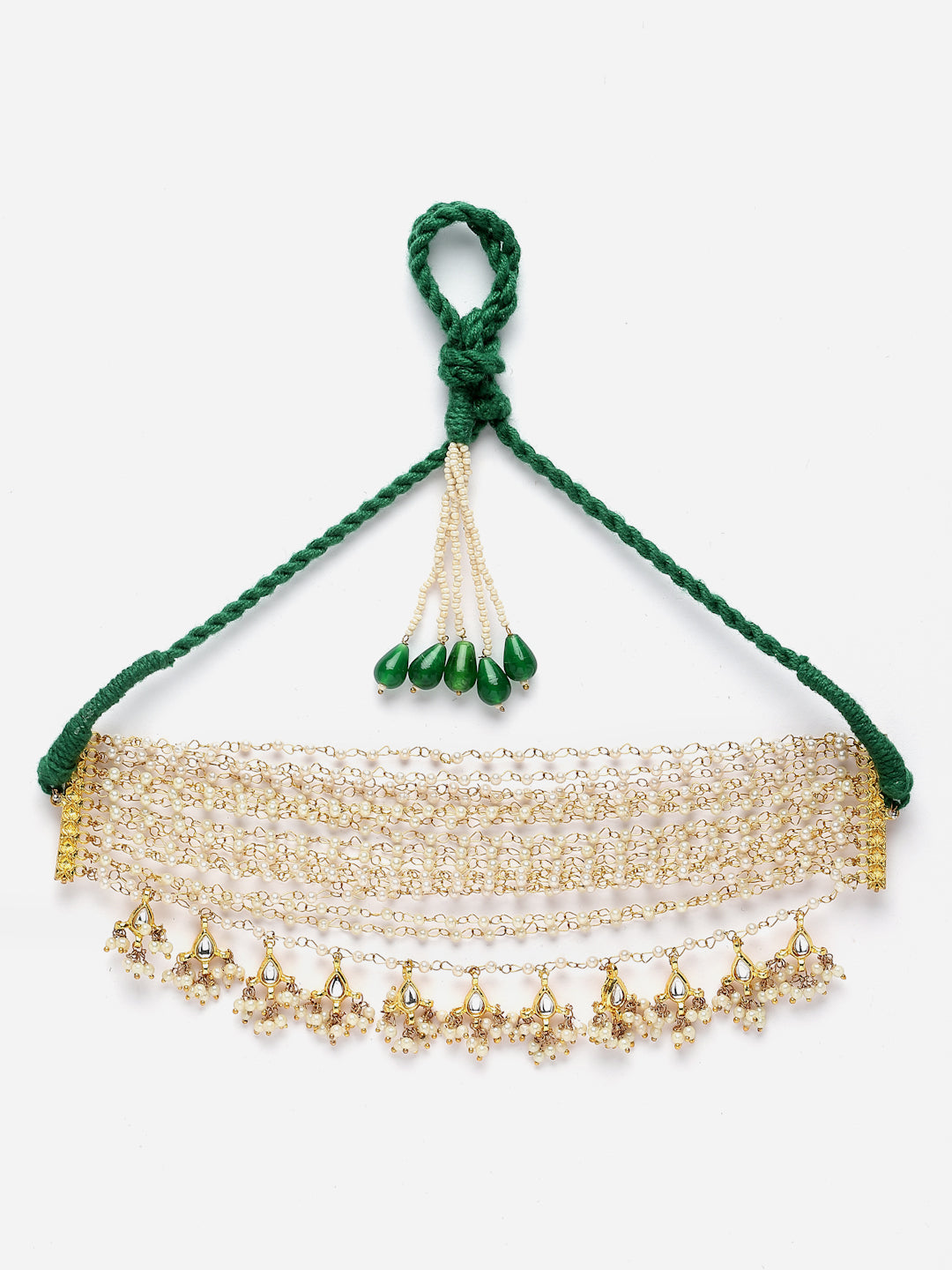 Pearl Looped Chokasr With Handmade Dori; Category Of Jewellery Is Necklace; Sub Category Is Chokar; Ideal For Women; Color Is Green, Peach, Purple, Gold, Cream, White; Gemstones Used - Kundan, Pearls, Natural Stones; Plating Is Gold-Plated; Base Metal Is Alloy; Other Material Used - Adjustable Dori; Size Is Freesize; Adjustable - Yes; Weight Is 50 Gms; Mesaurements - Length Of Necklace =48 Cm; Width Of Necklace = 21 Cm; Adjustable - Yes; Content 1 Necklace
