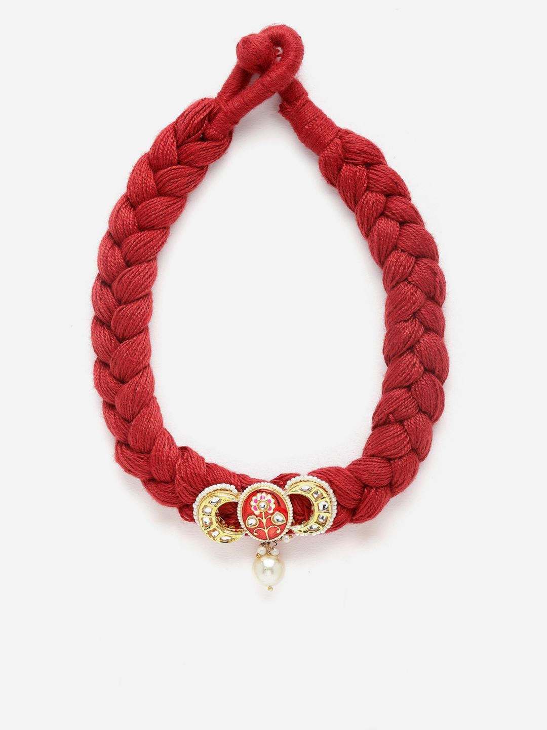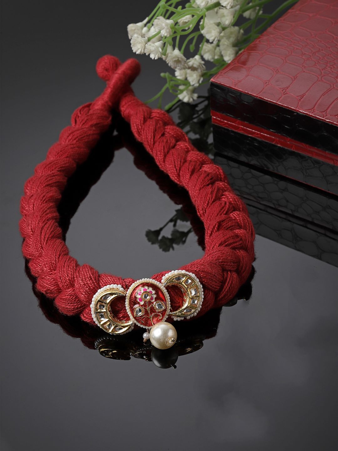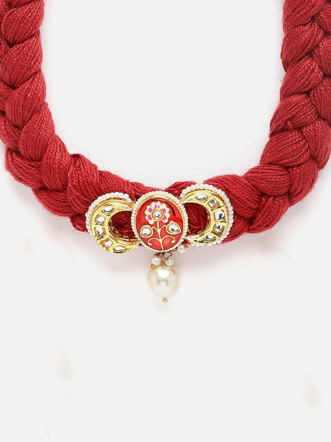 Red Hanging Kundan With Red Chokar Neck Pc; Category Of Jewellery Is Necklace; Sub Category Is Chokar; Ideal For Women; Color Is Red, Gold, Pink, Cream, White; Gemstones Used - Kundan, Pearls, Natural Stones; Plating Is Gold-Plated; Base Metal Is Alloy; Other Material Used - Thread; Size Is Freesize; Adjustable - No; Weight Is 40 Gms; Mesaurements - Length Of Necklace =48 Cm; Width Of Necklace = 3 Cm; Adjustable - No; Content 1 Necklace