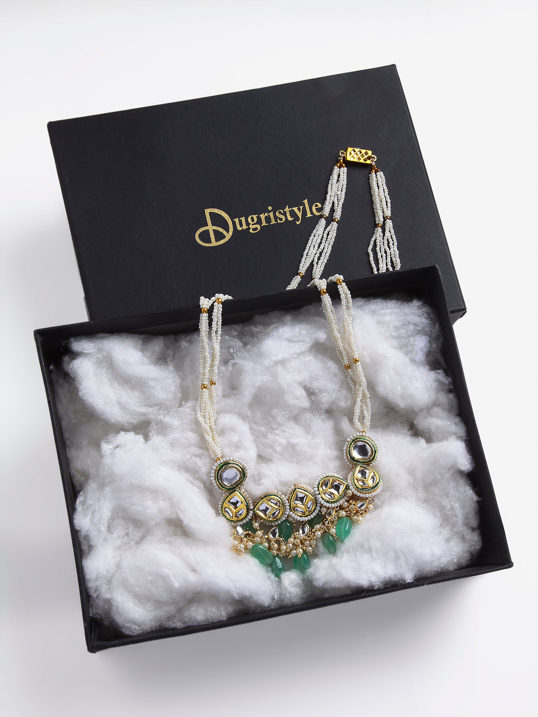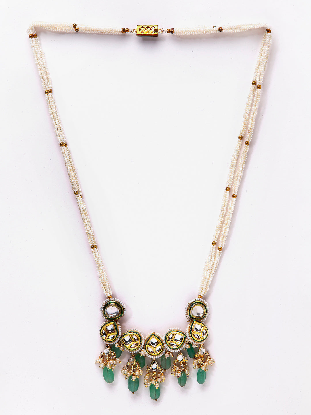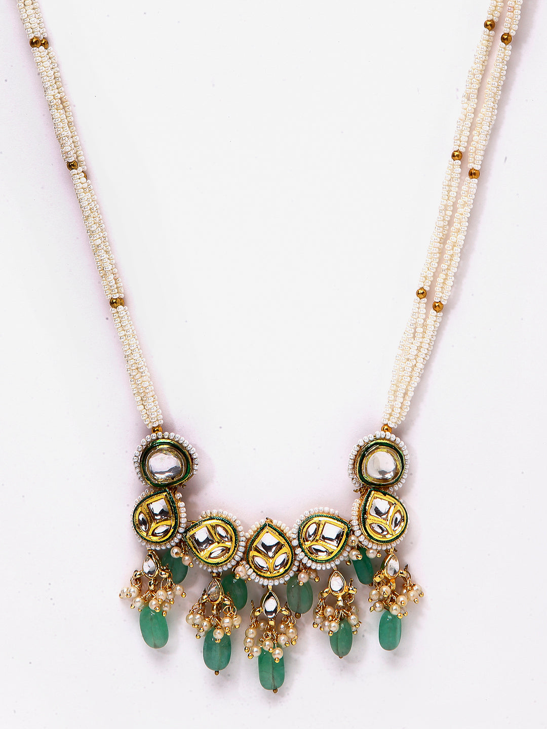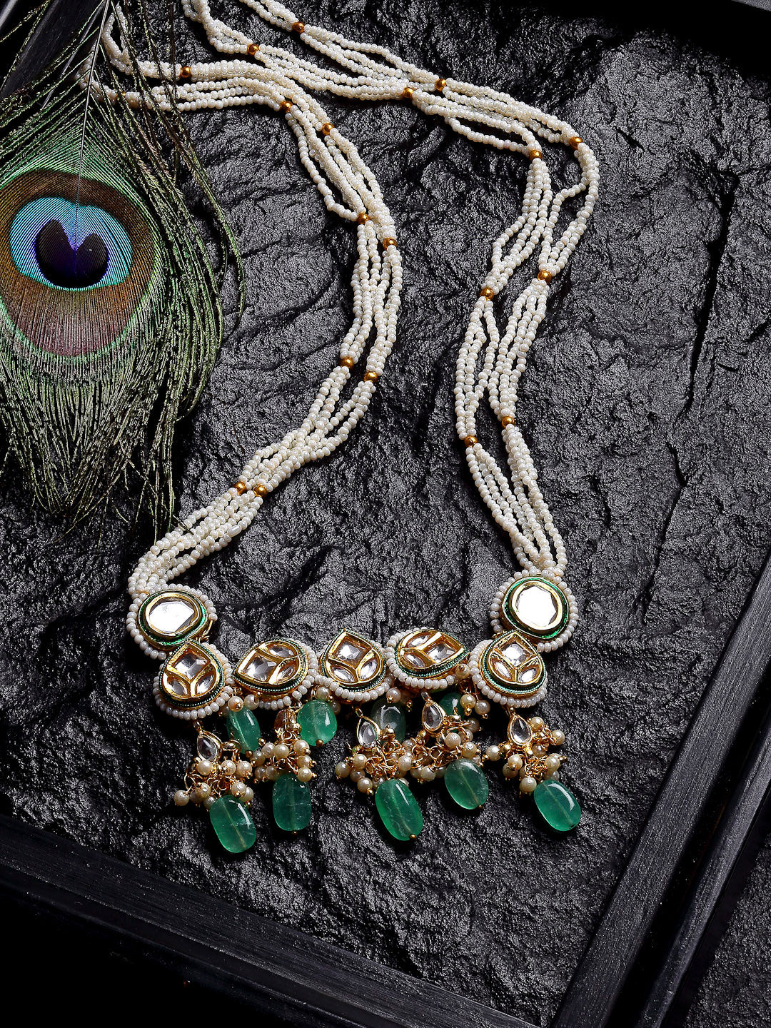 Green & White Haar Necklace With Kundan & Pearls; Category Of Jewellery Is Necklace; Sub Category Is Haar; Ideal For Women; Color Is Green, White, Gold; Gemstones Used - Kundan, Pearls, Natural Stones, Faux Emerald; Plating Is Gold-Plated; Base Metal Is Alloy; Other Material Used - None; Size Is Freesize; Adjustable - No; Weight Is 57 Gms; Mesaurements - Length Of Necklace =66 Cm; Width Of Necklace = 4 Cm; Adjustable - No; Content 1 Necklace