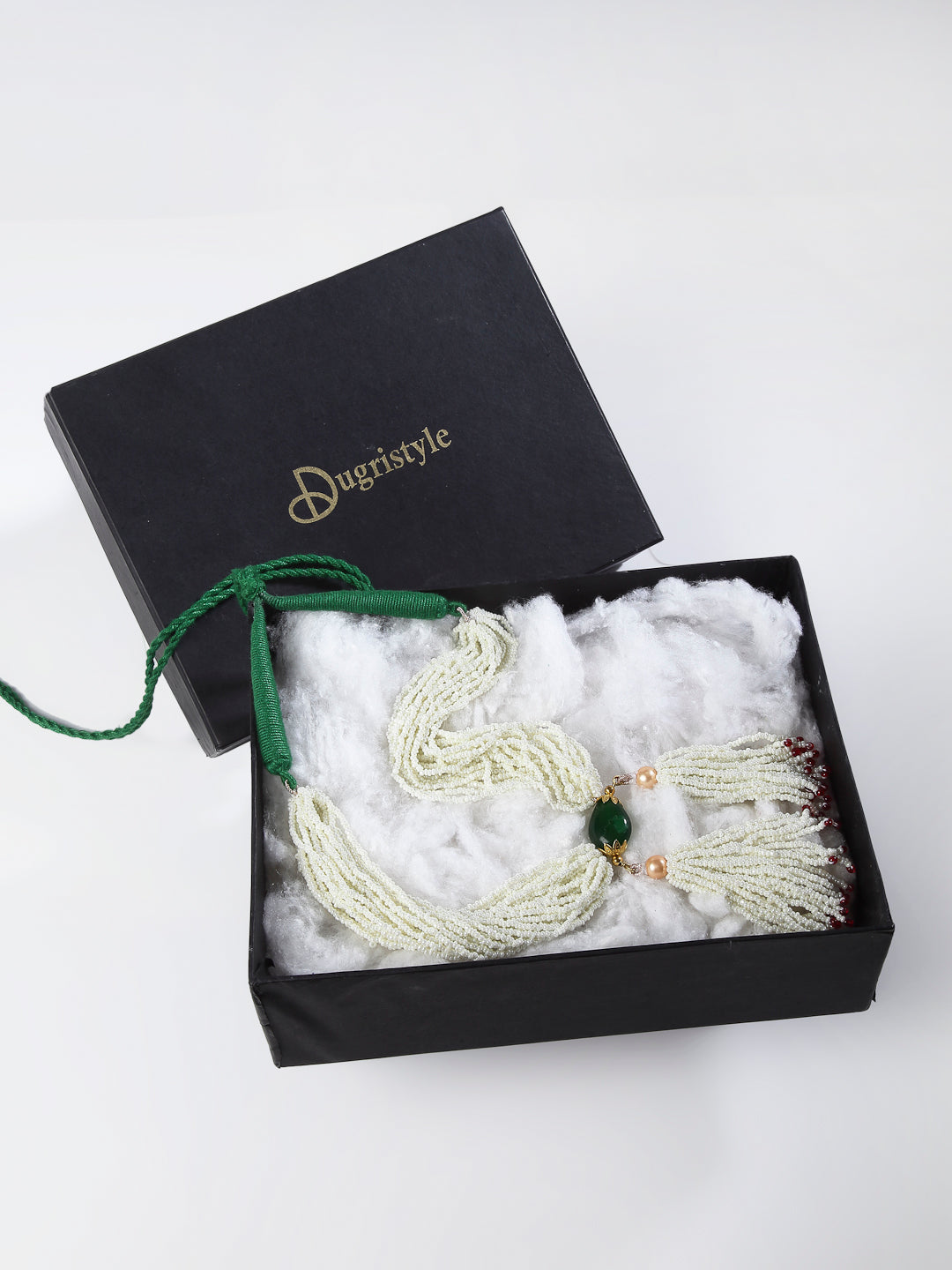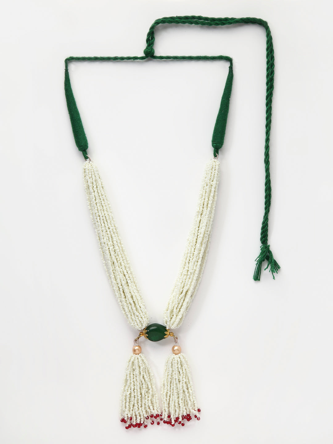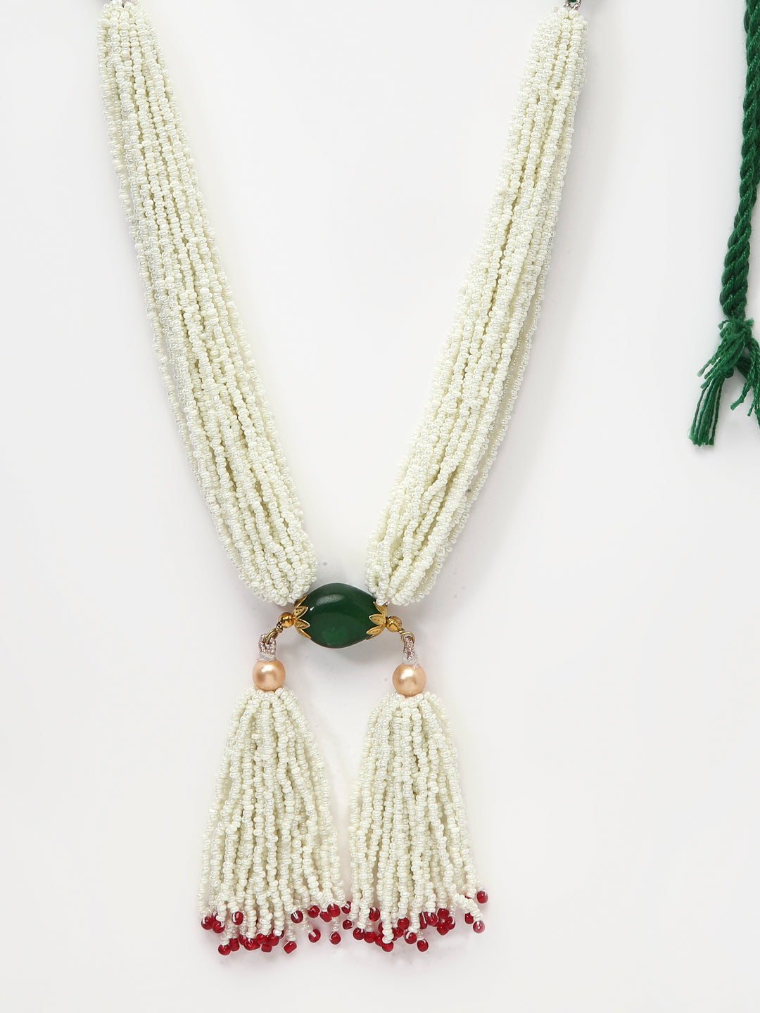 Green And White All Along With Pearls Is What Makes This More Extravanza Jewel Pc, All You Need Is To Style It With Your Open Hair And Amile. Let It Work Its Magic In Any Of Your Outfit And Steal The Magic Of Any Event For You.; Category Of Jewellery Is Necklace; Sub Category Is Haar; Ideal For Women; Color Is Green, White, Gold, Red; Gemstones Used - Pearls, Natural Stones, Faux Emerald; Plating Is Gold-Plated; Base Metal Is Alloy; Other Material Used - Adjustable Dori; Size Is Freesize; Adjustable - Yes; Weight Is 91 Gms; Mesaurements - Length Of Necklace =55 Cm; Width Of Necklace = 6.5 Cm; Adjustable - No; Content 1 Necklace