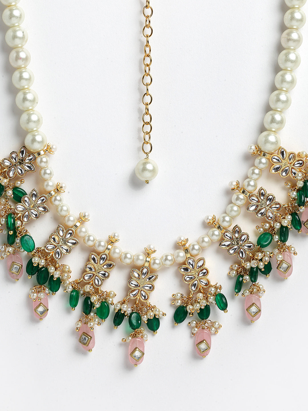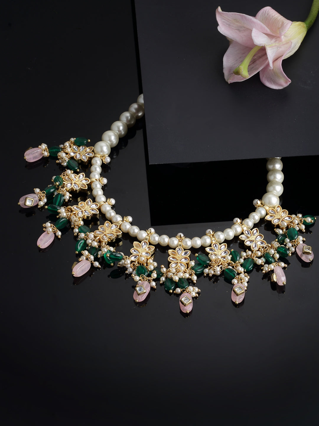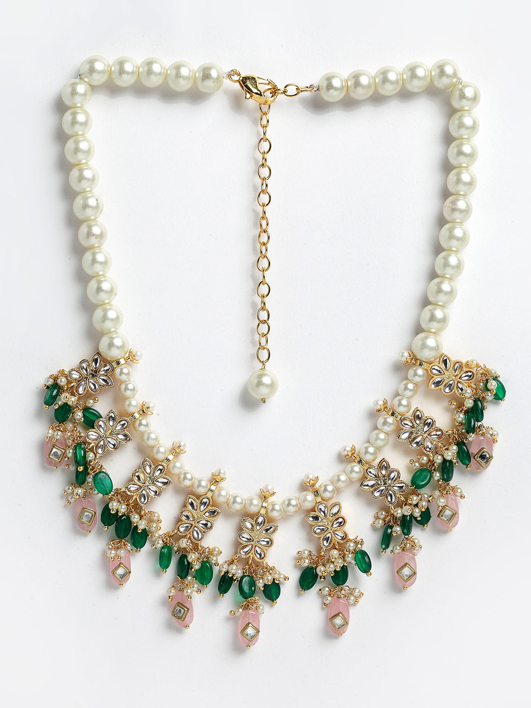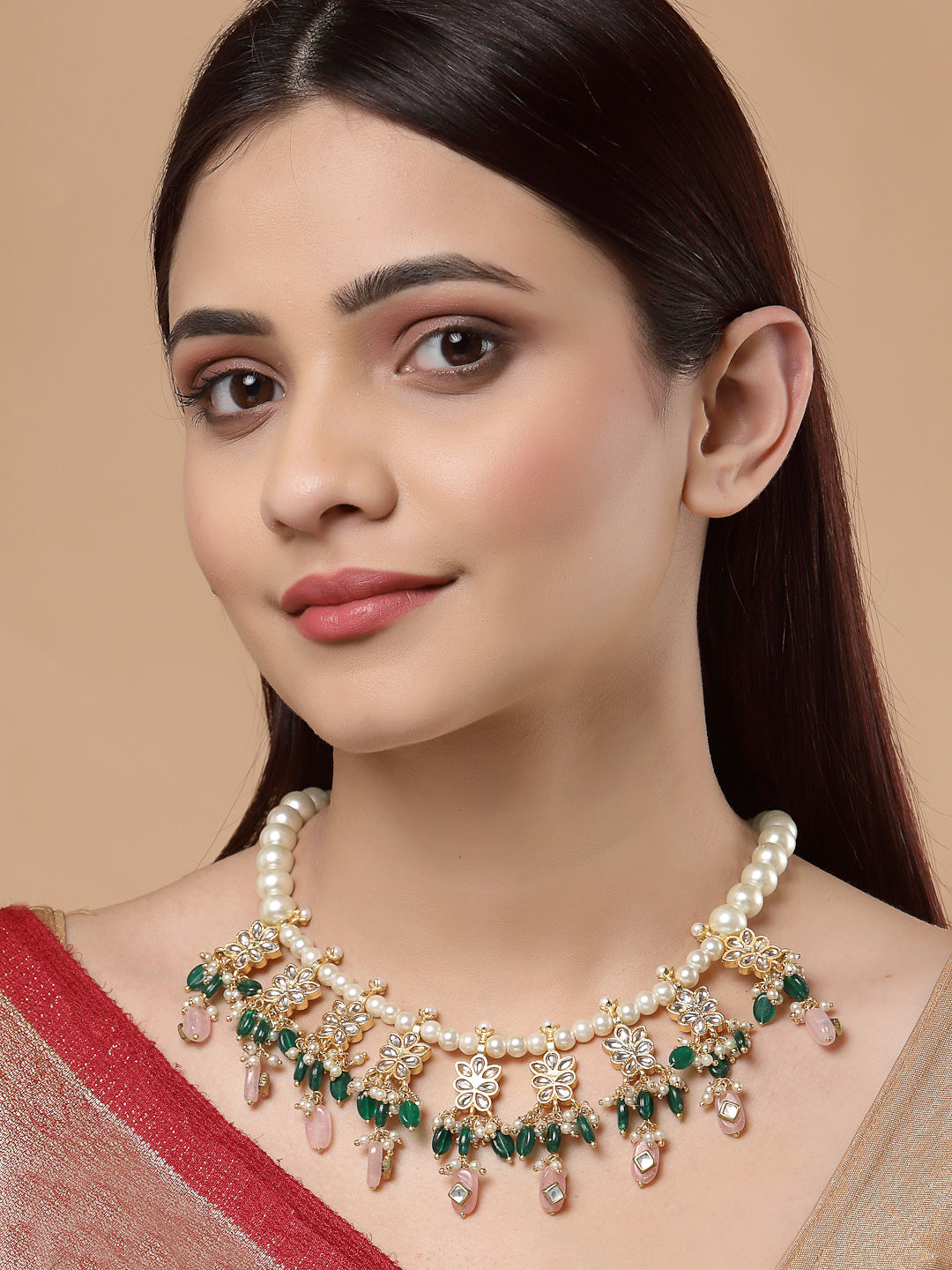 Traditional Handcrafted Pink Sapphirew Along With Emerlad Tinch With Pearls Of Kundan And Smart Necklace Ia All We Need To Flaunt This Season Of Love.; Category Of Jewellery Is Necklace; Sub Category Is Haar; Ideal For Women; Color Is Green, Pink, White, Gold; Gemstones Used - Pearls, Natural Stones, Faux Emerald; Plating Is Gold-Plated; Base Metal Is Alloy; Other Material Used - Adjustable Chain; Size Is Freesize; Adjustable - Yes; Weight Is 100 Gms; Mesaurements - Length Of Necklace =58 Cm; Width Of Necklace = 4 Cm; Adjustable - Yes; Content 1 Necklace