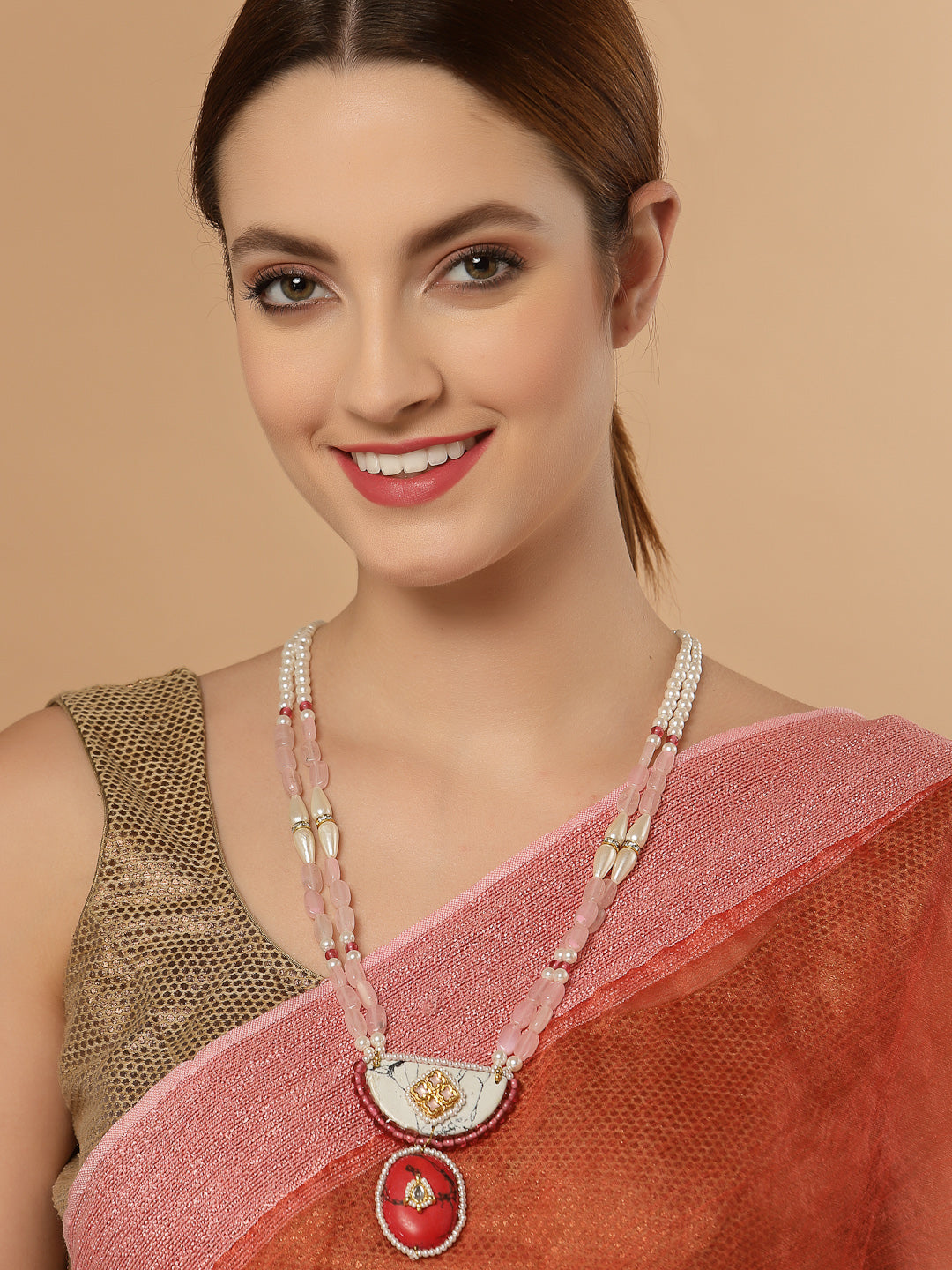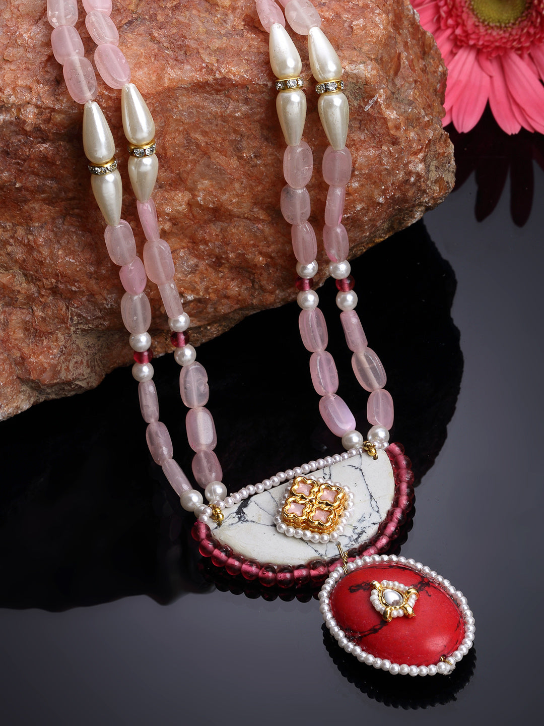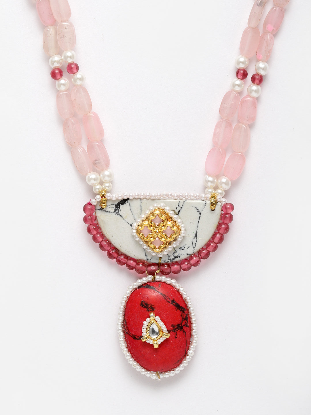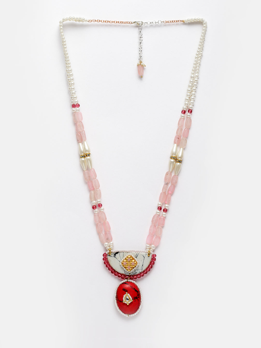Super Light And Elegant Neck For Everyday Look; Category Of Jewellery Is Necklace; Sub Category Is Haar; Ideal For Women; Color Is Red, Pink, Gold, White; Gemstones Used - Kundan, Pearls, Natural Stones; Plating Is Gold-Plated; Base Metal Is Alloy; Other Material Used - Adjustable Chain; Size Is Freesize; Adjustable - Yes; Weight Is 66 Gms; Mesaurements - Length Of Necklace =42 Cm; Width Of Necklace = 6.1 Cm; Adjustable - Yes; Content 1 Necklace