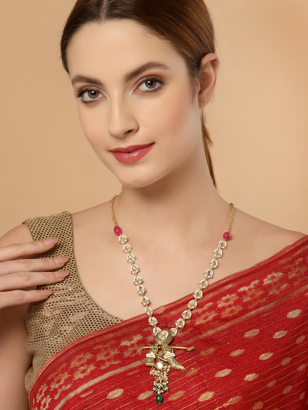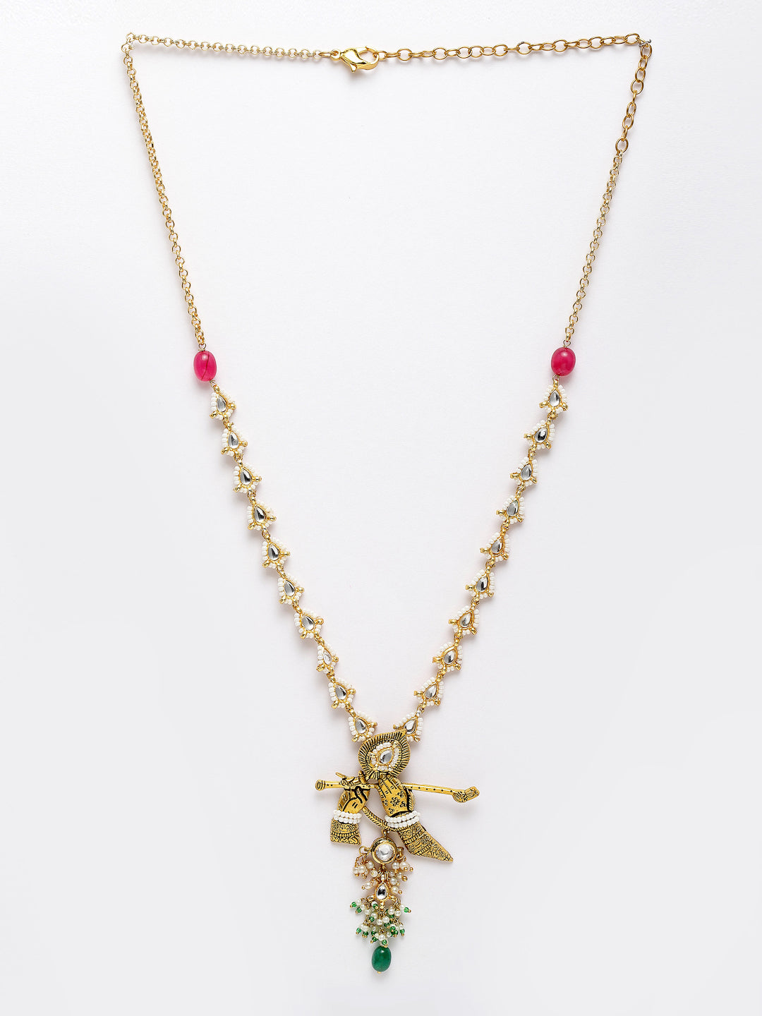Super Light And Elegant Neck For Everyday Look; Category Of Jewellery Is Necklace; Sub Category Is Haar; Ideal For Women; Color Is Green, Gold, Pink, White; Gemstones Used - Kundan, Pearls, Natural Stones; Plating Is Gold-Plated; Base Metal Is Alloy; Other Material Used - Adjustable Chain; Size Is Freesize; Adjustable - Yes; Weight Is 39 Gms; Mesaurements - Length Of Necklace =45.2 Cm; Width Of Necklace = 4.7 Cm; Adjustable - Yes; Content 1 Necklace