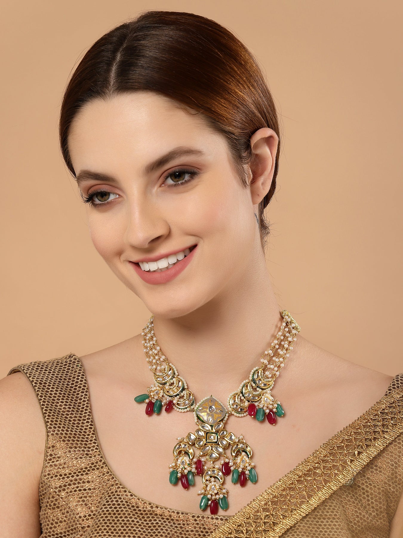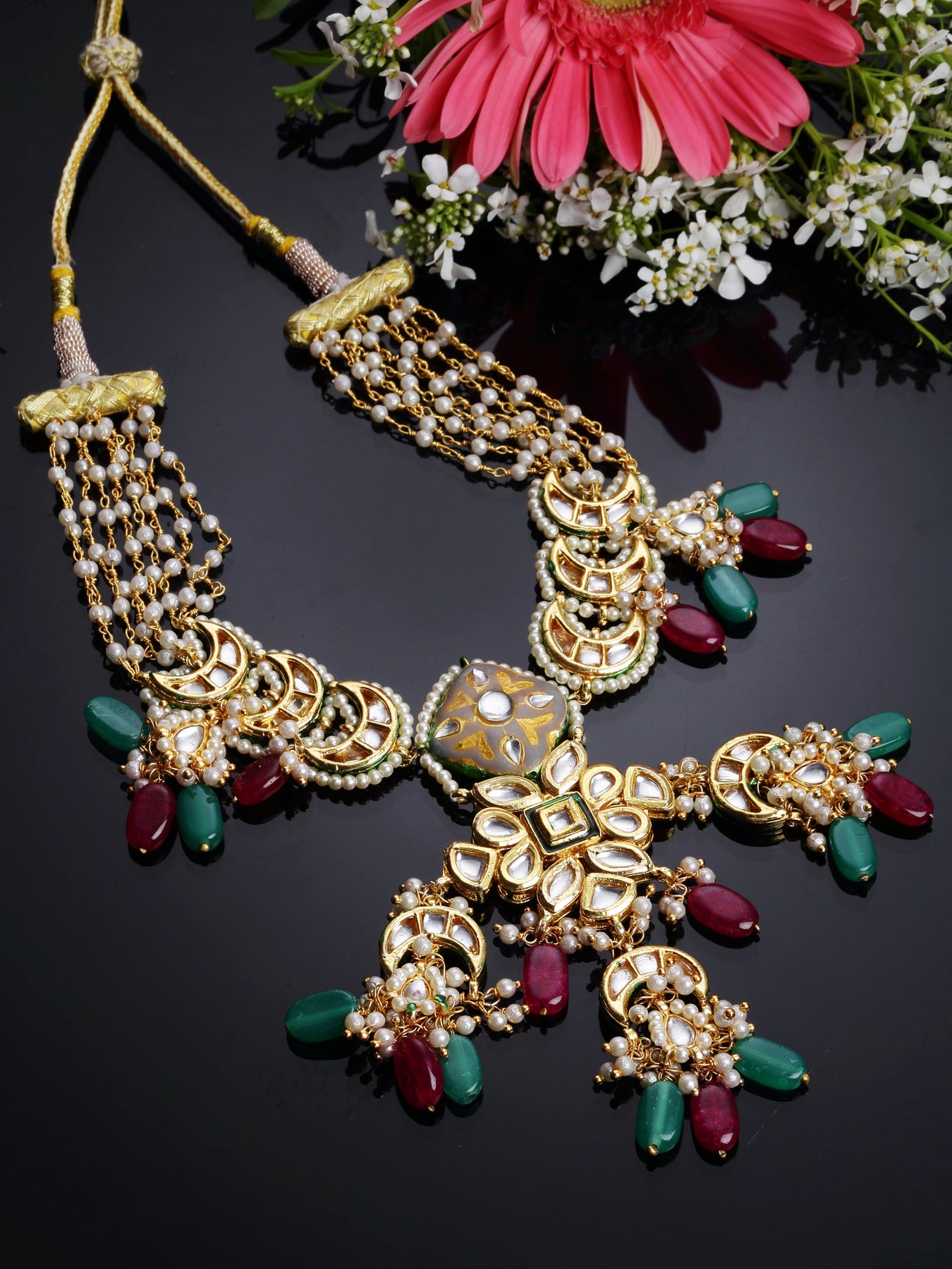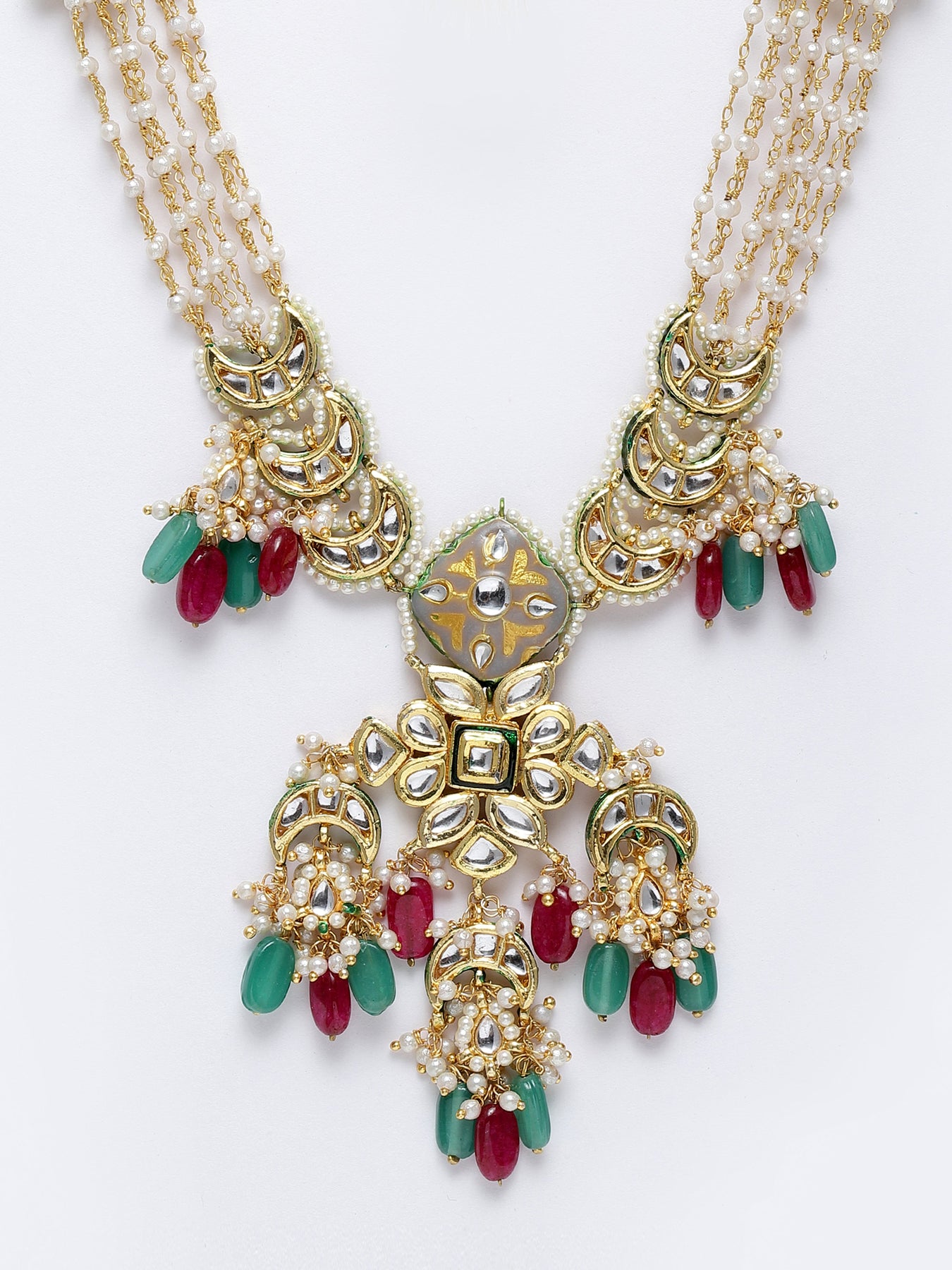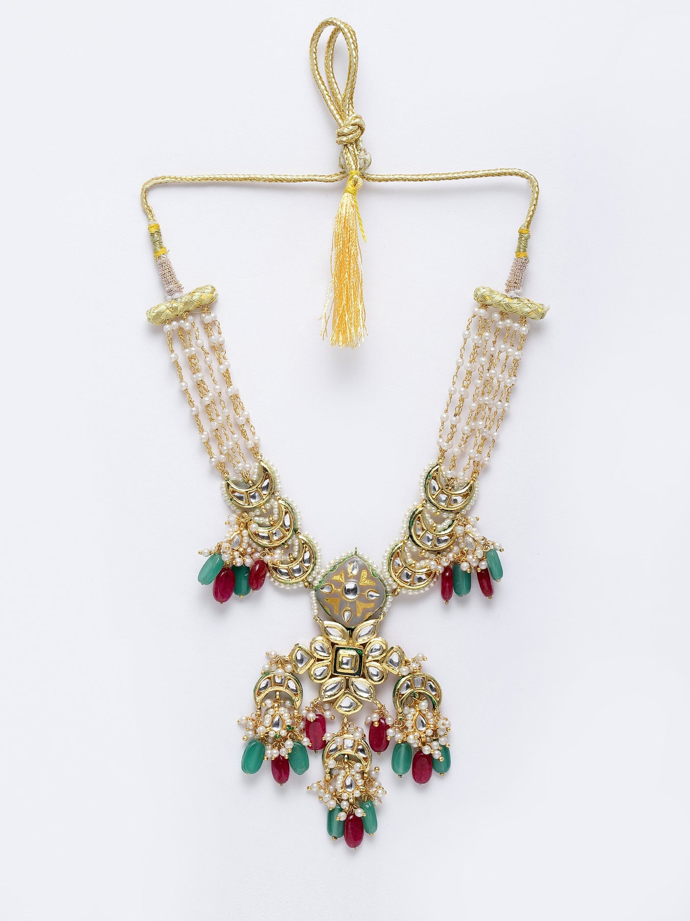 Love For Kundan Yet Artistic Pc If Soeone Looking For... Style It With Any Draped Pc To Give U Enhanced Look Of All Times. Be Ready For Any Occasion... Be It Evenings Or A Party Or A Sunday Brunch.; Category Of Jewellery Is Necklace; Sub Category Is Haar; Ideal For Women; Color Is Green, Red, Grey, Gold, White; Gemstones Used - Kundan, Pearls, Natural Stones; Plating Is Gold-Plated; Base Metal Is Alloy; Other Material Used - Adjustable Dori; Size Is Freesize; Adjustable - Yes; Weight Is 75 Gms; Mesaurements - Length Of Necklace =43 Cm; Width Of Necklace = 11 Cm; Adjustable - Yes; Content 1 Necklace