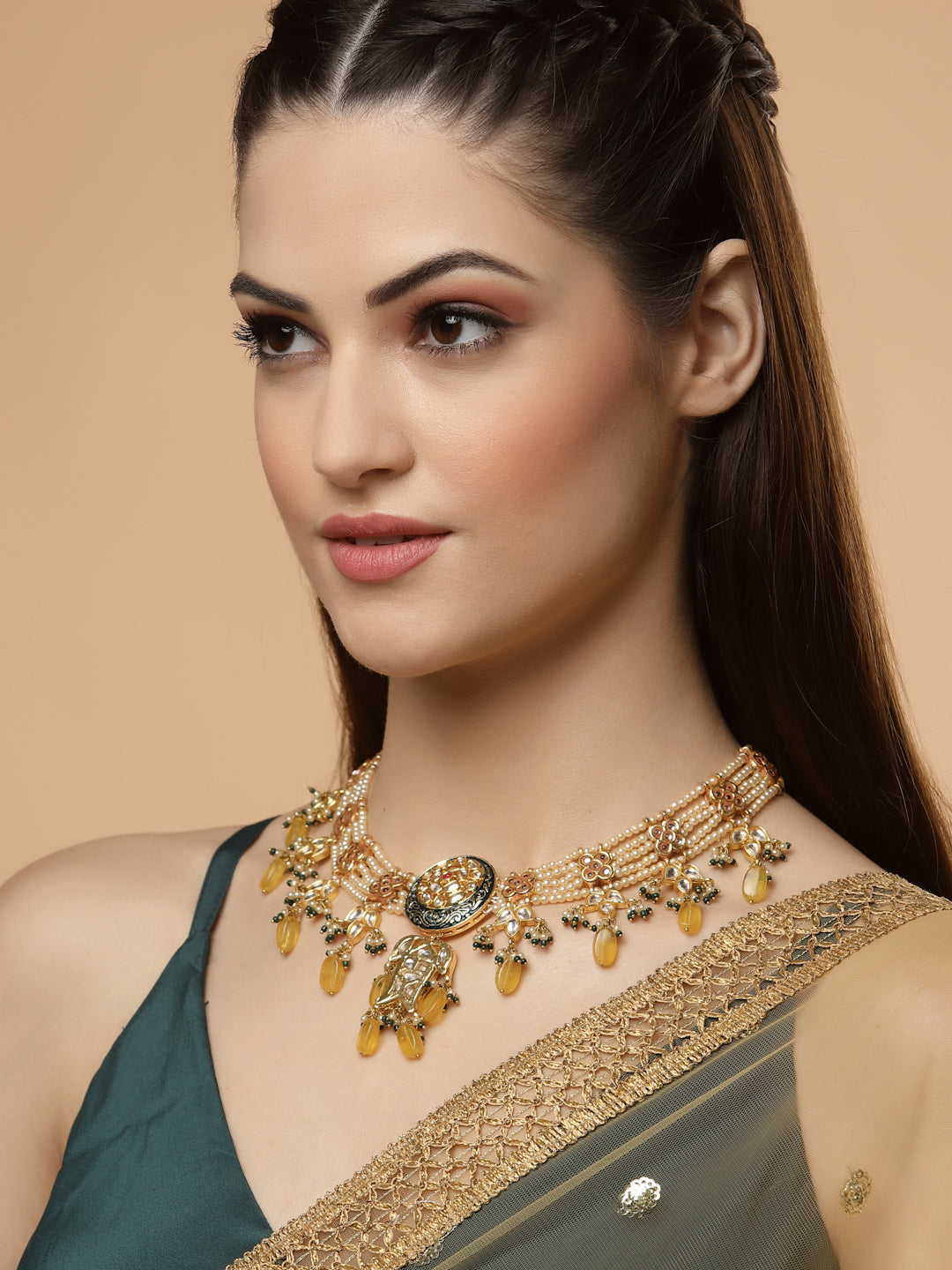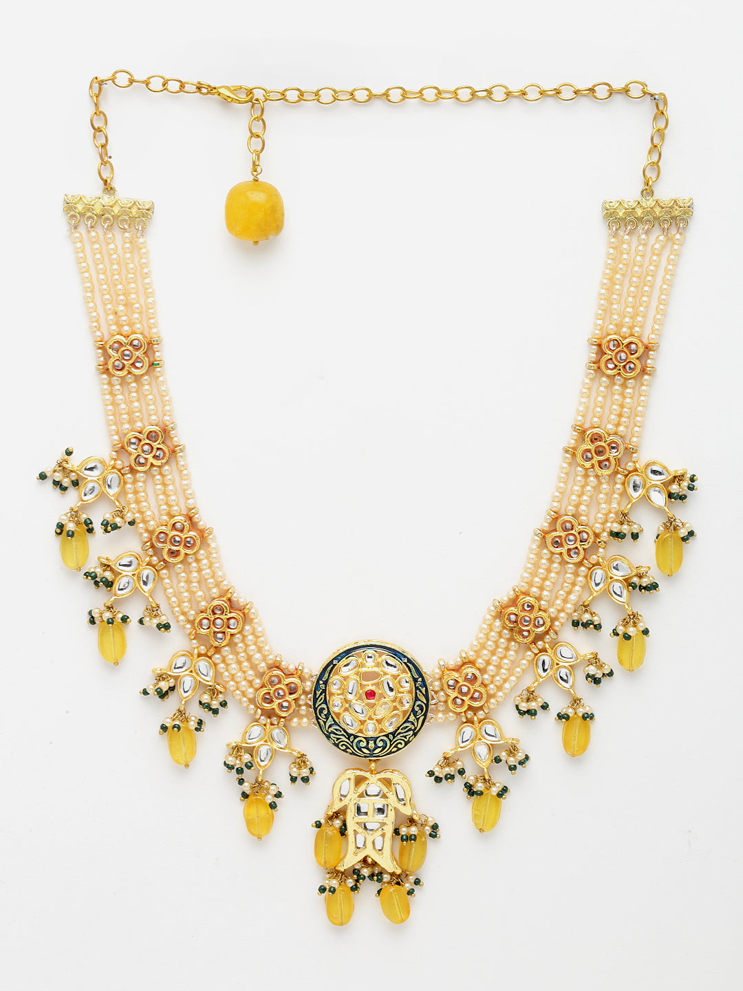 Handcarfted Kundan Neck Pc With Handmade Looped Pearls With Yellow Sapphire And Seas Shell Pearls Is The Unique Point Of This Neck Pc.. Stylish Yet Classy Is The Keyword For This Neck Pc; Category Of Jewellery Is Necklace; Sub Category Is Haar; Ideal For Women; Color Is Yellow, Blue, Gold, White; Gemstones Used - Kundan, Pearls, Natural Stones; Plating Is Gold-Plated; Base Metal Is Alloy; Other Material Used - Adjustable Chain; Size Is Freesize; Adjustable - Yes; Weight Is 76 Gms; Mesaurements - Length Of Necklace =48 Cm; Width Of Necklace = 4.1 Cm; Adjustable - Yes; Content 1 Necklace