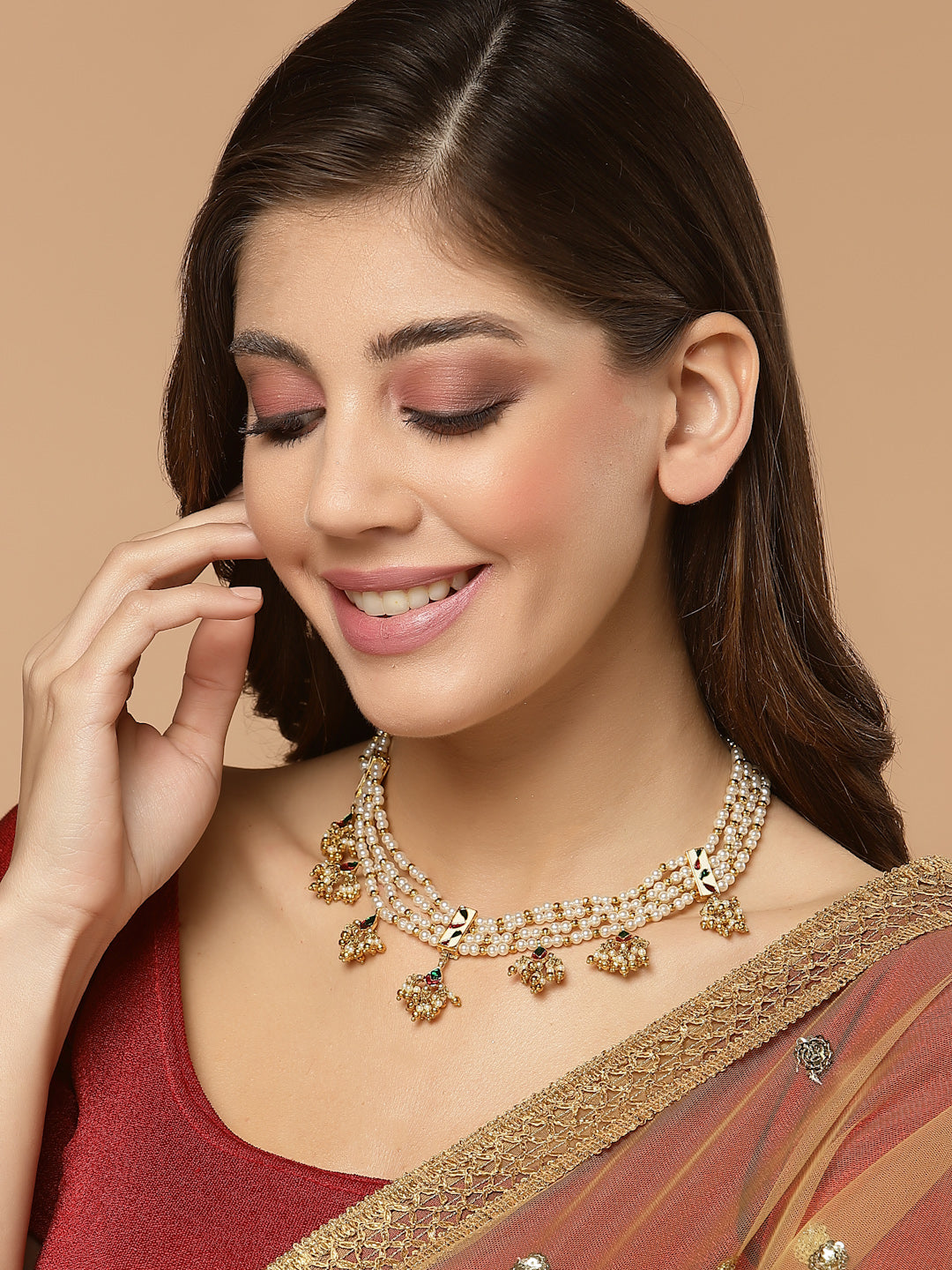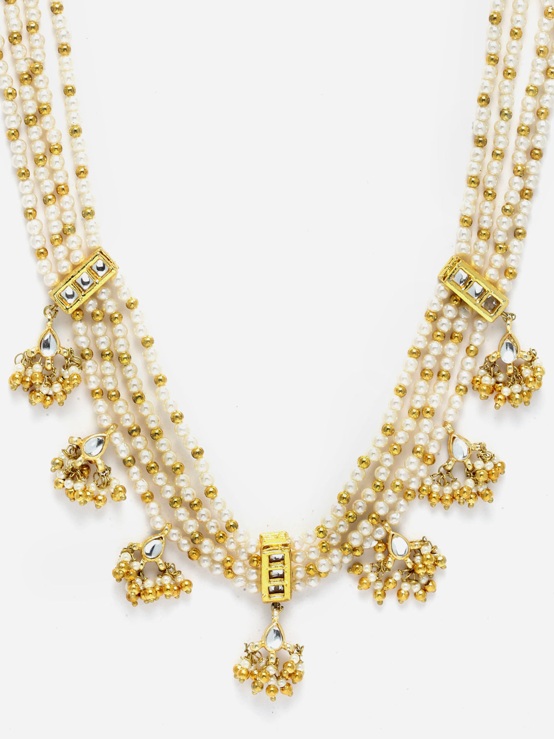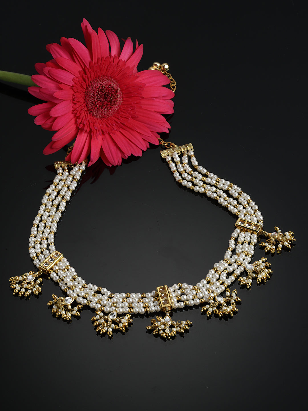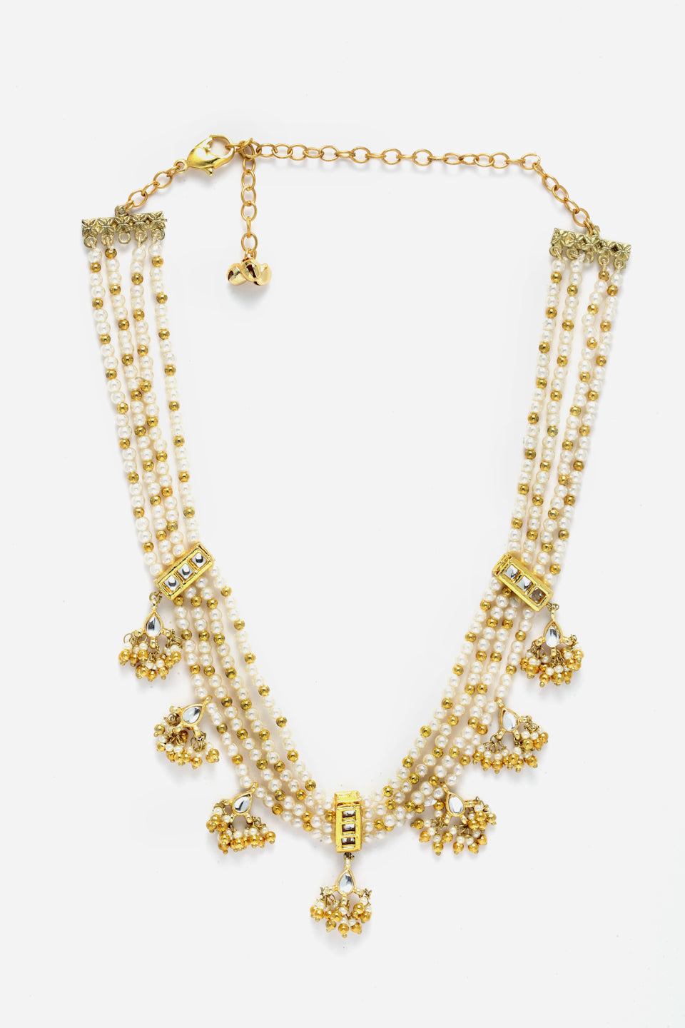 Neck Pc With Classic Combo Of Gold And White With Kanthi Neckline Style Is What Makes This Pc Unique.; Category Of Jewellery Is Necklace; Sub Category Is Haar; Ideal For Women; Color Is Gold, Cream; Gemstones Used - Kundan, Pearls, Natural Stones; Plating Is Gold-Plated; Base Metal Is Alloy; Other Material Used - Adjustable Chain; Size Is Freesize; Adjustable - Yes; Weight Is 43 Gms; Mesaurements - Length Of Necklace =51 Cm; Width Of Necklace = 3.6 Cm; Adjustable - Yes; Content 1 Necklace